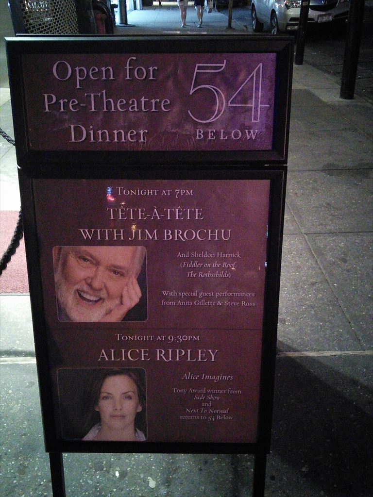 題名:Alice Ripley: Alice Imagines at 54 Below 劇場:54 Below 日時:2014年6月1日21:30-23:00 料金:割引34.75USD(Food & Beverage Minimum: $25) 座席:右寄りステージ前方席 出演: Alice Ripley Alice Imagines with special guests Louis Hobson & Jess Means 客席には空席あり。8割の入り? Next to Normal で感動したので聞きに来ました。最初は ドラムを叩きながらの歌、靴脱いで素足。伴奏はピアノのみ。 カーペンターズから A Song For You, Good Bye To Love 等スタンダードナンバーから始まりました。 Customer に関するポップな歌があって気に入ったのですが、 曲名不明。 レミゼ大好きということで、バリケードで皆が死んでいくと ころを熱演w、それから I Dreamed a Dream, Bring Him Home. Next to Normal から数曲をゲストと共に合唱。 サンジエゴでトライアウトをやっているヘンリーニールセン というミュージカルから数曲披露。 本当にパワフルな歌声でしたよ。 PR