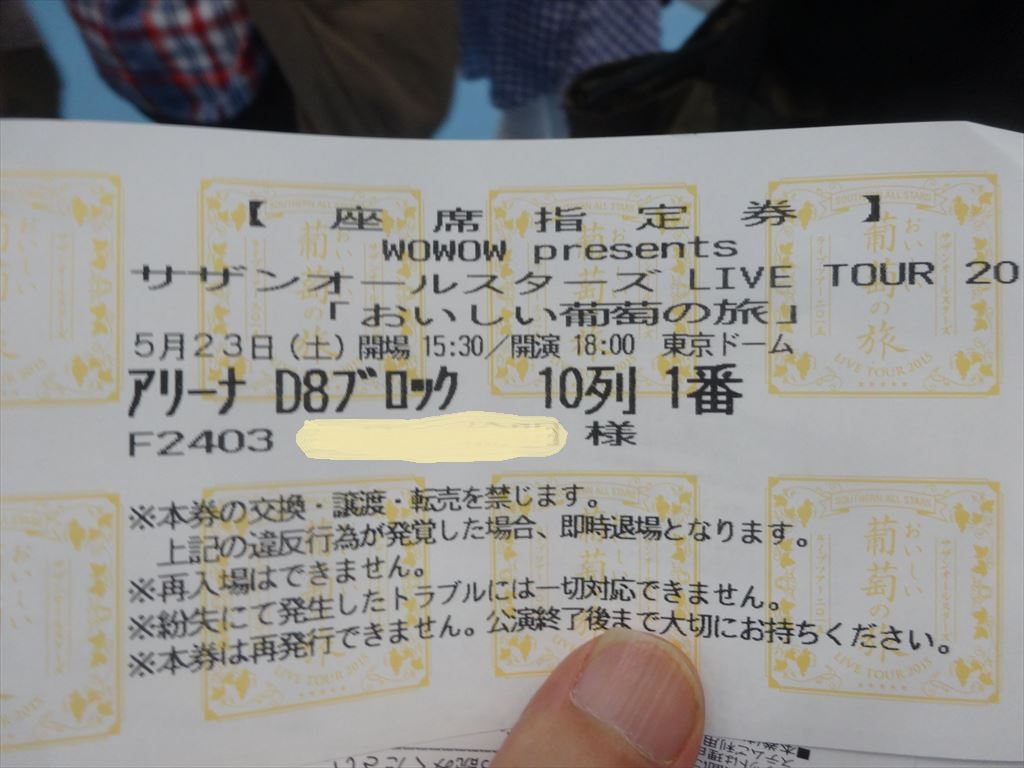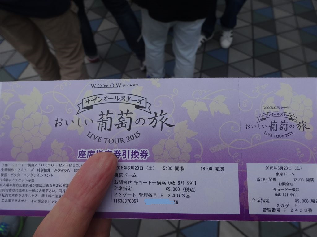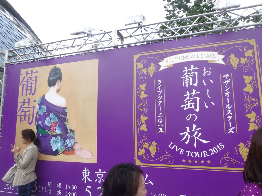題名:サザンオールスターズ LIVE TOUR 2015 「おいしい葡萄の旅」 劇場:東京ドーム 日時:2015年5月23日18:00-21:30 料金:9000円 座席:アリーナD8ブロック 10列1番 サザン初体験。チケットは座席引換券で、入り口で座席券と交換。 なるほどこれならなかなか商売できませんよね。 ステージの奥に巨大画面が5つ。 「美味しい葡萄ライト」が配られてみんな手にはめる。 そしてあるタイミングになると突然光り始める! 色も変わる!!会場全体がそのライトの色に!!金かかってますねえ。 ダンサーも20人はいたでしょうか。巨大ステージに負けずと踊る。 そして3時間半歌いっぱなし!トークなんてない。 歌に物語が充満している、エロと社会がてんこ盛り!! すごい経験でしたよ。また聞きたい。 セットリスト: 1 Tarako 2 ミス・ブランニュー・デイ (MISS BRAND-NEW DAY) 3 青春番外地 4 ロックンロール・スーパーマン~Rock'n Roll Superman~ 5 彼氏になりたくて 6 バラ色の人生 7 Missing Persons 8 平和の鐘が鳴る 9 イヤな事だらけの世の中で 10 はっぴいえんど 11 天井棧敷の怪人 12 ワイングラスに消えた恋 13 よどみ萎え、枯れて舞え 14 顔 15 Happy Birthday 16 死体置場でロマンスを 17 Computer Children 18 栞(しおり)のテーマ 19 あなただけを ~Summer Heartbreak~ 20 真夏の果実 21 おいしいね~傑作物語 22 Soul Bomber(21世紀の精神爆破魔) 23 (The Return of)01MESSENGER ~電子狂の詩~ 24 ブリブリボーダーライン 25 道 26 栄光の男 27 東京VICTORY 28 アロエ 29 マチルダBABY 30 エロティカ・セブン 31 ボディ・スペシャルII 32 マンピーのG★SPOT アンコール 33 匂艶THE NIGHT CLUB 34 ピースとハイライト 35 みんなのうた 36 蛍 PR