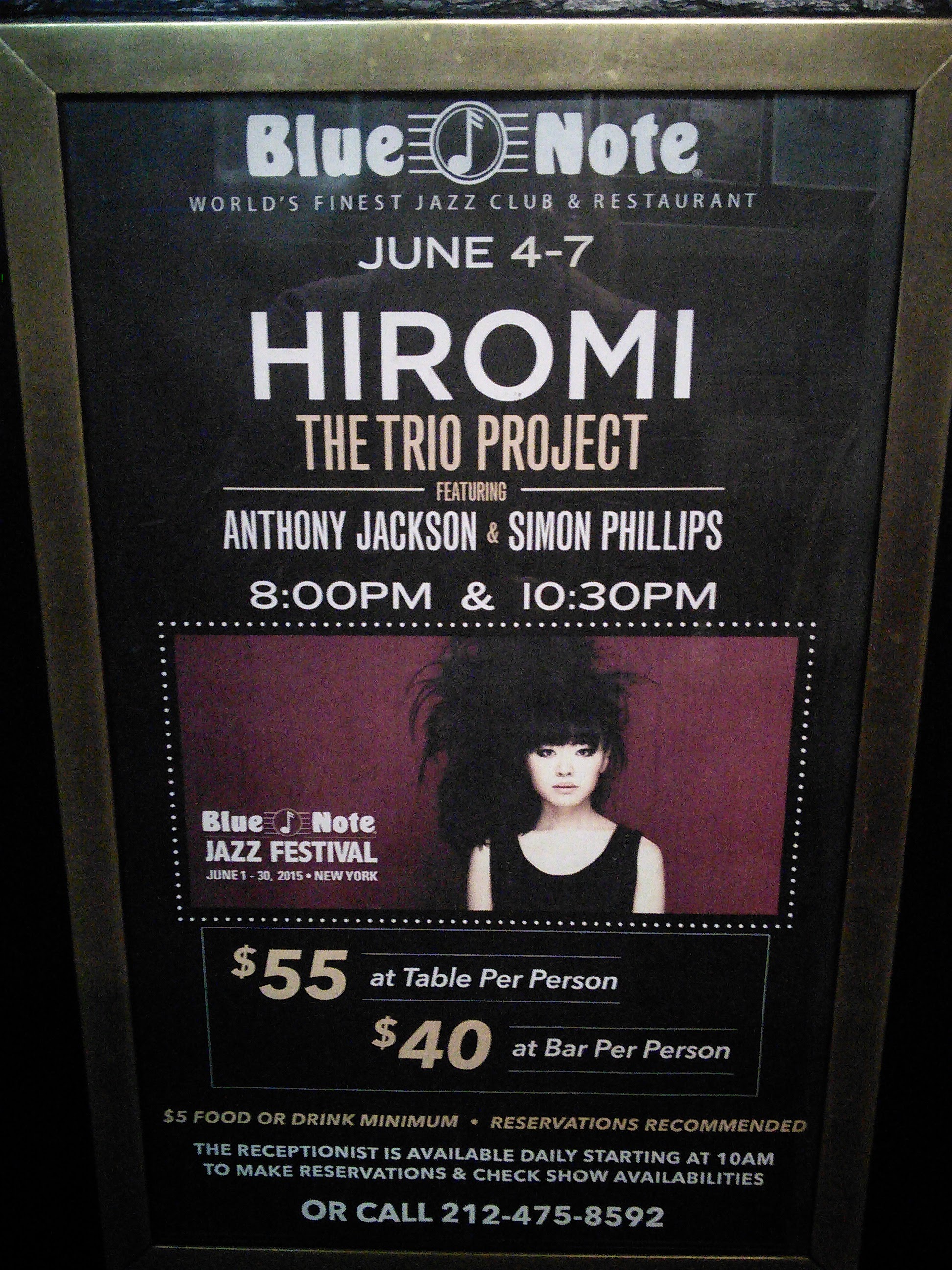 題名:HIROMI: THE TRIO PROJECT ft. ANTHONY JACKSON & SIMON PHILLIPS 劇場:Blue Note New York 日時:2015年6月4日22:45-23:55 料金:テーブル55USD+Web予約手数料6.5USD 座席:ピアノの真横、通路を挟んだ奥のテーブル(AMEX GOLDによるVIP席確保) 出演:HIROMI, ANTHONY JACKSON, SIMON PHILLIPS Savionがあまりによかったので、二日続けてBlue Note 通い。 今度は写真撮影一切禁止。 鍵盤がちょうど横から見える位置で超絶技巧を堪能。 Savion の時の床がキーボードに変わっただけですごさは同じレベル? 肘から先の筋肉のうねりがすごい、そして打鍵が見えません。 指が独立した命を持っているように思えてきます。 指を見てるだけで惚れました。これまたあっというまの1時間余。 もうこの距離で聞くことはないだろうなあ。 PR