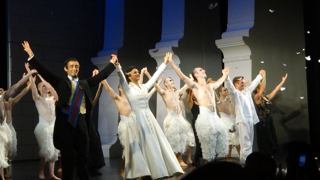 × [PR]上記の広告は3ヶ月以上新規記事投稿のないブログに表示されています。新しい記事を書く事で広告が消えます。 題名:マシュー・ボーンの「白鳥の湖」(Matthew Bourne's Swan Lake) 劇場:東急シアターオーブ 日時:2014年9月21日12:30-15:00(途中休憩あり) 料金:S席13000円 座席:1階4列10番(左端ブロック) 配役 The Swan / The Stranger Chris Trenfield ザ・スワン/ザ・ストレンジャー: クリス・トレンフィールド The Prince Simon Williams 王子:サイモン・ウィリアムズ The Queen Anjali Mehra 女王:アンジャリ・メーラ The Girlfriend Carrie Johnson ガールフレンド: キャリー・ジョンソン The Private Secretary Paul Smethurst 執事:ポール・スメサースト Swan スワン カイル・マレー,オーティス=キャメロン・カー,トム・カミングス, トム・ブロデリック,アンドリュー・モナハン,リース・ハイドン・コーストン, マイケル・バーンズ,パルジファル・ジェイムズ・ハースト,エド・ミトン, グレン・グラハム,アシュリー=ジョーダン・パッカー,ハリー・プライス, イヴァン・デルガド・デル・リオ,ルーク・ジャクソン Ensemble アンサンブル フレイア・フィールド,キャリー・ウィリス,シャンテル・ゴトベッド, カトリーナ・リンドン,ジェイミー=エマ・マクドナルド,ケイト・リオンズ, コーデリア・ブレイスウェイト,エマ・チャドウィック 東京千秋楽。 今度は白鳥はゴメスではないのであまり期待せずに見てました。 ところが、これが思いがけず良い! すっごくかっこいい。なんだかすごくスタイリッシュなんですね。 ぴしっと決まるシーンが多く、惚れ惚れしてしまいました。 このカップルはこれはこれで良し、また見たい。 そしてカーテンコール! なんと頭上から羽がふってきました。 千秋楽だけの趣向だったようです。すごく幻想的でした。 PR