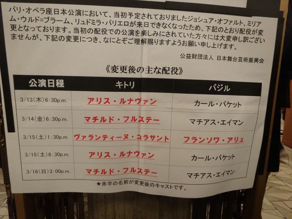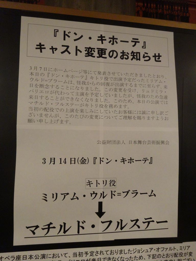 題名:日中韓芸術祭2014~ダンスで交信~ 劇場:KAAT神奈川芸術劇場ホール 日時:2014年9月4日19:00-21:40(途中休憩あり) 料金:無料(事前申し込み抽選) 座席:3階B1列20番(最前列センター) 総合プロデューサー:佐藤まいみ(舞台芸術プロデューサー) 出演:コンドルズ(日本)、山海塾(日本)、でんぱ組.inc、福建省梨園戯実験劇団、 泉州南少林武術団、伝統国楽室内楽団「律」(ユル)、LDP(Laboratory Dance Project) 入場警備がやたらものものしい。 バッグチェックがあり、立つなとか。。あとで考えたら、これってコンサートのスタイルですね 日頃演劇しか縁がないのでびっくり、というかKAATでこんなことがあるとはね。はじめてのKAAT3階でした。ダンス公演なので上からみるのも悪くないのですが、いかんせん高い、通路が狭く前のバーが低い、見やすい代わりに落ちそうな雰囲気が(汗) オープニングは真っ白な制服の電磁組とコンドルズの盆ダンス!盛り上がります! 次は中国、演奏に舞、それに武術の演舞。 韓国は真っ赤できらびやかな衣装での演奏、そのご笛の独奏、真っ白な衣装に着替えての演奏。かなりかっこいい。それに続くのはコンテンポラリーダンスのLDP、バッチリ筋肉ついた男性ダンサーのみが舞台せましと走り回り転がり回りすべりまくり!寝そべるシーンが多いので上から見ていて良かったと思いましたよ。もうどんだけ動くのかといういうくらいかっこいい肉体美を満喫。ファンになりそう。 幕間があって、今度は日本。でんぱ組を見るのははじめて、一階最前列に大きなお友だちが陣取っていって一緒の振り付けで踊ってました。この子達また見てみたいかも、おもしろい動きです。次は白塗り、山海塾です。うってかわった静かな動き、これはまたうっとり、これも寝転がるシーンが多くそのたびに床に白い色が、、、 トリはコンドルズ、コミカルな動きが楽しい。近藤さんのソロはとても美しい。影と共に踊る という風なライティングでしたよ。 カーテンコールは舞台上と客席皆で盆ダンス、わかりやすくておどれそう、、だったのですが 3階最前列だけは立ち上がるの禁止でとても残念。 これが無料で見れたのは大変ありがたいものでした。 これで3階でなければ。。。 PR 題名:Manon 劇場:The Metropolitan Opera 日時:2014年6月3日19:30-22:05(途中休憩あり) 料金:110USD+Web手数料6USD 座席: Side Parterre, Box 11, Seat 4 劇団:American Ballet Theatre THE PRODUCTION TEAM Composer: Jules Massenet Choreography: Kenneth MacMillan Orchestrated and Arranged by: Martin Yates Set Design: Peter Farmer Costume Design: Peter Farmer Lighting Design: Christina Giannelli Conductor: Ormsby Wilkins 出演: Manon: Diana Vishneva Des Grieux: Marcelo Gomes Lescaut's Mistress: Misty Copeland Lescaut: Herman Cornejo 1階、2階は満席。 Diana Vishneva と Marcelo Gomes の主演がすごすぎる。 床の上なのに、空中浮遊か水上歩行かと思わせます。 本当に特撮かアニメかと思うくらい重力を感じさせない。 床を滑るように動く。しかも超美人>Diana 。 これなら男なら誰でもひっかかるという納得感満載の舞台です。 男たちの頭上に立っていたかと思うと、ダイビングのように頭 から下にに落ちていき、また上へと持ち上がる。。なんだか きらきらしたままで踊ってます男を惑わす悪女なんですかねえ。 天真爛漫で悪気はなくて好き放題しているのに、男たちが振り 回されている感じに見えます。道化師役の女の子もかわいい。 3幕は二人とも囚人となってぼろぼろになります。2幕までと の落差がとても激しい。看守に手籠めにされそうになり、男が 看守を刺し、、後は悪夢ですか?どろどろになっておわります 物語の途中でいかさま賭博が出てくるのですが、カードは普通 のじゃないみたい。どうやってイカサマばれるんですか? カーテンコールは本当に鳴り響く、割れんばかりの拍手でした。 題名:Coppélia 劇場:The Metropolitan Opera 日時:2014年5月31日14:00-16:20(途中休憩あり) 料金:200USD+Web手数料6USD 座席: Center Parterre, Box 26, Seat 1(センターよりちょっと右より最前列) 劇団:American Ballet Theatre Conductor: Ormsby Wilkins Swanilda: Sarah Lane Franz: Daniil Simkin THE PRODUCTION TEAM Composer: Léo Delibes Choreography: Frederic Franklin Set Design: Tony Straiges Costume Design: Patricia Zipprodt Lighting Design: Brad Fields 満員、この作品は初見。全編コミカルで楽しい。 シムキンとヒロインと両方がかわいい。ヒロインとコッペリアの間で おろおろする姿に客席から笑い出てます。コッペリアのスタチュー も見事です。2階席は群舞がとてもみやすいですね。毎回2階席 で見たいが高い。ただ目が悪くなりすぎて、裸眼ではひとりひとり の細部が見えない。Orz. 2幕目はコッペリウスの工房のなか。怖いもの見たさでドキドキし ながら見ているダンサーたちがこれまたかわいい。人形のスタチュー さと人形ぶりがみていておもしろい。 そしてコッペリアになりすましたヒロインとコッペリウスのからみが これまたたのしい。しかしコッペリウスはあっというまに金で転ぶ んですね。しかし最後にばらすのかあ。 楽しさパワーアップの2幕でした。 