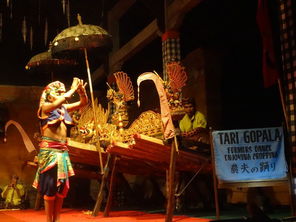 × [PR]上記の広告は3ヶ月以上新規記事投稿のないブログに表示されています。新しい記事を書く事で広告が消えます。 題名:Jegog Performance and Balinese Dance 日時:2015年2月8日19:00-20:25 劇場:Pura Dalem Bentuyung(Ubud Bali) 料金:80000インドネシアルピー 座席:2列目センター付近 劇団:Jegog Group[Suara Sakti] Bentuyung Ubud 番組: 1.Truntungan 開演に際しての祈りの曲 2. Tari Panyembrama 公演の最初に行われる歓迎の踊り 3. Tari Gopala 稲の収穫を喜んで酔い踊る、納付の踊り 4. Tabuh Kreasi Jegog Campur ジェゴグいろいろ 5. Tari Belibis 白い野鳥の鴨が、舞い飛ぶようすを表現した踊り 6. Mekepung ヌガラ地方で行われている二輪車を」引く水牛レースを踊りにしたもの。 女性の踊り手の水牛と駆者との駆け引きが面白い 7. Tabuh Surya Nyalantare 新曲「太陽賛歌」 8. Tabuh Mebarung 重低音のジェゴグと中音・高音のジェゴグとの音の競演。 どうぞ、ステージにあがって音を体で感じてください 9. Penutup 閉演に際しての感謝の演奏 王宮の横の道を北上、車で5分程度で到着。 インフォメーションの前から無料送迎もでているようです。30人くらいの観客。 舞台の左右にジェゴク。舞台後方には笛や太鼓。 ダンスがつくが子供たちの気の抜けたようなものが多く、、、 オリジナル曲になってから元気が出る感じ。水牛のダンスはちょっとコミカル。 でもまあダンスは添え物と思ってじぇごくの音色を楽しんでました。 最初は歓迎の踊り。 この右側の竹楽器がジェゴグ。踊っているのは農夫らしい。 それから「野鴨の踊り」けっこうかわいい。 これが「水牛レースの踊り」 騎手が男で水牛が女らしいのです。 最後は巨大ジェゴグ登場。Surya Agung[Great Sun] という名前の新しい楽器だ そうです。幅4m、高さ3.5m、超低音がでるようです。 「太陽賛歌」という新曲でガンガン低音だしてました。 最後に舞台にあがっておとを実際に味わってくださいというコーナーでは舞台上に あがってジェゴグの下に潜り込んで腹からあじわってました ジェゴグは聞くより腹で感じるのが楽しい。 最後は舞台の上で記念撮影!! PR