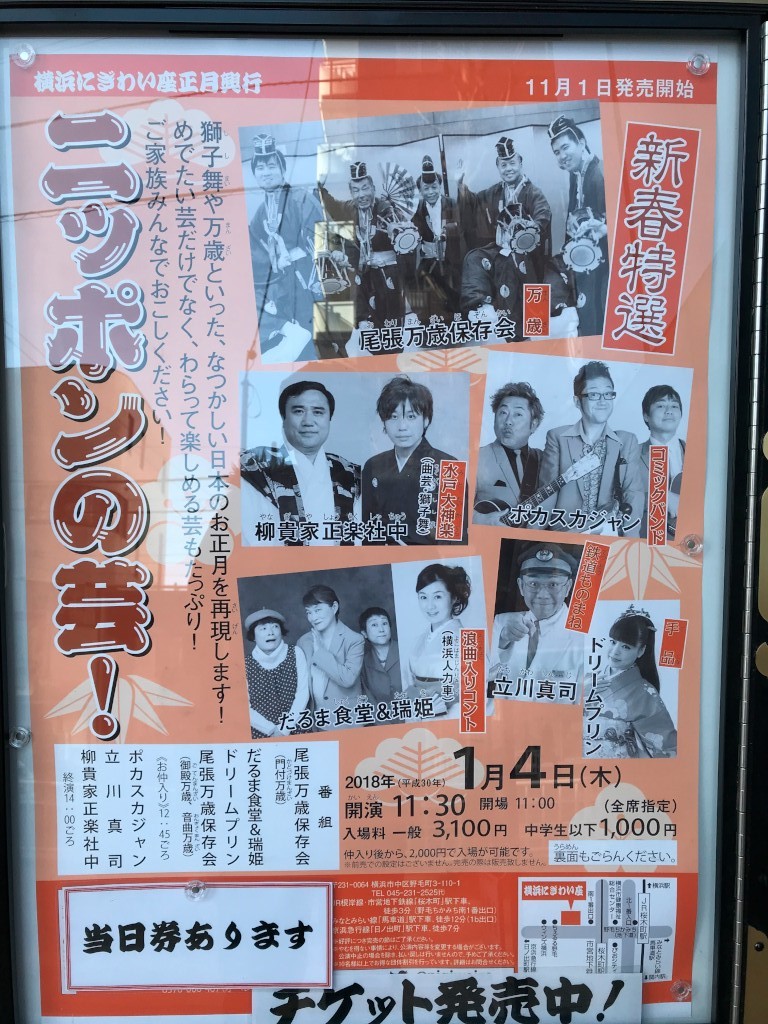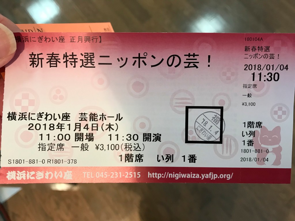 題名:新春特選 ニッポンの芸! 劇場:横浜にぎわい座芸能ホール 日時:2018年1月4日 11:30-14:20(中入あり) 料金:3100円 座席:いー1番(2列目左端) 番組: 尾張万歳保存会(門付万歳) だるま食堂&瑞姫(浪曲入りコント「横浜人力車(「瞼の母」入り)」) ドリームプリン(手品) 尾張万歳保存会(御殿万歳、音曲万歳) 《お仲入り》 ポカスカジャン(コミックバンド) 立川真司(鉄道ものまね) 柳貴家正楽社中(水戸大神楽・曲芸と獅子舞) 8割程度の入り。当日券を直前に購入。 冒頭の門付万歳は客席の後ろから賑やかにはいってきて幕をあけずにその前で歌って終了。 だるま食堂+浪曲は「浪曲入りコント」と紹介されていましたが、かつてはこれを「節劇」 と呼んでいたそうです。 新作で、シューマイ職人を探して人力車で横浜の名所を巡るというもの。 劇中劇で「瞼の母」、浪曲でこれやると燃えますよね。御殿万歳は太夫ひとりに才蔵4人。 音楽と踊りとしゃべくり。 ポカスカジャンは有名な曲を他の風味(曲調とか歌手とか)でうたってみせました。 ボサノバ風の「おら東京さいくだ」がかなりつぼ。 立川真司さんは鉄道のものまね。京急の駅のアナウンスをまんま再現するのがすごい。 録音にかぶせて生声をいれるところを、全部肉声で再現!それから車輪の音やインバータの音。 鉄分あるひとが聞いたら衝撃的な内容なのでしょう 水戸大神楽は獅子舞から、袴を履いてのひとり獅子舞で、最後にちょっとだけ二人になりました。 曲芸はもっぱら若い方担当。皿回しが圧巻、座って皿を回し、額、肩、肘、のど、そして耳たぶ! くわえ撥の上でもたてました。中心をはずして回して、ぐらぐらまわるのを見せたり、ジグザグ になる棒をいれてまんなかもぐるぐるまわるのがわかるようにしたり。 弓の上で回しておいて、一瞬にして弓のたわみ方をかえたり、アイテムにも工夫がなされてます。 いつもながら3本の出刃を使って回す出刃皿は迫力満点。 籠鞠は、籠自体が完全な円筒ではなくまんなかが多少すぼまっており、両側の口が 多少上に向いていました。だいぶ楽にできそう。。飾りの房はついていません。 皿の上に2個玉を載せて交換するパターンが、すべての組み合わせで行われていました。 PR
