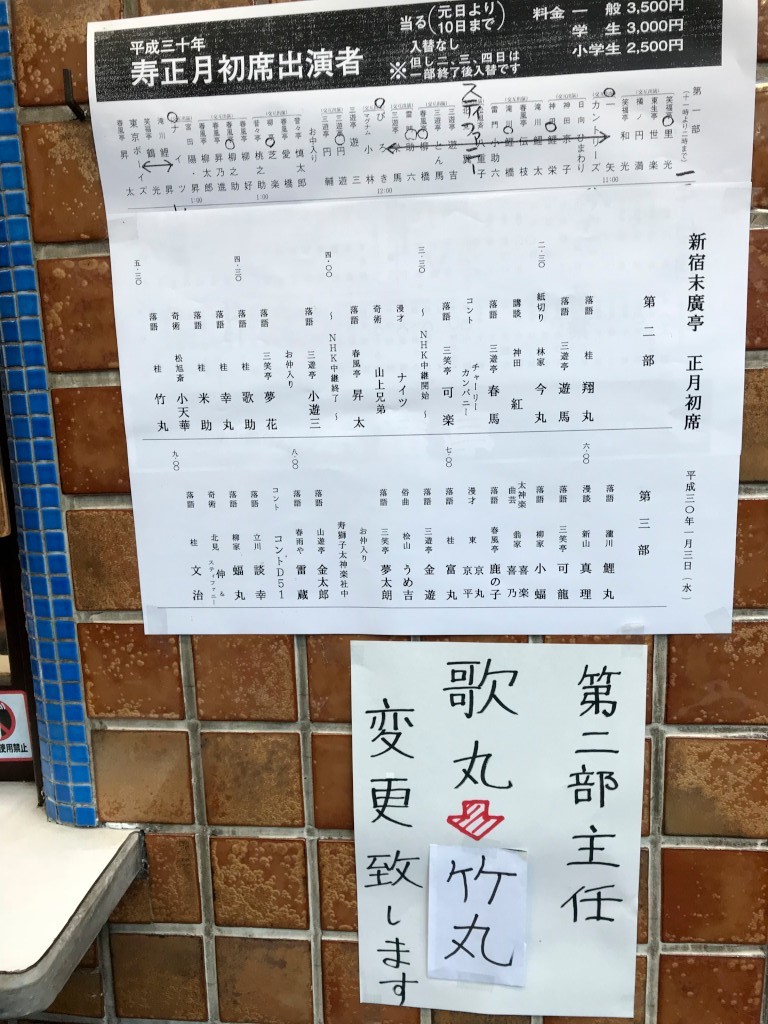 × [PR]上記の広告は3ヶ月以上新規記事投稿のないブログに表示されています。新しい記事を書く事で広告が消えます。 題名:新宿末広亭正月初席第二部 日時:2018年1月3日14:30-17:30(14:45ごろからききました) 劇場:新宿末広亭 料金:3500円 座席:前半右後方立ち見、仲入り後G8(中央) 番組 第二部 (14時30分~17時30分) 落語 桂 翔丸 落語 三遊亭 遊馬 紙切 林家今丸 ーーここから聞きましたーー 講談 神田 紅 黒田節 落語 三遊亭春馬 コント チャ-リ-カンパニ- 落語 三笑亭 可楽 漫談 中継前説 桂 翔丸 ーNHK中継開始ー 漫才 ナイツ 将棋尽くし? 奇術 山上兄弟 ロープマジック等 落語 春風亭昇太 看板のピン ーNHK中継終了ー 落語 三遊亭 小遊三 髪結い床 -お仲入り- 落語 三笑亭 夢花 漫談(放送おして持ち時間が2分) 落語 桂 歌助 お父さんは出張中+踊り(奴さん、姉さん) 落語 桂 幸丸 年賀状漫談 落語 桂 米助 ねこと金魚 奇術 松旭斎小天華 マジック 落語 桂 竹丸 西郷どんの物語 TVの生中継いりでした。大入り満員。 TVの時間厳守ということでさくさくとすすみました。 翔丸さんは拍手のしかた解説。 ナイツは将棋ねた、めっちゃ短い。これがTVサイズ? 山上兄弟はイケメンコンビのマジシャン、これもさくさくとすすみます。 昇太師匠はめちゃテンション高い看板のピン、やはり派手なものがTV受けするんでしょうか。 TV中継がおわるとうってかわってゆっくりした流れに。でも時間はおしていたのでしたw 仲入り後のほうが雰囲気としてはよかったですね。のんびり流れる時間でぼーっと見てるのが好き。 ちょっと残念だったのはトリが代演、予定の歌丸師匠は今日から休演となりました。 でも竹丸師匠の噺はけっこうおもしろく、お正月の寄席らしい雰囲気にひたれましたね。 PR