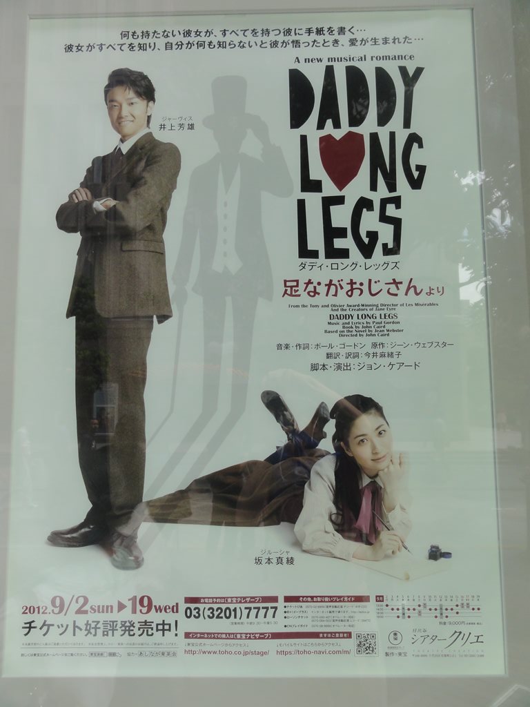 × [PR]上記の広告は3ヶ月以上新規記事投稿のないブログに表示されています。新しい記事を書く事で広告が消えます。 題名:ミュージカル・ロマンス『ダディ・ロング・レッグズ~足ながおじさんより~』 劇場:日比谷シアタークリエ 日時:2012年9月15日13:00-15:45(途中休憩あり) 料金:9000円 座席:5列18番(5列目センターブロック右より) 音楽・作詞/ポール・ゴードン 原作/ジーン・ウェブスター 翻訳・訳詞/今井麻緒子 脚本・演出/ジョン・ケアード 出演: ジルーシャ:坂本真綾さん ジャーヴィス・ペンドルトン:井上芳雄 登場人物二人だけのミュージカルです。あまりに評判が良いので 見にきてみました。結果はとても良い! セットは書斎と窓、舞台の左後方がバンド。 ヒロインは舞台の前方で箱やスーツケースをもとに一人芝居、 ジャービスは書斎机に座って手ジルーシャからの紙を読むのです。 基本的にはすべて手紙の朗読とその感想。生き生きしたヒロイン がとても魅力的。ジャーヴィスはは最初からかなりデレてますね ダディであることを隠して本名で大学に行くところが1幕のクライ マックス。聞いていてわくわくする曲ばかり。 客席はほとんどが妙齢の女性。幕間のトイレがすごいことにな てました。 後半は彼氏と言い争いから、卒業式、そしてクライマックスへ 出会って、ヒロインが年寄りでもハゲでもないことを許すまでw 当初は歌が終了するたびに拍手が起きていましたが、後半になる と歌の後に間があっても拍手は無し。物語に皆でのめりこんでい た感じ。ダディの帽子欲しい。 久々にまた見たいと思った舞台となりました。 カーテンコールではあしなが育英会に対する寄付を募っていました。 私も募金箱へ折りたためるお金を、、 そしてうちへ帰ったのち、あしなが育英会への定期的な寄付を 始めました。 しかし、、この劇場何か変になってませんか? 客席に座ったとたんに涙がでつづけて鼻がつまる。。 最初は感動して泣いているのだと勘違い。。 PR