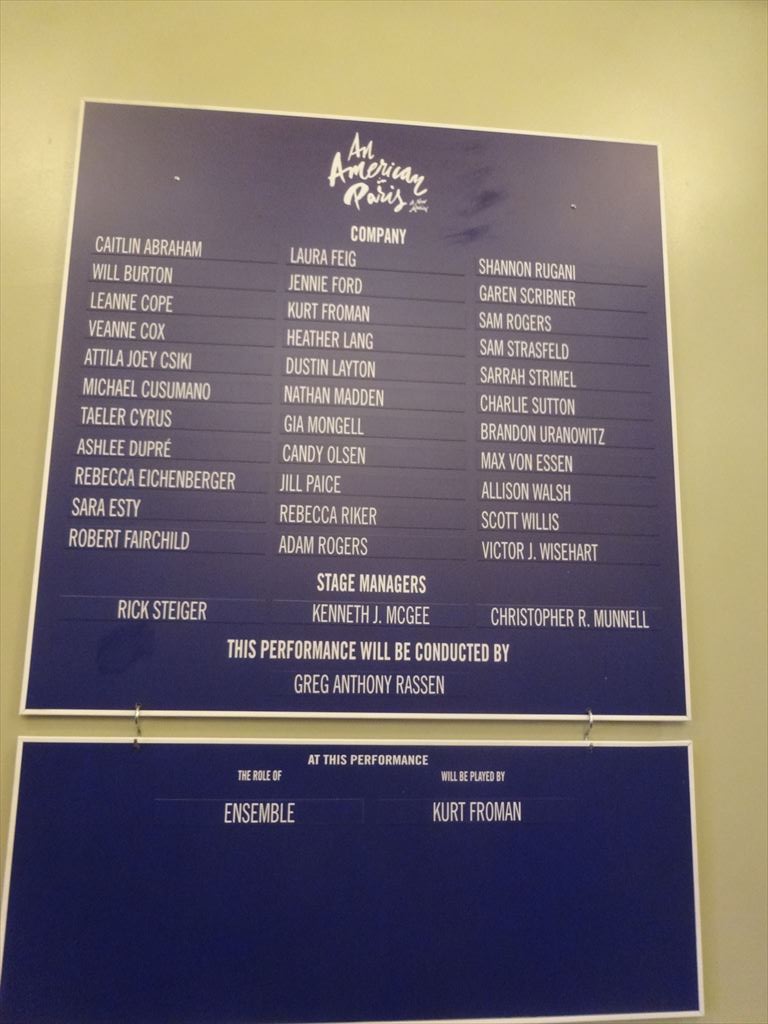 題名:An American In Paris 劇場:Palace Theatre 日時:2015年5月31日15:00-17:30(途中休憩込み) 料金:Ticket Master 手数料込 159.95USD 座席:Section ORCH, Row B, Seat 102(3列目センター) Synopsis: An American World War II vet turned painter settles in Paris and promptly falls in love. The new musical is inspired by the Academy Award-winning film and includes the Gershwin songs “I Got Rhythm,” “Liza,” “'S Wonderful,” “But Not for Me,” “Stairway to Paradise” and orchestral music including “Concerto in F,” “2nd Prelude,” “2nd Rhapsody,” “The Cuban Overture” and “An American In Paris.” Cast List: Jerry:Robert Fairchild(Drama Desk Awards Outstanding Actor in a Musical) Lise:Leanne Cope Madame Baurel:Veanne Cox MILO:Jill Paice Adam:Brandon Uranowitz Henri:Max von Essen Swing:Caitlin Abraham Emsemble:Will Burton Emsemble:Attila Joey Csiki Emsemble:Michael Cusumano Emsemble:Taeler Cyrus Swing:Ashlee Dupre Ensemble, Mme Dutois, Olga:Rebecca Eichenberger u/s Lise:Sara Esty Ensemble:Laura Feig Swing:Jennie Ford Swing, Dance Captain:Kurt Froman Ensemble:Heather Lang Ensemble:Dustin Layton Ensemble:Nathan Madden Ensemble:Gia Mongell Ensemble:Candy Olsen Ensemble:Rebecca Riker Ensemble:Adam Rogers Swing:Sam Rogers Ensemble:Shannon Rugani u/s JerryGaren Scribner Swing:Sam Strasfeld Ensemble:Sarrah Strimel Ensemble:Charlie Sutton Ensemble, Lise u/s, Asst. Dance Captain:Allison Walsh Monsieur Baurel, Ensemble:Scott Willis Ensemble, Mr. Z:Victor J. Wisehart Production Credits: Christopher Wheeldon (Direction and Choreography) TONY Awards(Best Choreography) Bob Crowley (Set and Costume Design) TONY Awards(Best Scenic Design of a Musical) Natasha Katz (Lighting Design) TONY Awards (Best Lighting Design of a Musical) Jon Weston (Sound Design) 59 Productions (Projections) TONY Awards(Best Scenic Design of a Musical) Rob Fisher (Musical Score Adaptation, Arrangement and Supervision) Christopher Austin (Orchestrations) TONY Awards(Best Orchestrations) Sam Davis (Dance Arrangements) Todd Ellison (Musical Supervision) Don Sebesky and Bill Elliott (Additional Orchestrations) TONY Awards(Best Orchestrations) Other Credits: Lyrics by: Ira Gershwin Music by: George Gershwin Book by Craig Lucas 舞台の真ん中にピアノが一台おかれている状態から始まります。 オープニングはバレエ成分が極めて濃い長いダンスシーン。大作感がひしひしと伝わってきます。 その直後のアイゴッタリズムで盛り上がり、'S Wonderful でもう一段テンション高くなって しまいました。そしてヒロインがかわいくてかっこいい!ヒロイン婚約相手がいい人のようで ちょっとかわいそう。パトロンのおばさんはいろいろありそうw ダンスにつぐダンスで、なにやら抽象画を見ているみたい。 そして劇中劇(というか劇中ダンスですな)がこれまた素晴らしい。ダンスてんこもりの大迫力! 劇中劇終了時にフィナーレかと思いましたよ。この振付はかなり好きです。 後半の盛り上がりは素晴らしく、美人なヒロインにたくましいイケメンのカップル。 美男美女のボーイミーツガールという古き良きミュージカルの王道のような作品でした PR