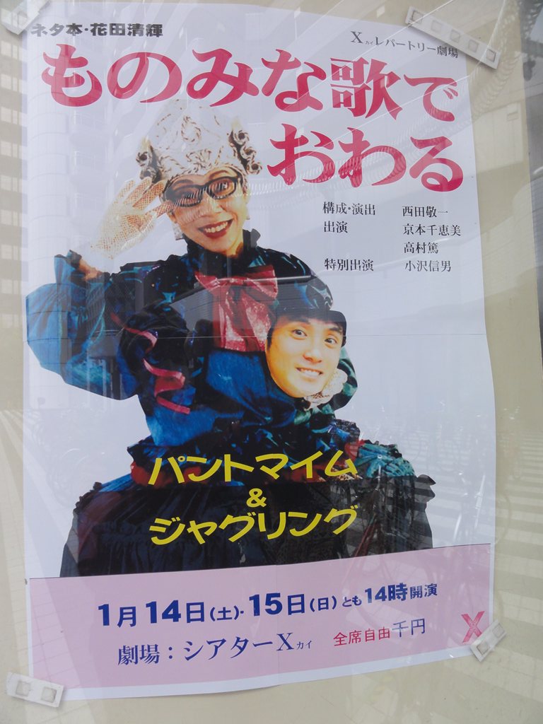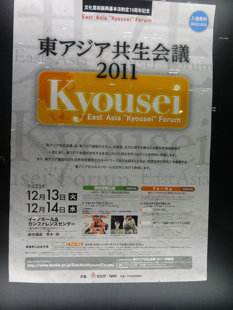 題名:ものみなうたで終わる 日時:2012年1月15日14:00-15:22 劇場:シアターカイ 料金:1000円 座席:最前列みぎより マイムと講釈とジャグリングの舞台ということで見にきて みました。上演前には、原発再開反対のビデオが流れてい たのでびっくり。 舞台上にはお茶箱による釈台。張り扇でお茶箱をばちっと 叩いて物語の開始!これは支配している1%の者たちにつ いて、99%の者が革命を起こす、革命戯曲なのだそうで。 この戯曲が表している世相と今の世相がよく似ているので、 死者と生者による連帯が行える。。 この戯曲は日生劇場のこけら落とし作品であり、そのとき は水谷八重子や仲代達也をはじめ総勢34人のキャストでやっ たものを今回はなんと3人! ひとしきり、物語の由来や現在と過去の縁を語った後、当 時の大道芸を想像するためにジャグリングパフォーマンス へと。。 まずは、クラブ3本、それからボール3個ー7個、槍でデ ビルスティックのパターン等。凄かったのはバランス芸、 槍の先にペットボトルの底を抜いたものを逆にさしておい て、槍をヘッドバランスし、槍の先のペットボトルにボー ルを投げ入れる!槍を3本繋いですごく高くした状態での 投げ入れは手に汗握りました。舞台の上では天井につかえ てしまうため客席に降り、それでも足りず座り込んでのバ ランスで天井ぎりぎりになったペットボトルに見事ストラ イク! それから作品解説のセッション。別の方が舞台に登場して この作品と上演の歴史を語られました。これは日生劇場で のこけら落としで演じられた大きな舞台だったが、不評で 不入り。 10年後に六本木の俳優座劇場で再演。鉄パイプでセット を組んだ演出で、これは好評だった。スターたちと若者た ちでは読みが違う 今回の公演で、34人のキャストが3人まで成り下がり、この 成り下がりが今日のテーマ。 これは世の中がまだ変わっていくぞという乱世の物語、大 衆のエネルギーが満ちあふれていた。歌舞伎とは傾く、非 暴力の戦いなのである。 キャストが入れ替わりまた講釈+マイムに戻って終了。 ポストトークではなく、ショーの中に舞台解説をいれこん でしまう、というのは珍しい演出のような気がします。舞 台のメタ階層を壊すひとつの仕組み?。内容はさておき、 このやり方はありかもと思いましたよ。 なんだか不思議な空間体験でした。 PR 題名:民族芸能公演 ~祈り~東アジア民族芸能の現在 日時:2011年12月13日18:30-20:00 劇場:イイノホール 料金:無料(事前申込制) 座席:前方ブロックなかほど右端 解説:(公式Webより) --------解説--------- 未曾有の災害となった東日本大震災。「東アジア共生会議」 の開催にあたり、東アジアの人々が、豊かな恵みをもたら してくれる一方で、時には猛威を振るう自然をどのように 心にとらえ、あらわしてきたかを民俗芸能を通じて探りま す。 黒森神楽 岩手県宮古市 黒森神楽は、宮古市山口に鎮座する黒森神社を本拠地とし ています。正月になると、黒森神社の神霊を移した「権現 様」(獅子頭)を携えて、陸中沿岸の集落を廻り、家々の 庭先で権現舞を舞って悪魔祓いや火伏せの祈祷を行います。 夜は宿となった民家の座敷に神楽幕を張り夜神楽を演じて、 五穀豊穣・大漁成就や天下泰平などの祈祷の舞によって人 々を楽しませ祝福をもたらしています。 この巡行は旧盛岡藩の沿岸部を、山口から久慈市まで北上 する「北廻り」と釜石市まで南下する「南廻り」に隔年で 廻村し、近世初期(およそ400年程前)からその範囲は変 わっていません。こうした広範囲で長期にわたる巡行を行 う神楽は、全国的にも類例がなく、貴重な習俗が現在も継 続されていることから、平成18年3月に国の重要無形民俗 文化財に指定されました。 四川省アバ州チベット族・チャン族 民族伝統舞踊 中国四川省 四川省の北西部、アバ・チベット族チャン族自治州(以下 アバ州)を居住区とするチベット族とチャン族。今回は、 農業や、冠婚葬祭の際に行われる歌や舞踊をご覧頂きます。 アバ州にはチベット族の中でも主にアムト(安多)チベッ ト族、ギャロン(嘉絨)チベット族、白馬チベット族が居 住しています。 同じチベット族でも、遊牧地域の歌は音 域が広く、豪放である一方、農業地域の歌は節回しが流麗 で、のどかな響きが伝わるなど、地理的・言語的な違いに より、唄う歌、唄い方、リズム、音程など全く異なります。 チャン族は、中国で唯一古代の民族名称を持ち続け、その 歴史は三千年前の殷商時代の甲骨文字に残ることから、人 類学において「中華民族の生きた化石」とも言われていま す。 また、羌笛は二千年余りの歴史を持つ独奏楽器で、 独特な双管の共振によるハーモニーと頬を膨らませる息継 ぎの演奏法でゆったりとした雰囲気が醸し出され、中国の 管楽器の父と目されています。これらの民族が継承する無 形文化遺産は、悠久の歳月の試練を受け、2008年の‘5・12’ 四川大地震を経た今もなお、美しく輝いています。 鳳山仮面劇 韓国ソウ