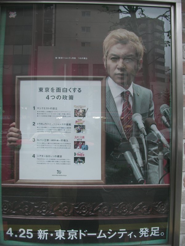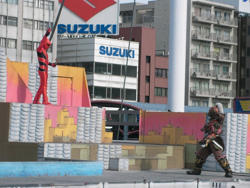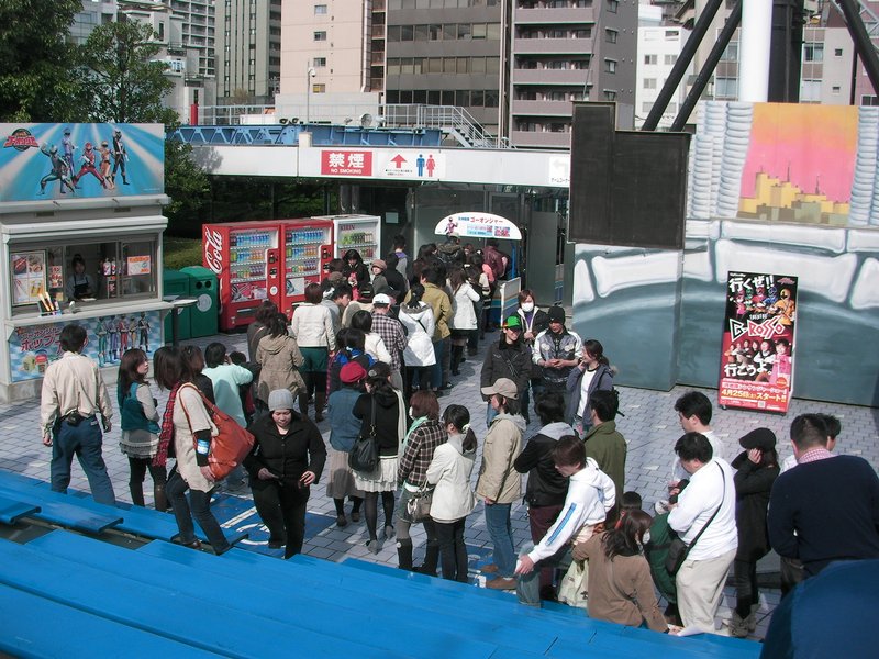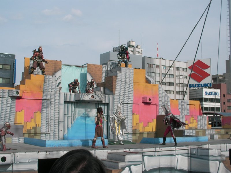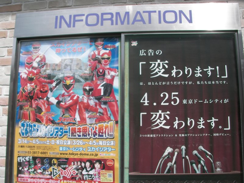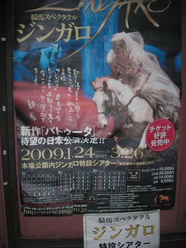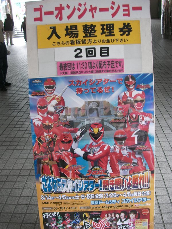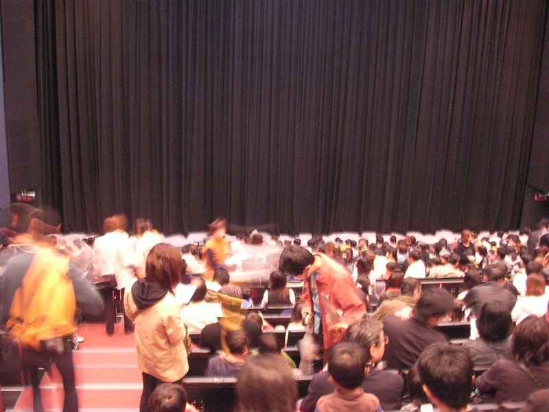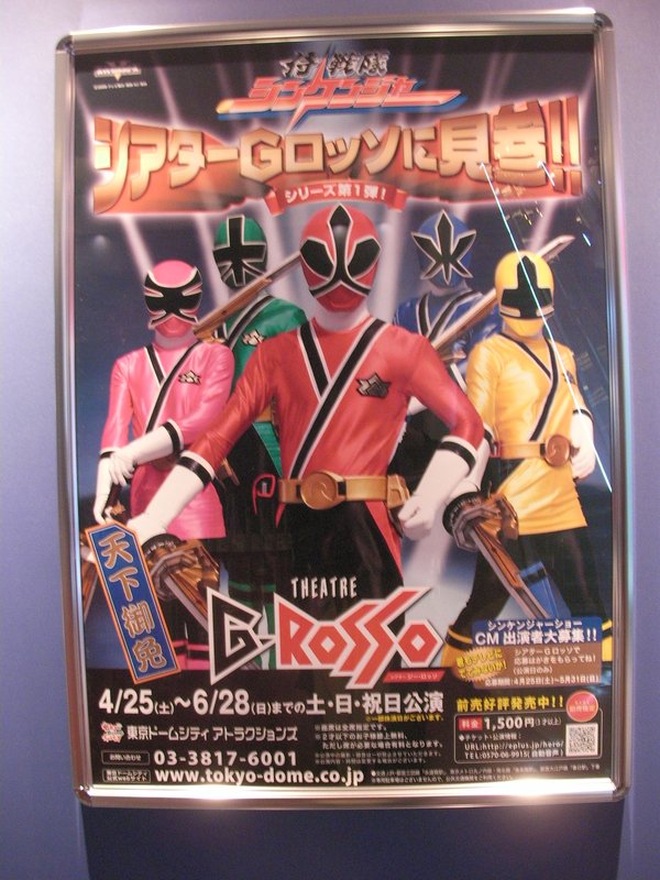 題名:浪漫天涯 日時:2009年5月3日20:30-21:45 劇場:美麗之冠(三亜、海南島) 料金:ホテルからの往復込みツアー4000JPY(たぶん180元の席) 座席:7列8番(客席まんなか付近) 20時頃には劇場前広場で少数民族のショーがなされていました。このショーも定期的(毎日?) に演じられているもののようです。焚き火を模した照明の周りで盆踊り?竹を持ってたたき ながら回ります。それからバンブーダンス、いろんなリズムがあるものです。客の飛び入りも あり、私もうずうずだったのですがどうすればいいかわからないとなかなか出れませんねえ。 さて劇場の中にはいりました。うーんなんだか不思議な劇場。元々ミスユニバースコンテスト 会場としてできた建物なのですが、扇形の客席にかなり広い舞台、舞台の前面は微妙にカーブ。 バックスクリーンと左右に映像。場面が変わるたびにその場面タイトルがでていました。 タイトルは4ヶ国語で出ます。中国語、英語、ロシア語、にあとなんだろう? 客席は約3割程度の入り、前方中央にVIP席。アイスなどの売店はあるのですが、このショーの プログラムやDVDなどの土産物を売っているお店がありません。商業の国中国としてはちょっと ありえない感じです。 オープニングは、海底の踊り。魚や海草やヒトデがでてきます。そのシチュエーションのまま、 海の中での軟体、それからティッシュー、と続きます。舞台にはとにかくたくさん人が登場 してきます。ダンスとファッションショーのあいだに雑技が少し出てきました。 椅子の積み上げ芸はピンの芸人さんがきれいにまとめてみせてくれました。 それからBig Fly Wheel(他のところではWheel of Death という名前で演じられているもの) は見事でした。回転する支柱が三又になっておりその先に人が入れる筒がついています。 天井ぎりぎりまであるその大道具がぐるぐる回っている最中に筒の内と外で演技をするのです。 ぐるぐる回っている筒の外を走り、そしてジャンプ!バチのジャグリング、そして縄跳び! 最近この出し物に良くであっている気がします。迫力満点なところが受けるのでしょう。 繰り返されるファッションショー、少数民族舞踊もいくつか、バレエと民族舞踊がまざった ようなものもありました。外で演じていたバンブーダンスも少しだけ。 うーん、リトルマーメイドとライオンキングを足してアイーダをフレーバーに、シルクド ソレイユからインスパイアされた演出を組み合わせて10で割ったような雰囲気でしたよ。 たしかに美女たちがすごく大人数がでてきますし、ダンスがたしかにできる者もいるのです が、舞台の端の方ではやるきなしの雰囲気が漂っています。振付ががんばりましょうなの? 海南島にきて他にすることがなければ見に行ってもいいと思います。 PR 題名:侍戦隊シンケンジャー シリーズ第1弾「侍戦隊シンケンジャー!シアターGロッソに見参!!」 日時:2009年4月25日10:30-11:05 劇場:シアターGロッソ(東京ドームシティ アトラクションズ内ジオポリス) 料金:1500円 座席:B列8番(2列目左ブロック通路際) 今日からジオポリスオープンです。初日とあって関係者の名札を下げてスーツ姿のおじさん が随所に見られました。10時開場、10時半開演。今回から座席指定なので早く来る必要は ないのですが、それでも開場前に40-50人は並んでいたでしょうか。あいにくの雨にも かかわらず皆さん元気です。劇場隣にはシンケンジャーなりきりフォトスタジオや プリクラなどがオープンしていました。 10時になって開場すると歓声が、お約束のシンケンレッドと握手!の隣に黒子が控えている! いい感じですねえ。レッドと握手して記念撮影をする人が多く、入場の行列はなかなか すすみません。一時は建物の外に出て、それからまだまだ続く長蛇の列になってました。 それでも開演時間前に客いれちゃんと終わるから、優秀ですよね、スタッフさん。 劇場内は非常に急な客席になっており、どこに座ってもそれなりにちゃんと見れそうです。 最前列が地下一階、最後列が地上階に対応しておりました。地下一階といってもかなーり 深いのです。私が座ったのは2列目で、舞台まであとちょっと。通常の劇場より遥かに高い 幕が目の前にありました。 写真は客席後方から見下ろす形で撮ったものですが、角度がまるで 感じられない写り方になってますね。 開演になるとまず館内放送で、携帯や撮影禁止などのアナウンスがありました。今までは ナレーターが舞台にあがっていっていたところです。それに撮影禁止?スカイシアターでは 素顔の戦士がでなければ撮影可だったのに。。まあ通常の劇場なのでストロボたかれたら 困るというのはわかります。なんかちょっと違和感がでたところで幕が開きました。 すると上方にスクリーンが出てきて、素顔の戦士たちによるお祝いのメッセージ。 オープンの味わいですよね。 一番下の舞台はかなり低め、私の座っている位置より低く、真ん中の舞台は私の視線より 高く床が見えません。