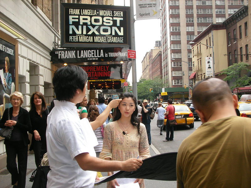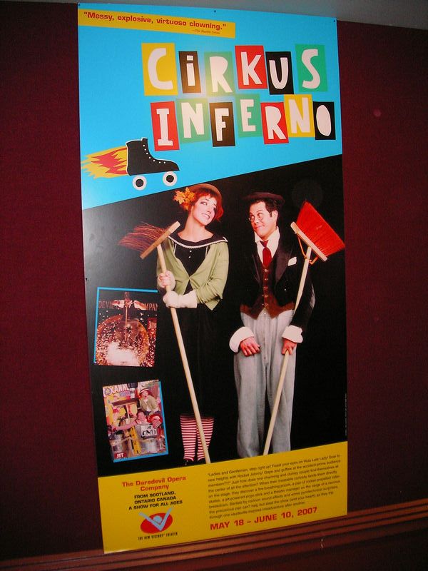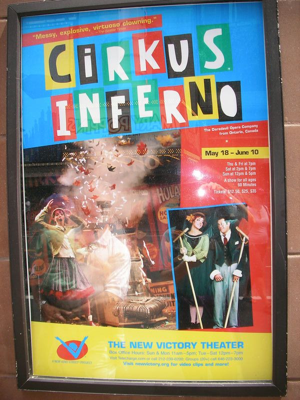 日時:2007年6月5日20:10-21:45 劇場:Linda Gross Theater 料金:65USD/2 + TKTS手数料3USD 座席:ORCH G101(後ろから2列目右端) 演出:Michael Mayer 衣装:Michael Krass シーン:Derek McLane 照明:Jules Fisher and Peggy Eisenhauer 脚本:Keith Bunin 作詞・作曲:Patty Griffin 出演: Molly:Irene Molloy Duane:Matthew Morrison The Man:Skipp Sudduth The Woman:Mare Winningham Synopsis:(Playbill より) Duane and Molly road-trip in an old pick-up truck from the southern tip of Florida to the Northwest corner of New York, with many detours along the way. This new musical explores the pursuit of love and family, and the geography of the American dream. チケットはTKTSで購入したのですが、TKTSの掲示板ではこ の作品にPの表示。これはPLAY(ミュージカルでない)という 意味なので(?_?) やっぱり表示が間違っていたようです。 Spring Awakening と同じ演出家、同じ劇場ということでプレビュー 期間中にも関わらず、上演期間が延長されたとききました。 ここははじめてくる劇場です。 劇場もレンガ造りで元々教会かなんかだったような風情あり。 私が座ったのはF101列、最後列がG列でした。101といっても 客席右端です。TKT購入で65/2+TKTS3 + 35.5USD 確かに劇場は満員、開演10分前には1割くらいしかいなかったのに いったいどこでどうやって沸いて出るのか? 年配の観客多し。 舞台は正方形に近く、右に送電塔の列、左にガスタンクの列、 舞台後方の上方にバンド。 舞台の真ん中には小型トラックがでんと置かれています。 舞台転換の際には黒子さんがよっこらしょとおしてトラックを動か します。 このトラックが、レストランになったり、チェックイン カウンターになったり、 ベッドになったり、トラックになったり するのです。 キャストは4名、ロードムービー形式で、主役カップル が旅をするのにあわせて脇役コンビがさまざまな役に着替えて出てきます。 男がエンジンを届けに行くニューヨークまでのトラック移動に女が 同席します。 ちょっと前にベッドインしたこのカップル、あれは気の迷いだった、 とか女は言い出して男にお預けを食らわすのですが、実は妊娠して いたということが女から男に知らされたところで大きな転機。父親は 確実にその男、男は盛り上がったあげくに、プロポーズ。でも結婚 しようとすると ほんとーにいいのかとケチをつける中年カップルに あったり。 他にもいろいろあってさんざんゆれる気持ち。 でも最後には流産してしまって、男は女を病院に置いたままにげちゃう。 女はおばあちゃんのところで過ごします。 意を決して男が再度プロポーズをして大団円。 いやー随所に泣かせどころがあります。英語がわかるともっと泣ける だろうなあ。そして脇役のおばさん俳優がすごい!見事なまでに キャラクターをかえて登場し、そして朗々と歌いあげるすばらしさ! 何度もショーストップになりました。 このキャストのCDが出たら欲 しいなあ。 セットなどもあまりお金がかかっていませんし、キャスト も4人だけです。こういう小さな舞台をうまく作れてしまうのがニュー ヨークの底力というものでしょう。 暇があれば見て損はありません。劇場も風情があります。 題名:Cirkus Inferno 日時:2007年6月3日12:00- 劇場:The New Victory Theater 料金:ORCH 35USD 座席:ORCH A14(1階2列目センターブロック右端) 制作:Jonah Logan & Amy Gordon 演出:Rene Bazinet 出演: Amy: Amy Gordon Lucky: Jonah Logan Filp: Nate Cooper M. Justa Parfait: Anthony Venisse 子供づればかりです。私の隣のカップルは乳飲み子 と幼稚園くらいの子供二人つれてきてました。 売店には、ピエロの鼻、靴、ブーメラン、ジャグリング ビーンバッグ、等を売ってました。ピエロの鼻は完売、 まあ2USDだからねー、私もあったら買うかも。 ビーンバッグは子供用のとても小さなやつ、ちょっと 投げてみたら子供たちがよってきました。 舞台には左右に箱、背景は古きよき時代?のポスター。 Hound Hades - Alive One Boday 3heads Roxanne Rolls - Heck on Wheels Jet Skates Dynamnite in a short skirt Rocket Johnny - The Human Cannonball Hulalula - The fire queen(これにウクレレぶら下がり) 前説では「Pager もBaby もスイッチオフにしろ!」 巨大ポップコーンを持って2階にクラウン登場。2階から降って くるポップコーン(汗)水鉄砲も持っていて上から水がとんできます。 頭上からポップコーンと水と紙ふぶきを浴びました。 落ちてくるポップコーンをつかんで食べちゃいました。 2階からクラウンたちがポールで滑り降りてきて舞台の開始! 一応しゃべりはありますが、ほとんどないも同然、英語がわから なくてもまったく問題なし。 これからさきは体を張ったコントの連続。目前で爆発がなんどか。 ローラースケートで転んで至近距離でキャストの大股開きも。 最前列っていろいろ起きるなあ。ローラースケートタップ なんてのもありましたよ。 フィナーレは風船が膨らんでいってどっかーん。いろとりどりの チャフが場内充満。 けっこう楽しかったです。子供達が大半の客席も わーわーきゃーきゃー。 題名:Don't Quit You Night Job 日時:2007年6月2日17:35-19:10 劇場:Ha! Comedy Club(163 West 46th Stre