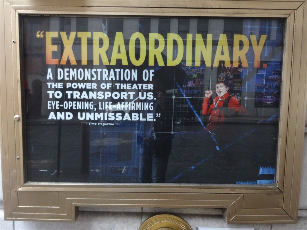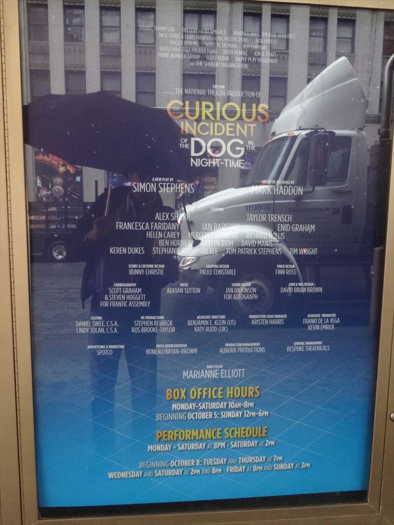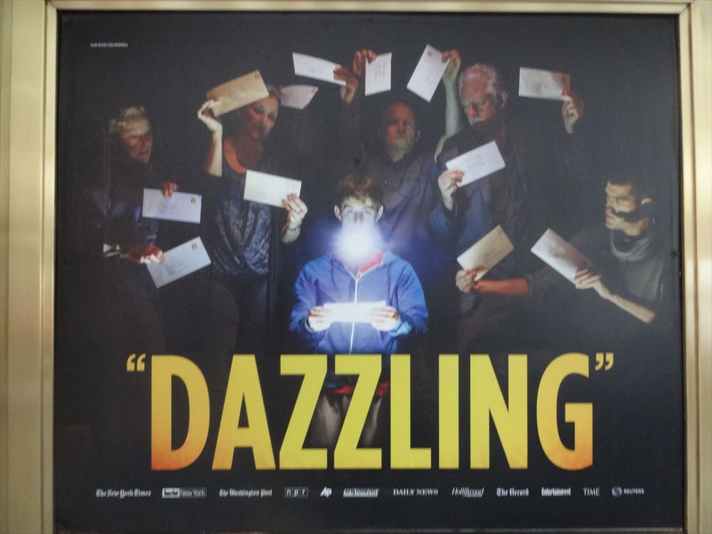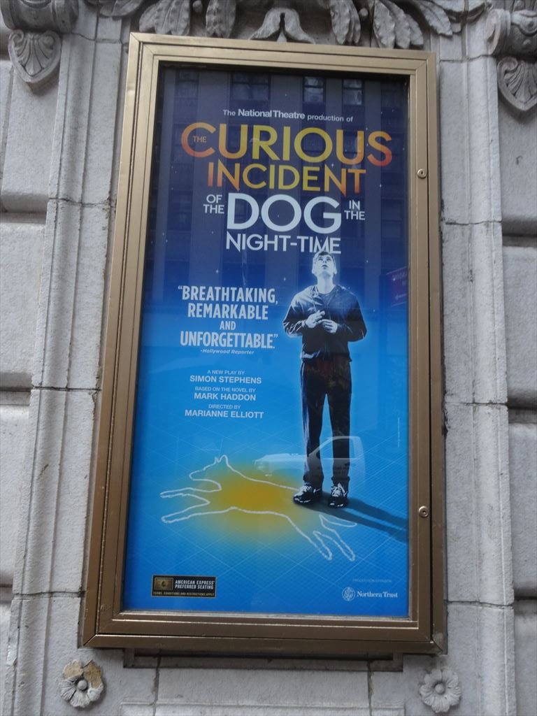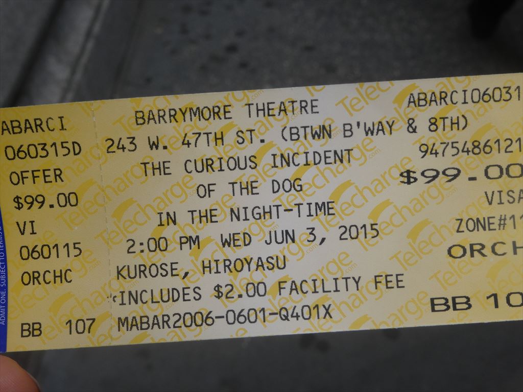 題名:Curious Incident of the Dog in the Night-Time, The 劇場:Ethel Barrymore Theatre 日時:2015年6月3日14:05-16:40(途中休憩あり) 料金:Broadway Box割引 99USD 座席:ORCH BB107(最前列センター) Cast Lists: Alex Sharp(Christopher) TONY Awards(Best Performance by an Actor in a Leading Role in a Play) Taylor Trensch(Christopher [at certain performances]) Francesca Faridany(Siobhan) Ian Barford(Ed) Enid Graham(Judy) Helen Carey(Mrs. Alexander/Posh Woman/Voice Six) Mercedes Herrero(Mrs. Shears/Mrs. Gascoyne/Woman on Train/Shopkeeper/Voice One) Richard Hollis(Roger Shears/Duty Sergeant/Mr. Wise/Man behind Counter/Drunk One/Voice Two) Ben Horner(Mr. Thompson/Policeman 1/Drunk Two/Man with Socks/London Policeman/Voice Three) Jocelyn Bioh(No. 37/Lady in Street/Information/Punk Girl/Voice Five) David Manis(Reverend Peters/Uncle Terry/Station Policeman/Station Guard/Voice Four) Keren Dukes(Ensemble) Stephanie Roth Haberle(Ensemble) Tom Patrick Stephens(Ensemble) Tim Wright(Ensemble) Production Credits: Marianne Elliott (Direction) TONY Awards(Best Direction of a Play) Bunny Christie (Scenic and Costume Design) TONY Awards(Best Scenic Design of a Play) Paule Constable (Lighting Design) TONY Awards(Best Lighting Design of a Play) Ian Dickinson for Autograph (Sound Design) Finn Ross (Video Design) TONY Awards(Best Scenic Design of a Play) Scott Graham and Steven Hoggett (Choreography) Adrian Sutton (Music) Other Credits: Written by: Adapted by Simon Stephens from the novel by Mark Haddon Synopsis: The play tells the story of Christopher, who becomes a suspect when a neighbor's dog is speared with a garden fork. He embarks on a mission to discover the truth about the dog’s untimely death, recording everything in a notebook — even though his father has forbidden it. Drama Desk Awards 各賞受賞 Outstanding Play,Outstanding Actor in a Play(Alex Sharp), Outstanding Director of a Play(Marianne Elliott), Outstanding Lighting Design(Paule Constable),Outstanding Projection Design(Finn Ross), Outstanding Sound Design in a Play(an Dickinson (for Autograph)) TONY賞プレイ作品賞受賞。 舞台はさほど高くないので、最前列でも見切れありません。 四角形で罫線がはいっている舞台。キャストはその片隅にすわり、必要な時に立ち 上がって演技をし、そして時としてマイム等で舞台装置となるのです。そのためか、 ひさかたぶりにプレイから振付賞のノミネートとなりました。ある意味ミニマムな舞台。 壁の罫線がいくつか扉となっており、小道具の鉄道模型の部品がでてきました。 プロジェクションの使い方もシンプルで印象的。 犬の死体があるところから舞台開始、そこから主人公が探偵となります。 主人公が厳密に物事を語るところでもう泣けてきました。 実は私も主人公と多少なりともあいつうじるところがあり、、主人公が世の中の矛盾?に ぶつかるたびに主人公と同じにもどかしくつらくなってしまいます。お父さんは不器用だ けどいいやつでこれまた感情移入してしまいました。みんないい人だけどそれだけでは この複雑な世の中をわたれないんですね。 鉄道線路と駅舎、人のミニチュアがおかれて、勝手に電車が動き始めて一幕終了。 1幕見終わった段階で主演男優賞を確信しましたよ。それくらいにはまり役でした。 探偵物語の1幕と違って2幕はロンドンの母までの冒険譚。 気が付くと後ろの壁に取っ手ができていて、それをよじ登ったかと思うと、今度は階段が できていてそれを歩いて降りてくる。そしてそれはエスカレータに見立てられています。 いろんなギミックがあるなあと感心してたら、後ろの壁全体が前へ迫ってくる! そして前方に溝が開いて地下鉄のホームに!人が多くて怖くてしかたない主人公の気持ち が伝わってきましたよ。 そしてネズミが逃げてホームから線路に飛び込む!文字通り目の前で右往左往するひとたち。 ひかれるかと思ってドキドキした。 ロンドンにきた父ちゃんの台詞に泣かされました。 さすがにこれでいったん戻って数学の試験を受けたいと言うのはわがままだw 俺様規則があるんでしょうね。 最初からぴりぴりしたテンションのまま最後まで突っ走った舞台でしたよ。 カーテンコールになると、主人公の表情ががらりと変わって、普通の明るい笑顔になる のが印象的でしたよ。もうここでTONY作品賞も確信しました。 プロジェクションや人を土台に使った壁歩きなどの振付もありなかなかうまくまとまった 舞台だと思いましたよ。 カーテンコールが終わってみなが帰りかけた、、ところで主人公登場。 そして持ち時間4分で試験に出ていた数学の問題の証明をしてくれました。 実際にかかったのは2分でした。三辺の長さが、 n^2-1, n^2+1, 2n の三角形は直角三角形 になることの証明です。そして最後は天井から紙ふぶき! 素数の席には特別なシートカバーあり。しかし、私の席107も素数のはずだと、真剣に 割り算してしまいました。。 PR