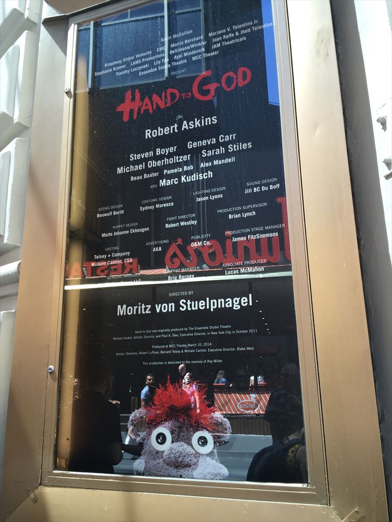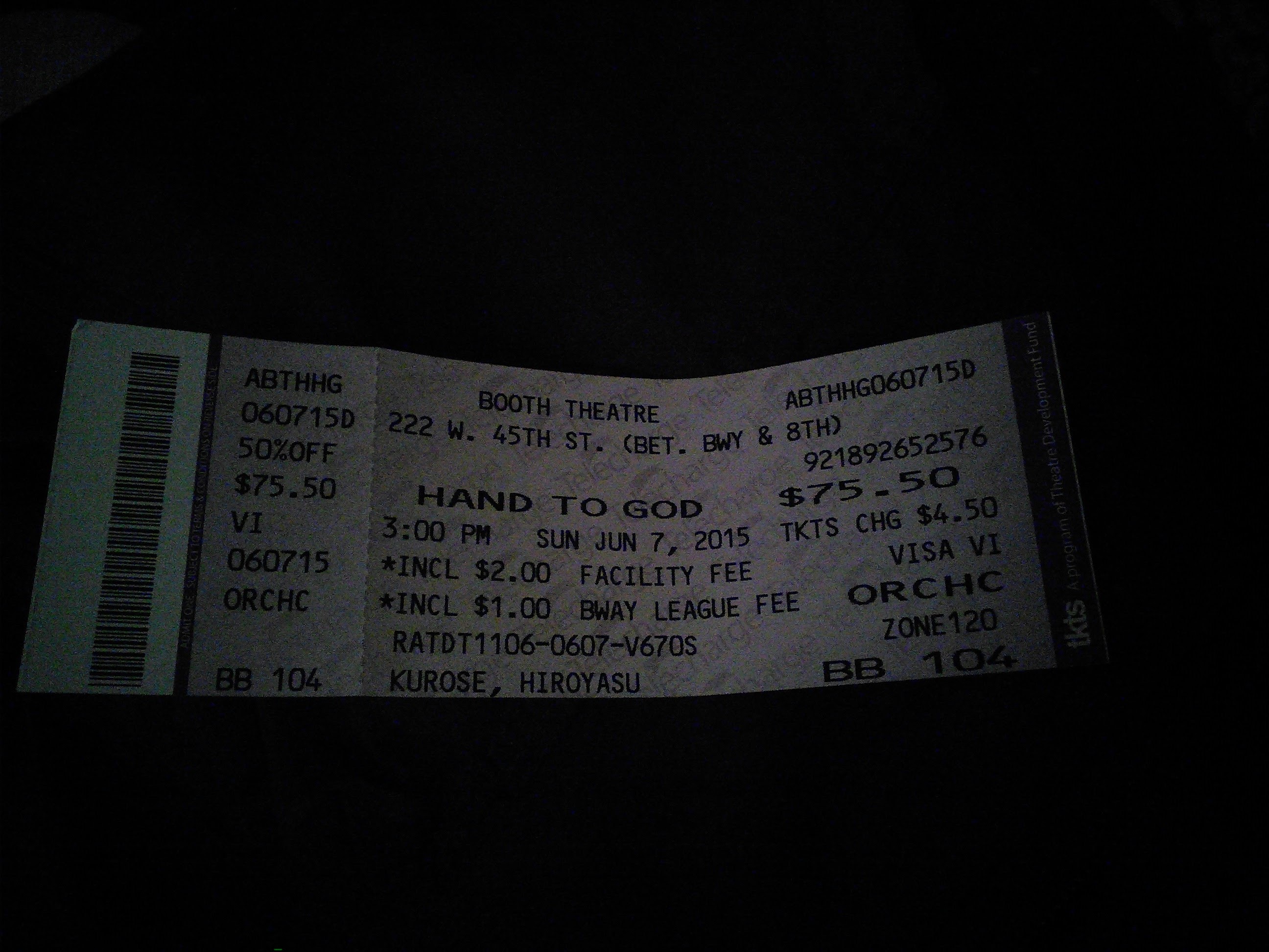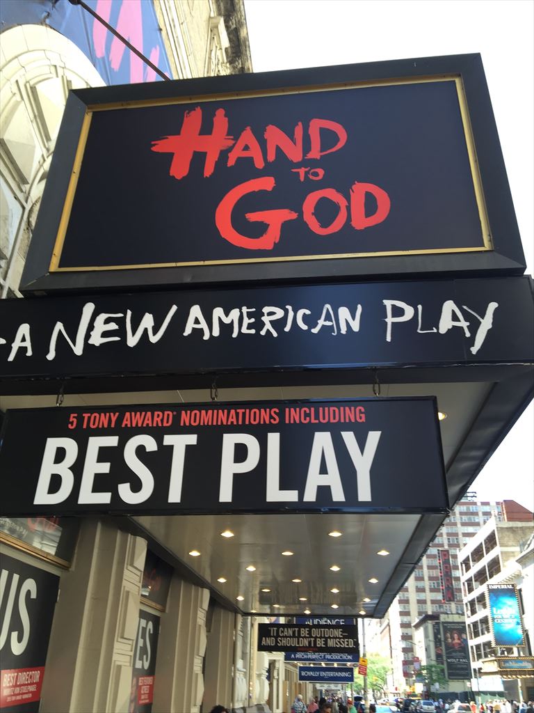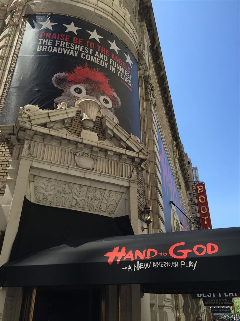 題名:Hand to God 劇場:Booth Theatre 日時:2015年6月7日15:00-17:00(途中休憩あり) 料金:TKTS 75.5USD+ TKTS手数料4.5USD 座席:ORCH BB104(1階2列目センター) Cast List: Steven Boyer - JASON/TYRONE Geneva Carr - MARGERY Marc Kudisch - PASTOR GREG Sarah Stiles - JESSICA Michael Oberholtzer - TIMMY Production Credits: Moritz von Stuelpnagel (Direction) Beowulf Boritt (Scenic Design) Sydney Maresca (Costume Design) Jason Lyons (Lighting Design) Jill BC Du Boff (Sound Design) Marte Johanne Ekhougen (Puppet Design) Other Credits: Written by: Robert Askins Synopsis: The good children of Cypress, Texas are taught to obey the Bible in order to evade Satan’s hand. But when students at the Christian Puppet Ministry put those teachings into practice, one devout young man’s puppet takes on a shocking personality that no one could have expected. The uproarious and provocative HAND TO GOD centers on shy, inquisitive student Jason, who finds an outlet for his burgeoning creativity at the Christian Puppet Ministry in the devoutly religious, relatively quiet small town of Cypress, Texas. Jason’s complicated relationships with the town pastor, the school bully, the girl next door and—most especially—his mother are thrown into further upheaval when Jason’s hand puppet, Tyrone, takes on a shocking and dangerously irreverent personality all its own. HAND TO GOD explores the startlingly fragile nature of faith, morality and the ties that bind us. The New York Daily News says, “HAND TO GOD is bound to leave you sore from laughing. It can’t be outdone—and shouldn’t be missed.” 1階席ほぼ満員。TKTSで2列目センターが出てきました。20分並んだかな。 床が目のたかさなので多少見づらいですが、まあ問題なし。 舞台はどこかの教室のよう、懺悔室らしき場所あり。 Flying high for Jesus、The LORD is my Shepherd というポスターあり。 懺悔室の幕が開くと人形が前口上、これまたダークで笑いがでます、 そして日曜学校の人形劇の練習から物語が始まります。 主人公は気弱なんですが、左手のマペットを1日中つけており、それが まるで生きているかのよう。別に腹話術をしているわけではないのですが、 独自の命があるようにみえてきます。 そのマペットが勝手に彼女に暴言はいておもわずたたきつけ、、、 そうこうするうちに母親は友人とできてしまい、そこのシーンがワイルドで凄い。 人形劇をするとよくないことが起きると主張しますが、母親によって続けるように 強制され、口から人形をやぶってしまいます。 まるでゾンビみたいな形になった人形にベッドの上で起こされ、そこからの一人芝居 *ひとりと一匹*が鬼気迫る演技。。 本当に左手が別に生きていて勝手に意識をもって、主人公の暗黒面が表面化したみたい、。 舞台はくるりと回って教会から外のブランコ、そして車中へと展開します。 母親と寝た友人の耳を、マペットが食いちぎってしまって1幕おわり。 どうなるかどきどき!壮絶な演技です。もうぐずぐずで壮絶、。 これ主演男優賞でもおかしくない。やっぱり笑いにはついていけないところあり。 2幕は別室で耳を縫い合わせるところから始まりました。 元の部屋に戻ると、そこは人形地獄? 人形が刺されたり血塗られたり、 怪しい記号がかかれていたり、いかにも悪魔憑きがやったよう。 悪魔祓いをしに来ますがもちろん返り討ちにあいかけ、、またまた閉じ込めたままで 別室でこれまたあれやこれやお母さん大奮闘、神経衰弱ギリギリの人たち、でもこちら 側にいるだけにより一層すごさが伝わってくるといった感じ。 窓から主人公が思いを寄せていた彼女がグラマラスな人形と一緒に侵入。 譜面台の上でくんずほぐれつ始めてしまいます。 譜面台の上では前戯から始まって体位を変えてと、すごくエネルギッシュに やっているのに、パペットを扱っている人間のほうは本当につまらなそうに やっているギャップがすごい。お子様には見せられないシーンです とうとうパペットに反抗した主人公は乱闘の末、パペットを脱ぎ捨てることに成功、 しかし白い布を手にかけてふいていると、ふたたび手が襲ってきて、、、 それを止めるためにハンマーで自分の左手を強打、最後にはくぎ抜きのほうで 強打しようとしたところ母親が止めて代わりに母親の手を強打。 みんな血みどろになって幕。。。 かと思ったら、そこから大きなパペットが出てきて一人語りが始まりました。 かなーり怖い終わり方でした。万人にはすすめられませんが、よくできた後味悪い 芝居を見たいという方におすすめです! TONYのどれかとってくれないかなーーと願ったのですがだめでしたね。 それにしてもキャスト全員がテンションすごく高くて、血管ブチ切れそうでしたよ。 ほんとにダークで濃密な空間でした。 2時間があっという間に過ぎてしまいました。 PR