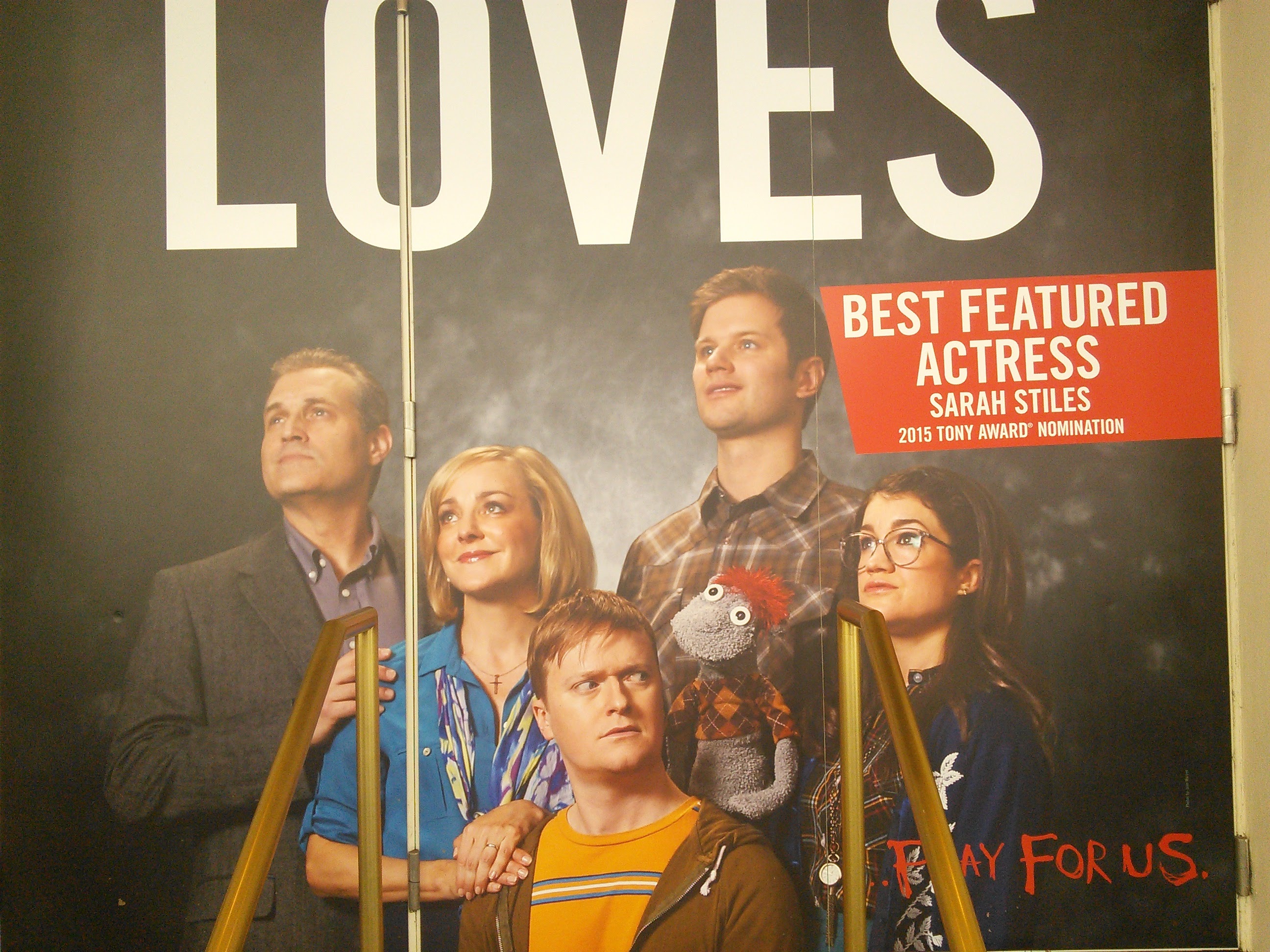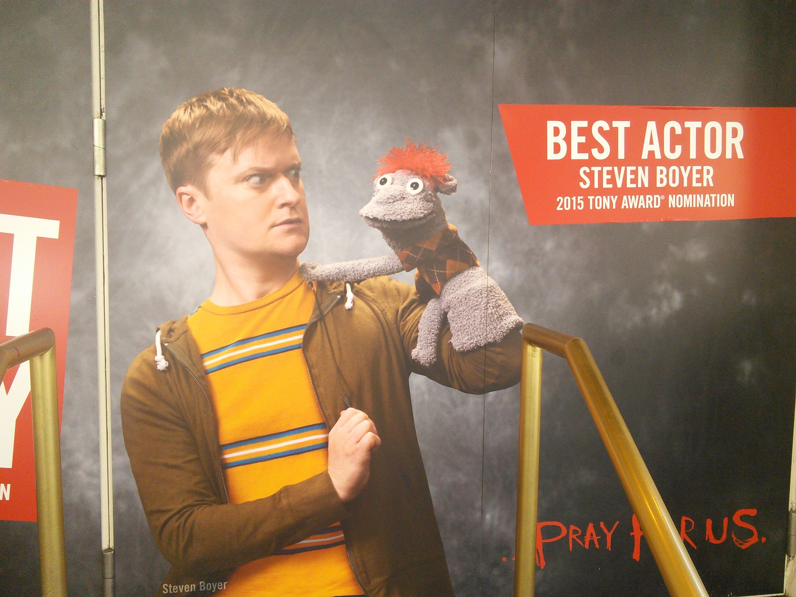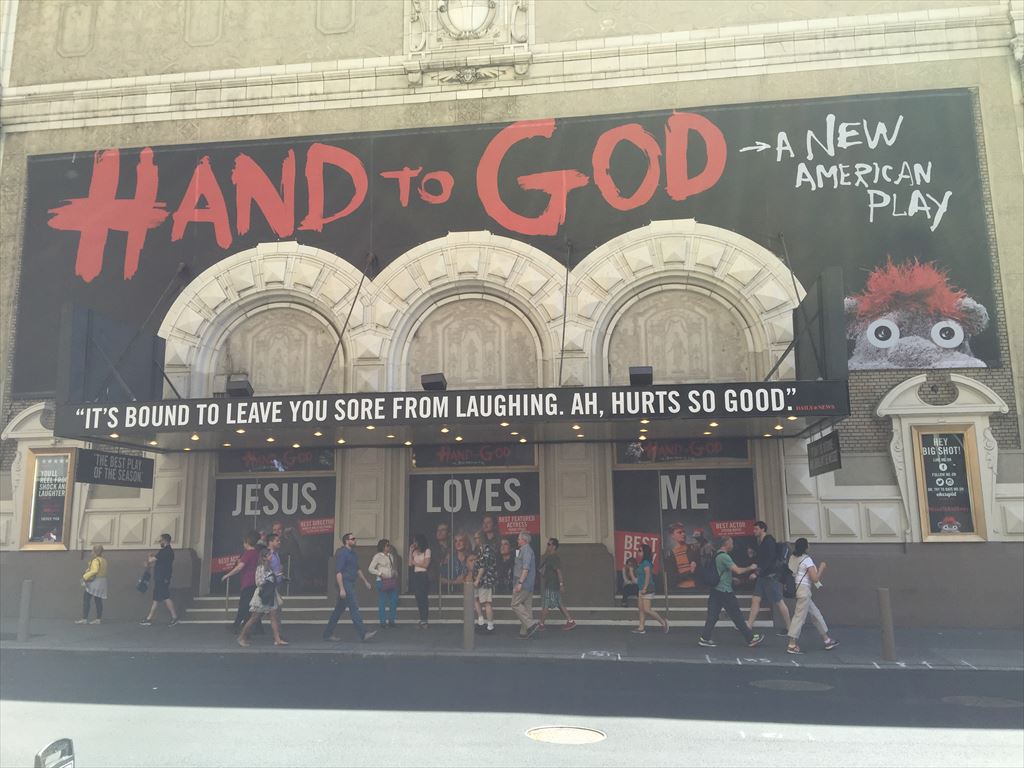 題名:Hand to God 劇場:Booth Theatre 日時:2015年6月7日15:00-17:00(途中休憩あり) 料金:TKTS 75.5USD+ TKTS手数料4.5USD 座席:ORCH BB104(1階2列目センター) Cast List: Steven Boyer - JASON/TYRONE Geneva Carr - MARGERY Marc Kudisch - PASTOR GREG Sarah Stiles - JESSICA Michael Oberholtzer - TIMMY Production Credits: Moritz von Stuelpnagel (Direction) Beowulf Boritt (Scenic Design) Sydney Maresca (Costume Design) Jason Lyons (Lighting Design) Jill BC Du Boff (Sound Design) Marte Johanne Ekhougen (Puppet Design) Other Credits: Written by: Robert Askins Synopsis: The good children of Cypress, Texas are taught to obey the Bible in order to evade Satan’s hand. But when students at the Christian Puppet Ministry put those teachings into practice, one devout young man’s puppet takes on a shocking personality that no one could have expected. The uproarious and provocative HAND TO GOD centers on shy, inquisitive student Jason, who finds an outlet for his burgeoning creativity at the Christian Puppet Ministry in the devoutly religious, relatively quiet small town of Cypress, Texas. Jason’s complicated relationships with the town pastor, the school bully, the girl next door and—most especially—his mother are thrown into further upheaval when Jason’s hand puppet, Tyrone, takes on a shocking and dangerously irreverent personality all its own. HAND TO GOD explores the startlingly fragile nature of faith, morality and the ties that bind us. The New York Daily News says, “HAND TO GOD is bound to leave you sore from laughing. It can’t be outdone—and shouldn’t be missed.” 1階席ほぼ満員。TKTSで2列目センターが出てきました。20分並んだかな。 床が目のたかさなので多少見づらいですが、まあ問題なし。 舞台はどこかの教室のよう、懺悔室らしき場所あり。 Flying high for Jesus、The LORD is my Shepherd というポスターあり。 懺悔室の幕が開くと人形が前口上、これまたダークで笑いがでます、 そして日曜学校の人形劇の練習から物語が始まります。 主人公は気弱なんですが、左手のマペットを1日中つけており、それが まるで生きているかのよう。別に腹話術をしているわけではないのですが、 独自の命があるようにみえてきます。 そのマペットが勝手に彼女に暴言はいておもわずたたきつけ、、、 そうこうするうちに母親は友人とできてしまい、そこのシーンがワイルドで凄い。 人形劇をするとよくないことが起きると主張しますが、母親によって続けるように 強制され、口から人形をやぶってしまいます。 まるでゾンビみたいな形になった人形にベッドの上で起こされ、そこからの一人芝居 *ひとりと一匹*が鬼気迫る演技。。 本当に左手が別に生きていて勝手に意識をもって、主人公の暗黒面が表面化したみたい、。 舞台はくるりと回って教会から外のブランコ、そして車中へと展開します。 母親と寝た友人の耳を、マペットが食いちぎってしまって1幕おわり。 どうなるかどきどき!壮絶な演技です。もうぐずぐずで壮絶、。 これ主演男優賞でもおかしくない。やっぱり笑いにはついていけないところあり。 2幕は別室で耳を縫い合わせるところから始まりました。 元の部屋に戻ると、そこは人形地獄? 人形が刺されたり血塗られたり、 怪しい記号がかかれていたり、いかにも悪魔憑きがやったよう。 悪魔祓いをしに来ますがもちろん返り討ちにあいかけ、、またまた閉じ込めたままで 別室でこれまたあれやこれやお母さん大奮闘、神経衰弱ギリギリの人たち、でもこちら 側にいるだけにより一層すごさが伝わってくるといった感じ。 窓から主人公が思いを寄せていた彼女がグラマラスな人形と一緒に侵入。 譜面台の上でくんずほぐれつ始めてしまいます。 譜面台の上では前戯から始まって体位を変えてと、すごくエネルギッシュに やっているのに、パペットを扱っている人間のほうは本当につまらなそうに やっているギャップがすごい。お子様には見せられないシーンです とうとうパペットに反抗した主人公は乱闘の末、パペットを脱ぎ捨てることに成功、 しかし白い布を手にかけてふいていると、ふたたび手が襲ってきて、、、 それを止めるためにハンマーで自分の左手を強打、最後にはくぎ抜きのほうで 強打しようとしたところ母親が止めて代わりに母親の手を強打。 みんな血みどろになって幕。。。 かと思ったら、そこから大きなパペットが出てきて一人語りが始まりました。 かなーり怖い終わり方でした。万人にはすすめられませんが、よくできた後味悪い 芝居を見たいという方におすすめです! TONYのどれかとってくれないかなーーと願ったのですがだめでしたね。 それにしてもキャスト全員がテンションすごく高くて、血管ブチ切れそうでしたよ。 ほんとにダークで濃密な空間でした。 2時間があっという間に過ぎてしまいました。 PR