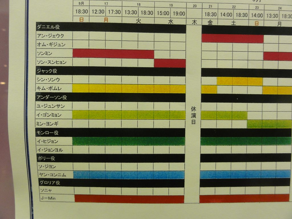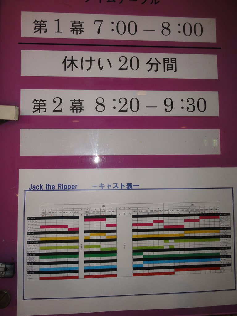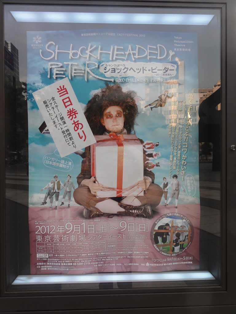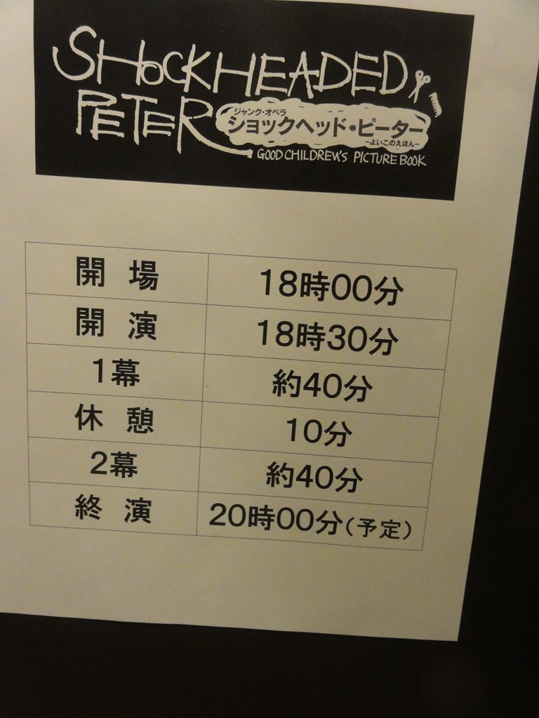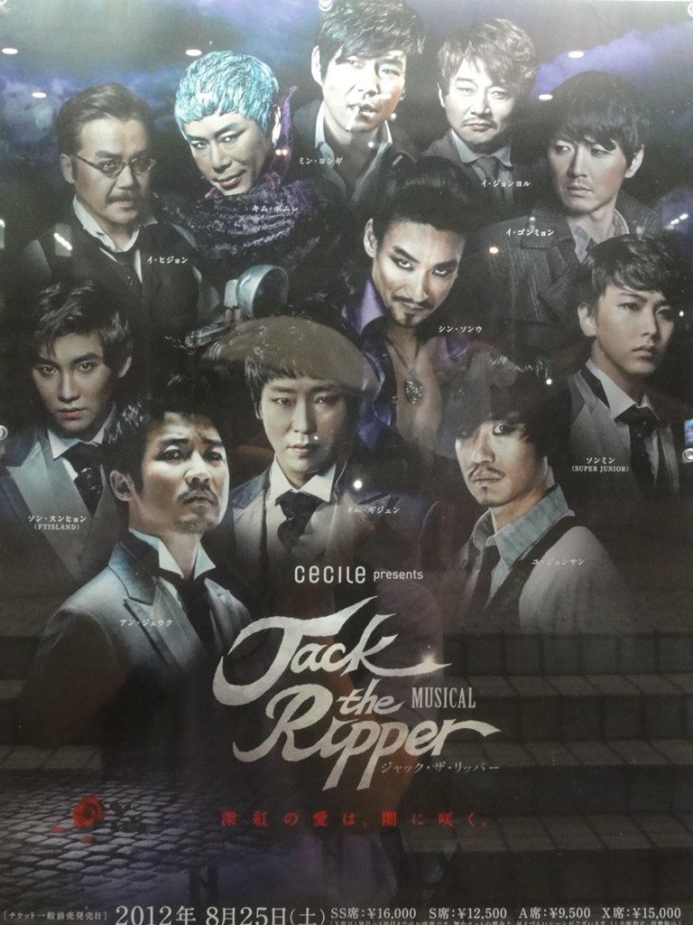 題名:Jack the Ripper 日時:2012年9月19日19:00-21:30(途中休憩あり) 劇場:青山劇場 料金:X席15000円 座席:1階XC列25番(2列目中央) プロデューサー:キム・ソンミ 演出・脚本:ワン・ヨンボム 音楽監督:イ・ソンジュン 振付:ソ・ビョング 出演: ダニエル:ソン・スンヒョン ジャック:キム・ボムレ アンダーソン:イ・ゴンミョン モンロー:イ・ヒジョン ポリー:ヤン・コンニム グロリア:J-Min 韓流ミュージカルです。 初めて見るのに良席で字幕付きで見れてラッキー♪ と思っていたのですが、オープニングから少しすると 既視感が襲ってきました。1幕なかほどではそれが確信に、、 数年前にソウルで見ていたのでした。ああ自分の記憶 が情けない Orz ジキルとハイドかと思うようなシーン多数。ダニエルと ジャックが心を交換して戦うところなど、Confrontation を彷彿とさせます。 ダニエルはイケメンだし、グロリアはかわいいし、 字幕なしで見たときはどうしてダニエルとジャックが契約 を交わしたのかわからなかったのが明瞭になってすっきり。 これだけ良い席ですから、ダンスも歌も迫力満点。 カーテンコールでは観客が総立ちでまるでコンサートの アンコールのような状況。韓流コンサートといってもいいの かもしれませんね。 PR 題名:ミュージカル・ロマンス『ダディ・ロング・レッグズ~足ながおじさんより~』 劇場:日比谷シアタークリエ 日時:2012年9月15日13:00-15:45(途中休憩あり) 料金:9000円 座席:5列18番(5列目センターブロック右より) 音楽・作詞/ポール・ゴードン 原作/ジーン・ウェブスター 翻訳・訳詞/今井麻緒子 脚本・演出/ジョン・ケアード 出演: ジルーシャ:坂本真綾さん ジャーヴィス・ペンドルトン:井上芳雄 登場人物二人だけのミュージカルです。あまりに評判が良いので 見にきてみました。結果はとても良い! セットは書斎と窓、舞台の左後方がバンド。 ヒロインは舞台の前方で箱やスーツケースをもとに一人芝居、 ジャービスは書斎机に座って手ジルーシャからの紙を読むのです。 基本的にはすべて手紙の朗読とその感想。生き生きしたヒロイン がとても魅力的。ジャーヴィスはは最初からかなりデレてますね ダディであることを隠して本名で大学に行くところが1幕のクライ マックス。聞いていてわくわくする曲ばかり。 客席はほとんどが妙齢の女性。幕間のトイレがすごいことにな てました。 後半は彼氏と言い争いから、卒業式、そしてクライマックスへ 出会って、ヒロインが年寄りでもハゲでもないことを許すまでw 当初は歌が終了するたびに拍手が起きていましたが、後半になる と歌の後に間があっても拍手は無し。物語に皆でのめりこんでい た感じ。ダディの帽子欲しい。 久々にまた見たいと思った舞台となりました。 カーテンコールではあしなが育英会に対する寄付を募っていました。 私も募金箱へ折りたためるお金を、、 そしてうちへ帰ったのち、あしなが育英会への定期的な寄付を 始めました。 しかし、、この劇場何か変になってませんか? 客席に座ったとたんに涙がでつづけて鼻がつまる。。 最初は感動して泣いているのだと勘違い。。 題名:門仲ジャグリングナイト Vol.17 劇場:門仲天井ホール 日時:2012年9月14日 18:30-20:00 料金:招待券でみました 座席:中央まんなかあたり 出演: 目黒陽介、 コルセ、 Tiger & Dragon & Bunny、 カーキ、 矢巻菜央, Arlon Children 門仲天井ホールがクローズされるということで最終回、残念! シガーの子達はさわやかで初々しい。楽しさがあふれる感じ。 コルセは楽しい、音ピタというか音にあうパフォーマンス。 Tiger & Dragon & Bunnyがすごかったのは足技! 私は『本を読めコノヤロウ』に乱入。いやー緊張で頭真っ白ですw 語るだけなら大丈夫と思っていたのにダメなもんですねえ。 ぐだぐだになってしまいましたが、観客の皆さんの温かい眼差しに 救われました。 最後の目黒さんがアーティスティックでかっこよかった。 題名:ジャンク・オペラ『ショックヘッド・ピーター ~よいこのえほん~』 日時:2012年9月5日18:30-20:10 劇場:東京芸術劇場シアターイースト 料金:4000円 座席:最前列左端 劇団:劇団オルケーニ(ハンガリー) 作:ジュリアン・クラウチ/フィリム・マクダーモット/タイガー・リリーズ(音楽) ハンガリー語版翻案:パルティ・ナジュ・ラヨシュ ハンガリー語版演出:アシェル・タマーシュ 解説: 泣く子もよろこぶ?!コワかわいさ! シュールなブラック・ユーモア満載のミュージカルが、東欧ハン ガリーから芸劇へ!例年7月~8月にかけて、日本各地を巡回する 形で実施してきたTACT/FESTIVAL。今年は芸劇リニューアル・オー プンに合わせ、野田秀樹芸術監督が親子で楽しめる作品をセレク トしたスペシャル・バージョンとして開催します。 「ショックヘッド・ピーター~よいこのえほん~」は、イギリス で1998年にUKパンクバンド「タイガー・リリーズ」等が初演し世 界ツアーで大ヒットしたミュージカル「Shockheaded Peter(ショッ クヘッド・ピーター)」を、2009年、劇団オルケーニが大胆に