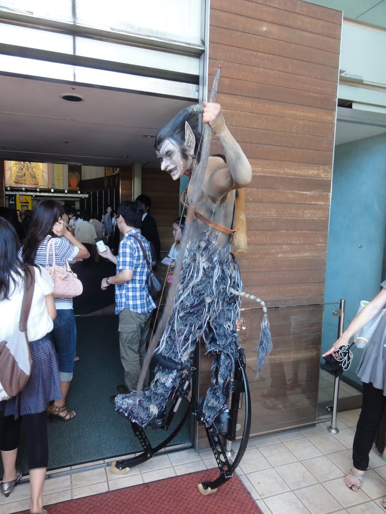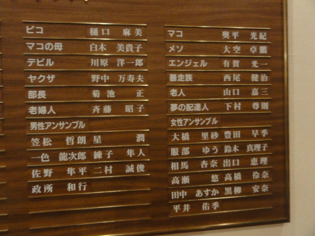 題名:怪談 牡丹燈籠 劇場:紀伊国屋ホール 日時:2012年8月24日15:00-17:10(途中休憩あり) 料金:6300円 座席:D列11番(3列目中央) 劇団:人形劇団プーク 原作:三遊亭円朝 脚色:川尻泰司 潤色・演出/井上幸子 人形美術/若林由美子 装置/朝倉 摂 音楽/マリオネット(湯淺 隆・吉田剛士) 照明/山内晴雄 音響効果/吉川安志 舞台監督/栗原弘昌 制作/清水治信 宣伝美術/百鬼丸 所作指導/八光亭春輔 出演: 佐藤達雄、安尾芳明、大橋友子、滝本妃呂美、柴崎喜彦、 市橋亜矢子、栗原弘昌、野田史図希、山越美和、井上彩香、有田智也 最前列をつぶして舞台としており、舞台奥は客席に向かう形の 斜面になっています。 人形の頭は人の頭より大きく、4頭身程度のデフォルメされた形で、 基本的には一人で1体を操って行きます。走るシーンなどは足役と 体役の二人一役。人間は全て黒子で、黒子が台詞を喋っています。 このような人形を見るのは初めてだと思います。 今回のは全てが人形というバージョン。 以前は噺家役は人間が演じていたそうですね。 最初に狂言回しの円朝と主要な女性の登場人物が出てきて紹介、 みんな色っぽい。 結ばれるシーンはシルエットで人形のマグワイが。。 父親が巨人で出てきたのはびっくり。そして切られて首が宙を 飛ぶ!人形ならではの演出。なんだか新八犬伝見てる気分。 そして出てくる亡霊の人形は足がない。 リアル人形は外を歩くときは履物を履いていて、うちにあがる ときはちゃんと脱ぎます。履き物脱ぎサポート黒子もいました。 顔が微妙にくずれていてなにやら壮絶な色気あり、 明るくかわいいメイクと幽霊になった後の青一色の鋭いメイク の対照さが印象的でした。 2幕の初めはお札はがしの交渉から。 おみねのたくましさと庶民伴蔵の情けなさがとてもよく出てる。 お札をはがすと、格子が1本とれた所からするするっとはいり こんでとり殺し!!ここで顔が変われば本当に八犬伝かも、 と思ってしまいましたよ。 もうこのあたりから普通の演劇を見ている気分。 完全に人形に感情移入してみてました。引っ越した後はおみね が不憫ですねえ。殺したら幽霊となってお礼参りにくるのが必 然ということもわからない伴蔵の抜けさ加減といいましょうか。 ほんのちょっと顔を傾けただけで、表情が変わってみえるのは 能や獅子舞に通じるものがあるのでしょう。 全般的に台詞に説得力があるのです。 これは初演のリアル噺家さんとのコラボを見たかった。 違う世界を垣間見た気分でしたよ。 PR 題名:夢から醒めた夢 劇場:四季劇場「秋」 日時:2012年8月23日13:30-15:50(途中休憩あり) 料金:S席8000円 座席:1階4列センター 劇団:劇団四季 作・演出: 原作:赤川次郎(角川文庫版「夢から醒めた夢」) 演出:浅利慶太 台本:浅利慶太、奈良和江 作詞:奈良和江、浅利慶太 作曲:三木たかし、宮川彬良(マコの物語/ここは霊界空港) 振付:加藤敬二、謝珠栄(二人の世界/暴走族/ヤクザ/誰でもないあたし) 照明:吉井澄雄 装置:土屋茂昭 衣裳:大栗未来 音楽監督:渋谷森久 編曲:佐橋俊彦、三宅一徳 出演: 解説: 好奇心旺盛で元気な少女ピコは夢の配達人に導かれるまま閉園後 の遊園地に入り、そこで幽霊の少女マコと知り合います。 交通事故で命を落としてしまった心優しいマコ。娘の死から立ち 直れずにいる母親を慰めお別れを言うために、一日入れ代わって くれる人を探して夜の遊園地をさまよっていたのです。不思議な ことにあこがれるピコは、マコの願いを聞き入れて代わりに霊界 へ行くことを決めます。 霊界空港の待合室では新任の役人デビルとエンジェルら空港職員 が働いています。"光の国"行きロケットに乗ることが許されてい るのは、真っ白のパスポートを持ったもののみ。遅れてくる妻を 12年間待ち続けている老人や、災害や戦争の犠牲になって死んだ 子どもだちがその日を待ちわびています。 いじめを苦にして自殺したメソ、家族を顧みないで過労死した部 長、バイク事故で恋人もろとも死んだ暴走族、ケンカで刺し殺さ れたヤクザは、生前に罪を犯したり人を悲しませたためにグレー のパスポートしかもらえず、働きながら罪の汚れが洗い流される のを待っていました。 明日は年に一度の"光の国"行きロケット707便が出発する日。マ コから預かった白いパスポートが入ったバックをメソに預けて、 ピコは707便ロケットを見に行きます。 待合室に戻ってきたピコは、メソに預けていたバックを部長から 受け取ります。パスポートを取り出すものの、いつの間にかグ レーから真っ黒に…。マコが地獄に堕ちてしまうと思い込んだピ コはショックで気絶してしまいます。 ピコは人間界へ戻ることができるのでしょうか?マコは無事に "光の国"へ旅立つことができるのでしょうか? --------------------- 二十年ぶりくらいの夢から冷めた夢、四季劇場にくるのもライオン キング初日以来のはず。ロビー入口がなんだかかわいくなっていま した。まるでカーニバルの入口みたい、。 そしたら本当にはじまりまし