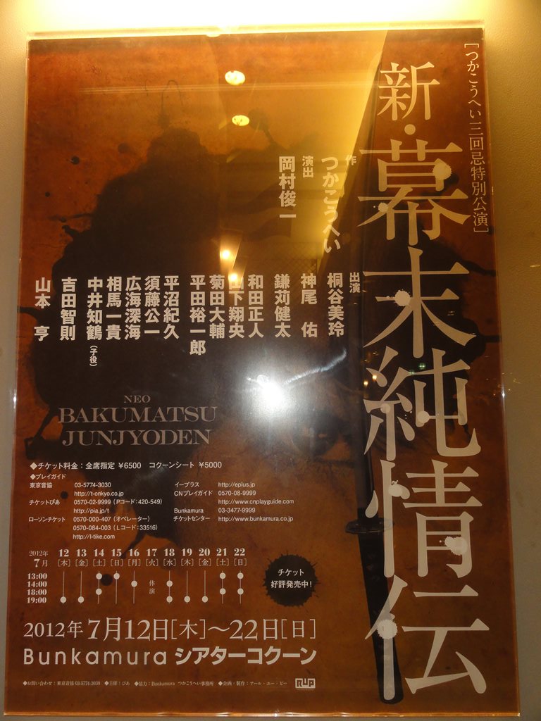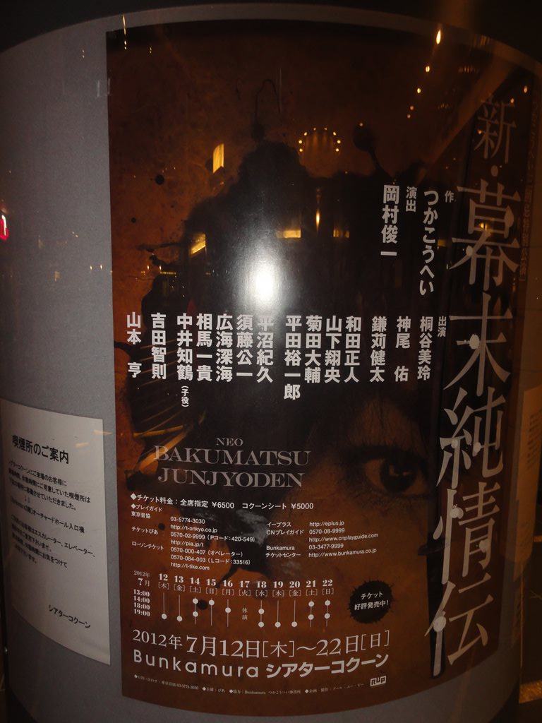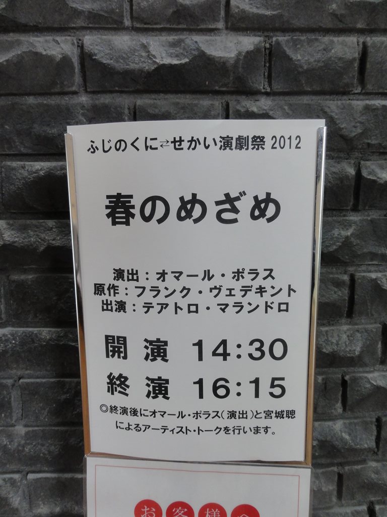 × [PR]上記の広告は3ヶ月以上新規記事投稿のないブログに表示されています。新しい記事を書く事で広告が消えます。 題名:ウエスト・サイド・ストーリー 劇場:東急シアターオーブ(渋谷ヒカリエ11階) 日時:2012年7月18日19:00-21:30(途中休憩あり) 料金:A席10000円 座席:3階席1列目センターブロック 脚本&ブロードウェイ・リバイバル演出:アーサー・ローレンツ 音楽:レナード・バーンスタイン 作詞:スティーブン・ソンドハイム 初演時演出・振付:ジェローム・ロビンス ツアー演出:デイヴィッド・セイント 振付再現:ジョーイ・マクニーリー 出演: Tony:ROSS LEKITES Maria:EVY ORTIZ Anita:MICHELLE ARAVENA Riff:DREW FOSTER Bernardo:GERMAN SANTIAGO 初めてのヒカリエ、初めてのシアターオーブ、 そして今晩はシアターオーブのオープニンナイトでした。 ロビーにおたち台のようなものができて、報道関係者が ゲストに群がっていました。 劇場はヒカリエの11階から上にあります。まずは11階に 上ると広いロビー、そこにはカフェ。入場前にお祝いに 泡で乾杯! そこからエスカレーターで13階にあがり、劇場入り口に。 球体形状の客席外側が見える、近未来風のロビーです。 でも大人数が同時に出るとさばけるのかなあ。とにかく 劇場のつかみはおっけー。 今回は3階席、エスカレーターをずーーーーと上がって、 客席にはいってびっくり、3階席は傾斜がかなり急、そ のうえ目の前の手すりが低いのです。ちょっと前に乗り だしたら1階まですとんと落ちてしまいそう。高所恐怖 の気味がある人は3階前方は避けた方がよいでしょう。 私はかなり、、、 そのかわり舞台は全体が見やすく意外と近くに見えます。 前奏曲が始まった段階でもうわくわく。あまりにも有名 な曲なので何度聞いたことかわかりませんが、それゆえ 脳内にいろんな刺激がくるようです。 舞台の第一印象、みんなかわいい!若いっていいわねえ。 トニーは田舎からぽっと出の好青年という雰囲気、 マリアはしっかり世間知らずのおじょうちゃん。皆すごい お子様な雰囲気で、たしかにこの作品て抑圧されている 子供同士が同士討ちをしてしまうという悲劇だったのだな あとあらためて思いました。社会の底辺で折りたたまれた 子供たちが、あらぬ方向へ熱意をほとばしらせてしまって いる雰囲気が良く出ていました。トニーはかっこよくて 透明感溢れる声で、彼らの中では年上、でもお子様なの で盲目な方向に走ってしまうというのが自然で素晴らしい。 子供たちの中で唯一大人だったのがアニタ、凄い存在感、 あねさんかっこいいです。 それにしてもジェームスロビンスの振付は良い!3階最 前列だと振付がはっきり見えるのが嬉しいです。クールを 見ていて熱くなりました。さほど広くない空間を駆け回る 躍動感は素晴らしいものがありました。 おなじみの曲もみな嬉しく、こけら落とし公演を存分に 楽しめました。 PR 題名:新・幕末純情伝 日時:2012年7月13日19:00-21:20 劇場:シアターコクーン 料金:招待券でみました(定価6500円) 座席:1階後方N12(後方センター) 作:つかこうへい 演出:岡村俊一 音響:山本能久 照明:松林克明 衣裳:山下和美 舞台監督:荒 智司 宣伝美術:榎本太郎 制作:藤井 佳 プロデューサー:菅野重郎 http://www.rup.co.jp/information/images/2012bakumatsu.jpg 出演: 沖田総司:桐谷美玲 坂本龍馬:神尾 佑 土方歳三:鎌苅健太 岡本以蔵:和田正人 山下翔央、菊田大輔、平田裕一郎、平沼紀久、須藤公一、 広海深海、中井知鶴(子役)、吉田智則、相馬一貴、山本 亨 客層はいろいろ混ざっている感じ。 新撰組の沖田総司は女であり、天皇の落とし胤だったという設定で、 新撰組の中に入って活躍する女を演じるのは女優の桐谷美玲。 キャストが比較的若いプロダクションですが、よく頑張っている ように見えます。最初の殺陣はどうなるかと思いましたが、物語 が進むにつれてよくなっている感あり。 なんだか竜馬が筧さんに見えるのですが、記録をたどってみると この舞台が純情伝の初見になるはず。いったい何のデジャブ? 殺陣はよくからだが動くイケメンぞろい。 みているうちに筋書を知っているような既視感に捕らわれました。 色々政治的なネタも仕込んでいたんだろうな。初演を見たかった ものです。しかし落ちのわからなさは何? コクーンだとちょっと広すぎると思ったのは後方からみていたせ い?もっとも殺陣などは全体を見渡せてよかった。 それにしても暗いと見えない!目がみるみる悪くなっているのを 痛感した舞台。 題名:春のめざめ 日時:2012年7月1日14:30-16:20(17時までポストトーク) 劇場:静岡芸術劇場 座席:1階K列右側サイド(3列目) 料金:前売り3500円 解説:(公式Webより) 「赤ちゃんはどうやったらできるの?」 性にめざめ始めた子どもたちの悲劇 「子どもたちの悲劇」というサブタイトルを持つ本作は、性にめざめ始めた10代の少年少女の姿を赤裸々に描くと同時に、彼らを取り巻く無理解な大人たちや、19世紀末の抑圧的な道徳観を痛烈に批判した社会風刺劇です。ストレートな性