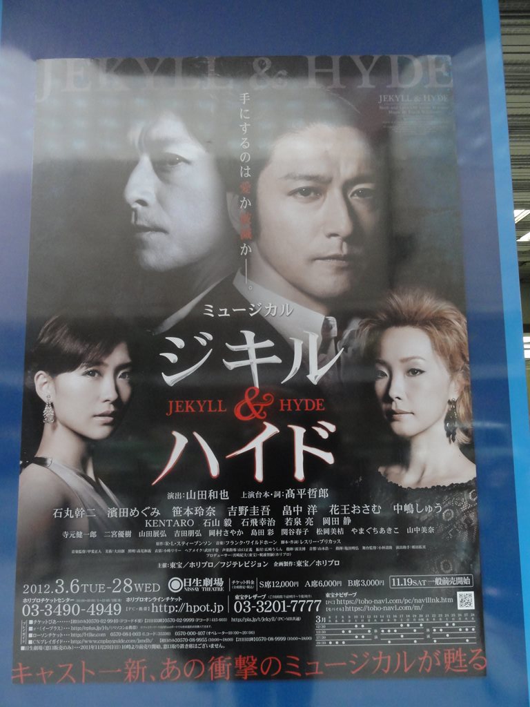 題名:7DOORS ~青ひげ公の城~ 劇場:東京グローブ座 日時:2012年3月31日13:00-? 料金:招待券でみました(S席9500円) 座席:1階N-7(1階後方左端近く) 出演: ユディット……水 夏希 傲慢 pride……中山祐一朗 怠惰 sloth……石橋 祐 憤怒 wrath……菅原永二 肉欲 lust……Spi 暴食 gluttony……オレノグラフィティ 嫉妬 envy……伊藤ヨタロウ 強欲 greed……陰山 泰 青ひげ公……SUGIZO 構成・演出……鈴木勝秀 音楽……SUGIZO 美術……二村周作 照明……原田 保 音響……井上正弘 衣裳……原まさみ ヘアメイク……鎌田直樹 演出助手……菅田恵子 舞台監督……幸光順平 本作品は、作曲家バルトークの唯一のオペラ『青ひげ公の城』の世界観を新たな舞台劇として誕生させる作品になっている。 主演は元宝塚歌劇団雪組トップスターで、退団後は女優だけでなく男性とのユニット「Guys From The Earth」のアーティストMizとしても、歌・ダンスのライブパフォーマンス、TV・舞台と幅広いジャンルで活躍中の水 夏希。 LUNA SEA、X JAPANのメンバーであり、またソロアーティストとしても2011年12月にはアルバムをリリースし、世界的に活躍するSUGIZOの楽曲。 そして、『青ひげ公の城』を新たに再構成し演出するのはストレートプレイからミュージカルまで、幅広く手掛ける鈴木勝秀。 それぞれの異なるフィールドで活躍してきた3人が織り成すこの作品がどのように出来上がるのか……ご期待下さい! ユディットは青ひげ公の異名を持つ公爵から結婚を申し込まれた。彼女は公爵の悪い噂を知る兄弟の反対を押し切り、何かが隠されているという「7つの扉」の中を見たいという願望から結婚を承諾する。 公爵の執事に付き添われながら拷問部屋・花園・領土などの部屋を1つ1つ開けるユディットは、そこで謎の男たちに出会う。 彼らは一体何者なのか? なぜ、この城に居るのか? 彼らの言う「7つのコレクション」とはなにか? そして、彼らは何を意味しているのか・・・。 ユディットはなかなか姿を見せてくれない公爵への想いをはせながら歩を進め、7つ目の扉を開ける。 この最後の扉を開いた時、青ひげ公が「7つのコレクション」に託した「7つの扉の」理由が明らかになる。 真相を知ったユディットはその後どう行動するのか? 衝撃的なクライマックスを迎える! ーーーー 照明も暗く、いかにもこれから不条理しますよ!というセット。 オープニングのSUGIZOさんがバイオリンと共に登場する シーンはとても絵になっていた。めっちゃかっこいい。 水 さんの生着替えが見えるとはびっくり。 物語はおどろおどろしいシーンの連続、7つの扉をじゅんぐり にあけていくわけですが、3つ目くらいで雰囲気がかなり 単調な感じに。でも扉ごとに配置された役者によって おもしろかったり、それほどでもなかったり。。 水さん一人芝居で、後ろでSUGIZOさんが演奏、の方が より楽しめたかもしれません。 PR 題名:「メヴラーナ旋回舞踊」東京公演 劇場:渋谷区文化総合センター大和田・さくらホール 日時:2012年3月26日19:15-21時頃まで 料金:1000円 座席:1階2列11番(2列目センターブロック) 劇団: トルコ文化観光省所属 コンヤ・メヴラーナ楽団 作・演出: 出演: 解説:(トルコ航空Facebookより) 「メヴラーナ旋回舞踊」は、13世紀の神学者メヴラーナ・ ジェラーレッディン・ルーミーの教えに由来する神秘的な 踊りで、トルコの伝統音楽の調べに乗せて、踊り手は無我 の境地の中、コマのように回転していきます。2005年には 「メウレウィー教団のセマの儀式」として、ユネスコの無 形文化遺産にも指定されました。 公演者 トルコ文化観光省所属 コンヤ・メヴラーナ楽団 メヴラーナ・ジェラーレッディン・ルーミーは、1273年に 没するまで、主にコンヤで活躍した神学者で、哲学、思想、 文学等の面で世界的に大きな影響を残しました。本公演で は、メヴラーナの本拠地コンヤから、トルコ文化観光省所 属の楽団が来日し、東日本大震災から1年を経た日本の皆さ まに向けて、荘厳で幻想的な舞台をお届けします。 ------------ さくらホールにくるのは初めて。 こんな立派なビルができていたんですねえ。全然知りませんでした。 トルコ旅行の際に見逃した旋回舞踊が日本で見れるとなってわくわく。 場内は満員です。 アナウンスが日本語とトルコ語ではいっています? まずはバンド演奏。なんか心が平穏になるいい感じです。 そしてお待ちかねの旋回舞踊!最初は手を組んでいて くるくる回るうちに手がほどけて天と地をさす感じ? 次々と回るのを見ていると何か催眠にはいってしまいそう。 題名:ジキル&ハイド 日時:2012年3月25日12:30-15:25(途中休憩あり) 劇場:日生劇場 座席:GC席B列56番(中2階右より後列) 料金:S席12000円 出演: ヘンリー・ジキル/エドワード・ハイド:石丸幹二 ルーシー・ハリス:濱田めぐみ エマ・カルー:笹本玲奈 アターソン:吉野圭吾 ストライド:畠中 洋 執事プール:花王おさむ ダンヴァース卿:中嶋しゅう 演出: 山田和也 上演台本・詞: 髙平哲郎 原作: R・L・スティーブンソン 音楽: フラン