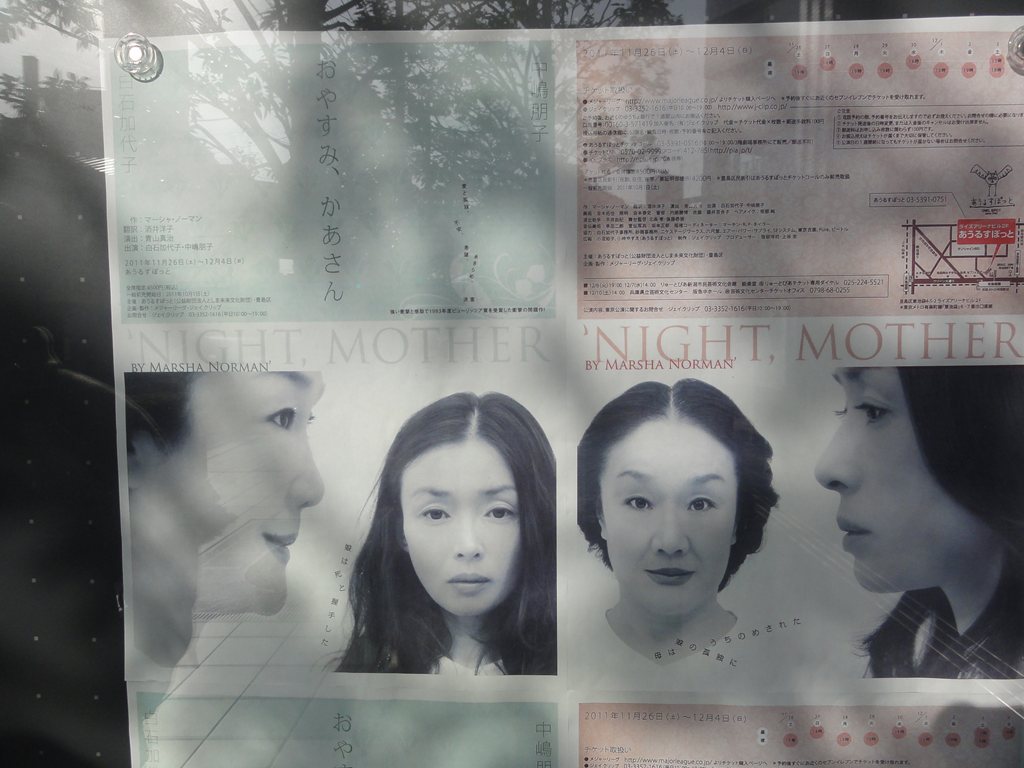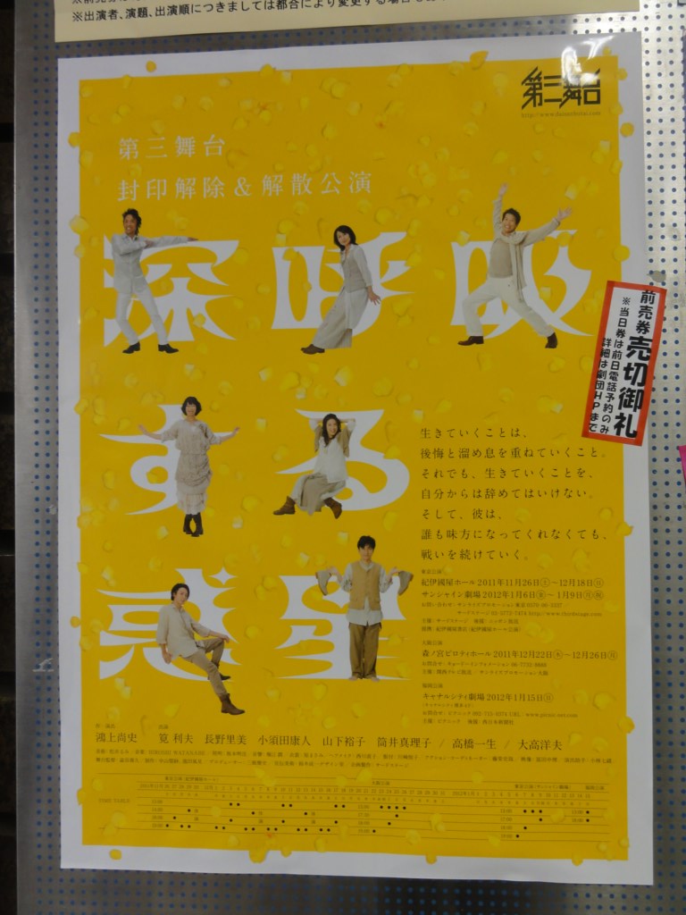 題名:第三舞台の封印解除&解散公演『深呼吸する惑星』 日時:2011年12月11日13:00-15:00 劇場:紀伊國屋ホール 料金:8400円 座席:M-10 作・演出:鴻上尚史 出演:筧利夫、長野里美、小須田康人、山下裕子、筒井真理子、高橋一生、大高洋夫 荻野貴継、小沢道成、三上陽永 美術:松井るみ 音楽:HIROSHI WATANABE 照明:坂本明浩 音響:堀江潤 衣裳:原まさみ ヘアメイク:西川直子 振付:川崎悦子 映像:冨田中理 宣伝美術:鈴木成一 舞台監督:澁谷壽久 演出助手:小林七緒 制作:中山梨紗、 池田風見 プロデューサー:三瓶雅史 企画・製作:サードステージ 二度目の観劇です。そして私にとって第三舞台の最終 観劇となります。 初日で見たときより、客席の反応が温かくていいですね。 なんだか舞台上と客席で過去を共有しているような気分。 ほんとに同窓会ですよ。 この日は旧NIFTYのメンバーでオフ、SYSOPだった出演者 の小須田さんも終演後のオフに参加してくださって お話を聞くことができました。 作家が顔青いとしているので、ドーラン塗ったらまるで ブルーマンになってしまい×。今度は水性のメイクを 塗ったら汗かくと流れてたいへんだったとか。 劇団がなくちゃっちゃうのはさびしいですねえ。でも 最後にもう一度見られたということに感謝しなければ ならないのでしょう。私の青春がまたひとつ消えていく 感じでした。 PR 題名:ロッキーホラーショー 日時:2011年12月9日19:00-21:00(途中休憩あり) 劇場:KAAT神奈川芸術劇場 ホール 料金:S席9500円 座席:8列28番(右側前方ブロック最後列) 脚本・作詞・作曲:リチャード・オブライエン 演出:いのうえひでのり バンド: 岡崎 司(guitars)、福井ビン(bass)、岡部 亘(drums) 松崎雄一(keyboards)、松田信男(keyboards) 出演: フランク・フルター:古田新太 リフラフ:岡本健一 ブラッド:・中村倫也 ジャネット:笹本玲奈 マゼンタ:グリフィス・ちか コロンビア:ニーコ エディ:ROLLY スコット博士:右近健一 ロッキー辛源 ナレーター:藤木孝 その他 飯野めぐみ、生尾佳子、JuNGLE、皆本麻帆、 初日です。 いのうえさん演出古田さん主演ということで見にきました。 2階席に空席がちらほら、もったいない。 初日のせいか、中央の席にちょっと場違いな背広の方々が見えます。それと同時に、 コスプレイヤーさんたちの姿もちらほら。背広とコスプレイヤーが同居しているの はちょっとシュール。 開演前の客席では、きれいな網タイツをはいたおねえさんがポップコーン売り。売 れるたびに「ポップコーン売れましたー」とハイテンション。 開演はまるで映画の上映開始、「PARCO PRESENTS」 と映画の冒頭のようなイメー ジが映し出されたかと思うと、上映前アナウンスのような事前説明。 「場内でのご飲食、許可のない写真撮影は禁止。 上演中は、火、水、お米の利用はご遠慮くださいませ」火や水はともかく米も駄目 なんですかー?前説が終わったとたん、売り子さんたちがマイクを出して歌い始め ました。 最初のシーンは背景が映像で、中幕をとるとお城の中。歯車とかいかにも古代SFと いった感じ。ナレーターの藤木さんかっこいい、なにか本格ミステリーの世界へ誘 われそう。古田フランクは魅力満点。いやー怪しいです。ヒロインの玲奈さんはは じけてました。いつものミュージカルの役どころとは違いますね。右近さんはもっ たいない、右近さんでなくても良いようなキャラ。 レーザー光線に何発もチャフで舞台上はお祭り騒ぎ。舞台上は凄く高いテンション なのに客席がついていってない感あり。タイムワープでもほとんど立てません。 後ろが立たないと立てない私もチキンでした。 演出はかなりオーソドックスで、新感線ならではの変化球を期待していくと肩透か しにあうかもしれません。要するに普通におもしろいのです。 カーテンコールでは全員総立ちでタイムワープ!ようやく客席が熱くなった感じで す。これは千秋楽は盛り上がるでしょうねえ 題名:おやすみ、かあさん 日時:2011年11月27日14:00-16:00 劇場:あうるすぽっと 料金:当日4500円 座席:G12(前方ブロックセンター) 作:マーシャ・ノーマン 訳:酒井洋子 演出:青山真治 出演:白石加代子・中嶋朋子 美術:青木拓也 照明:倉本泰史 音響:内藤勝博 衣装:藤井百合子 ストーリー: ジェシーは40歳になる離婚した女性。母親と二人暮らし。母親は60歳。 伴侶はもういない。 時計は、夜の8時半を指している。舞台には、母と娘の二人だけ。夕飯 の後片付けが終わり、それから二人の細々とした日常的な時間があり、 10時になると、娘は「おやすみ、かあさん」と言って自分の寝室に入る。 ただその夜はいつもの夜と一つだけ違っていた。娘は「あること」を実 行しようと決意している。そして母親はそれを知ることになる・・・ 娘自らの告白によって。 満員、当日券目当てでいってキャンセル待ちでぎりぎりはいれました。観客の 年齢層はかなり高そうです。左にソファ、右にテーブルと椅子、真ん中奥にド ア、どこかの家の居間が舞台です。リストを作って色々てき
