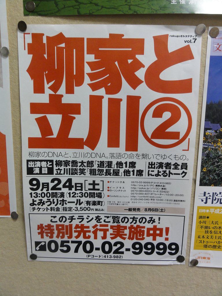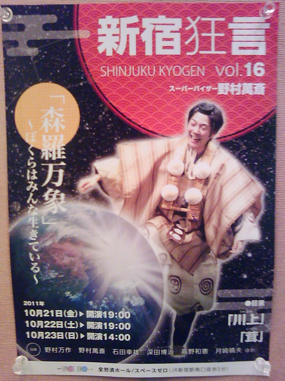 題名:新宿狂言Vol.16 森羅万象ーぼくらはみんな生きている 日時:2011年10月22日19:00-21:00(途中休憩あり) 料金:6000円(招待券でみました) 座席:11列15番 解説:深田博治 番組: 『川上』 [盲目の夫] 野村萬斎(21日・22日) / 野村万作(23日) [妻] 高野和憲(21日・22日) / 石田幸雄(23日) あらすじ:盲目の男が川上というところの霊験あらたかな地蔵に参詣し願をかけます。 めでたく願いがかなって目が見えるようになりますが、それには条件が…。 狂言屈指の名曲が配役の妙と新宿狂言ならではの舞台効果で再生します。 『茸』 [山伏] 石田幸雄(21日・22日) / 野村萬斎(23日) [何某] 深田博治 [茸] 月崎晴夫 内藤連 村井一之 竹山悠樹 中村修一 岡聡史 高野和憲 [鬼茸] 野村萬斎(21日・22日) / 石田幸雄(23日) あらすじ:家の庭に人間ほどの大きさのキノコが生えてしまい、男は山伏に退治の祈祷を頼みます。 法力自慢の山伏はもったいをつけながら祈り始めますが、祈れば祈るほど…。 スラップスティック狂言の代表作。 伝説的アートスフィア森羅万象ヴァージョン改定版。 ポストパフォーマンストーク「新宿狂言を語る」 司会: 西山秀樹(全労済ホール/スペース・ゼロ支配人) ・10月21日(金) 野村萬斎 小美濃利明(舞台監督) 束原 繁(舞台美術家/スペース・ゼロ) ・10月22日(土) 野村萬斎 崎山敦彦(神奈川芸術劇場事業課課長/プロデューサー) ・10月23日(日) 野村萬斎 野田 学(明治大学文学部教授) 開演前にまず前説、今までの新宿狂言の歴史とこの公演の注意を 語りました。後ろには字幕、2幕目で活躍するそうです。そして 客席には紙製の笠、これも2幕で活躍予定。 新宿狂言はこれで中締めなのだそうで、なんとなく寂しい。 「川上」は2000年に一度上演されているそうです。 登場人物がふたり。 盲目の男が神様に目が見えるように願を掛けにいきます。 見事成就!ただし条件は長年連れ添った妻と離縁すること。妻と は悪縁が。。。 神様に願をかけて、他の参拝者と語るところはまさに一人芝居、 たくさんの参拝客がいるかのよう。 行きと違って帰りは杖を投げ捨てて、明るい気分で下山。 目が開いた男をみて喜んだ妻は願の条件を聞いて反発、まあそ うでしょうねえ。別れるくらいならば目が見えなくてもかまわ ない、、、説得された男はわかれないことに決めたらとたんに また目が見えなくなり、、妻に手を引かれて退場。。 これも狂言なのですか!あまりにも演劇的な作品で、見ていて どよーーーっとした気分になりましたよ。 次は「茸」、これは観客参加型の番組でした。 いかにもウルトラQなBGMが鳴ってぐるぐると絵が回ると「茸」 の文字。 茸が生えて困るといううちへ山伏が法力で茸を退治する、、茸 は中腰でテクテク歩いてきてかわいい。山伏が印を結んでなに やら唱えると増殖!もう一回唱えるともっと増殖!そこで字幕 君の合図で客席みんなが笠をかぶって茸に早変わりっ!上から 番傘は落ちてくるし、毒毒しい茸まで登場、山伏は負けて退散 していしまいます。スラプスティックコメディをみている気分 でしたよ。 ひょっとしてこの作品にいんすぱいあされてマタンゴ生まれて ませんか? さて最後はポストパフォーマンストーク。 適当にメモをとっていたので話者などがごっちゃになっています アートスフィアでやっているときに電工掲示狂言をおこなった。 新宿狂言と違いを出したい、ということでまずは電光掲示板に 興味があってそれを使いたかった。昔は電光掲示板が太くてま るで柱のよう。そこで電光掲示板で広い舞台を仕切って狂言の 舞台を作った。舞台の進行を電光掲示板でやった。 みんなをのせたり拍手!などやって煽ったりした。 NHKホールは3500人、狂言が何人のキャパシティに耐えうる かという挑戦でもあった。NHKホールのせり上がりを使って狂言 を演出。でもせり上がった後はふつうの狂言を上演。上から出 現したこともあった。座席についたことが宇宙船にのった。 これからこの宇宙船はXX行きですというアナウンスをして このときは客に猿になってもらった。配った面をかぶっても らってライブカメラに写した。猿しかいないということを舞台 からみられるのがうれしかった。 落語のように狂言を語ったこともあった。客を立たせたことも あった。映像を舞台上に用いた時は鏡の中にマイクロカメラを 仕込んで無線でとばした。電波の状態で半分くらいは映らなかった。 14回目は電光掲示君を呼んだ。ブルーマンで電光掲示板が喋って いるのをみて、同じことをしたいと思った。人のものを見て やってみたい、と思うことをここでやってみた。水を使う、火を 使う、煙を使う、、はやった。氷を使う、はまだやってない。。 ひらめきを大事にしていた。ひらめきを加えても狂言は揺るがな いという確信があった。でも節度はあり、狂言の最中は解説をし ており、盛り上げるところだけい字幕がしゃしゃりでていた。 ひとことしゃべると周りのスタッフが考える。 全く見たことがないものを見れるのが