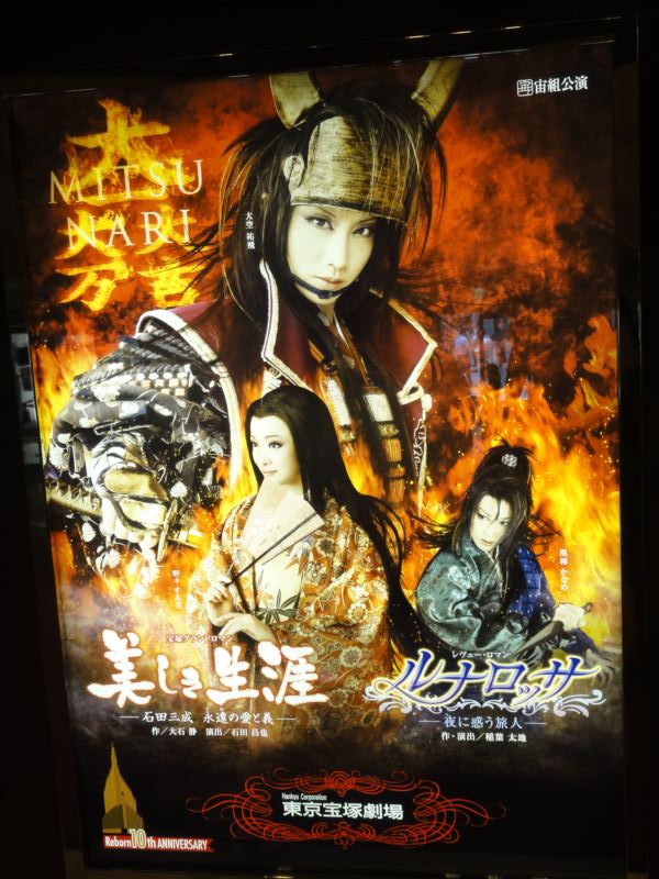 題名:『美しき生涯』 -石田三成 永遠(とわ)の愛と義- 『ルナロッサ』 -夜に惑う旅人- 劇場:東京宝塚劇場 日時:2011年7月24日11:00-14:00(途中休憩あり) 料金:S席8000円 座席:1階23列62番(最後列1列手前右端近く) 劇団:宝塚歌劇宙組 出演: 石田三成 大空 祐飛 茶々/淀 野々 すみ花 疾風 凰稀 かなめ 豊臣秀吉 未沙 のえる おね(北の政所)/高台院 美穂 圭子 徳川家康 寿 つかさ 加藤清正 悠未 ひろ 福島正則 北翔 海莉 加藤嘉明 十輝 いりす 脇坂安治 春風 弥里 平野長泰 鳳翔 大 糟屋武則 蓮水 ゆうや 片桐且元 凪七 瑠海 さぎり 純矢 ちとせ 市 妃宮 さくら たつの すみれ乃 麗 番組: 宝塚グランドロマン 『美しき生涯』-石田三成 永遠(とわ)の愛と義- 作/大石 静 演出/石田昌也 [解 説] 戦国時代の武将であり、卓越した政治家でもあった石田三成を主人公に、秀吉の側近 として豊臣家への忠義にその生涯を捧げた三成の武将としての生き様と、信長の姪で ある茶々姫を愛してしまったこと故の葛藤を描いた、歴史ロマン大作。宝塚歌劇とし ては初めて、脚本家の大石静氏、テーマ曲の作曲に大島ミチル氏を迎えた話題作でも あります。 レヴュー・ロマン 『ルナロッサ』-夜に惑う旅人- 作・演出/稲葉太地 [解 説] “ルナロッサ”とは、紅い月のこと。紅い月の下で繰り広げられる様々なイメージを、 東西文化の交じり合う中近東世界を舞台に展開する、エキゾチックで魅惑的なレヴュー 作品。 節電体制になってから初めての宝塚です。 ここ東京宝塚劇場でも節電への取り組みがなされています。 ロビー・バックヤード等の60%の消灯(LED化も同時推進)、シャンデリア・広告看板電飾 の消灯、客席間接照明・天井照明の減灯、劇場外観ビル照明消灯、空調温度調整、開演・幕 間・終演時以外のエレベータ・エスカレータの停止、省エネタイプの舞台音響設備の導入、 自動販売機の省エネタイプへの切り替えと消灯や間引き、トイレ暖房便座とエアータオルの 停止、バックヤード・事務所内エレベータの原則使用禁止、事務所内各機器の使用電力の抑 制とコンセントなど電源管理徹底。 さて、ちょっと緩い冷房の中で開演!きらびやかな衣装、かっこいい武将。 でも兵站・資金調達などのバックオフィス機能を司っていた三成では当人の派手な立ち回り はありません。三成は神々しいばかりに美しい。淀君も三成をひきつける魅力たっぷり。 その淀君を守る疾風も淀君を護るという一点のみを貫き通していて清々しい。疾風を主役と して描いてもよかったかも。豊臣秀吉は三成を従えるえげつない男として描かれていて見事。 合戦シーンも大人数が出演する宝塚ならではの迫力でした。三成は非常に明晰な男として描 かれているのに、真っ直ぐすぎて肝心なところで理想と現実のギャップではまるのでした。 ショーは月の光のもとにルナティックな雰囲気で進行。ぴかぴか光るコスチュームでエネル ギッシュなダンス!アラビアを彷彿させるエキゾチックなセットとメロディで楽しい舞台で した。また見たいかも。 PR