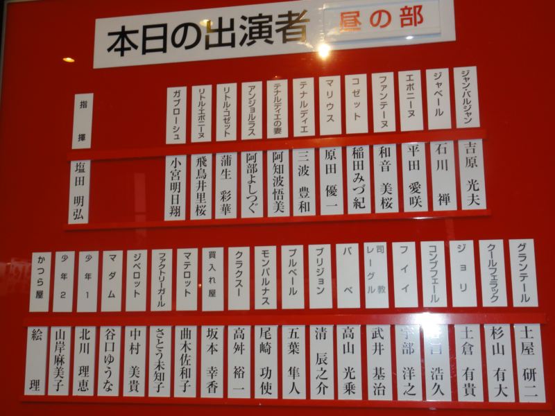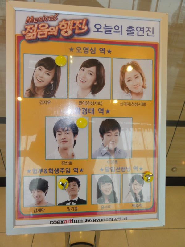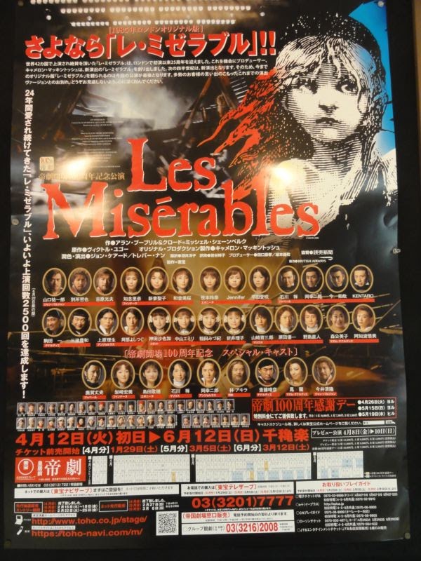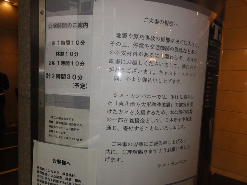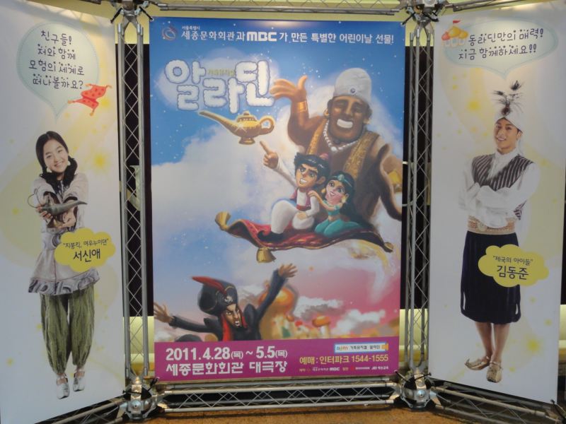 題名:가족뮤지컬 '알라딘'(アラジン) 日時:2011年5月3日14:00-15:30 料金:R席50000KRW+Interpark1000KRW手数料 劇場:世宗文化会館大ホール 座席:C77 (7列目センター) 4月末から5月上旬までのとても期間限定公演。 先週のチケット売り上げがミュージカルの中で第三位だったので見にきてみました。 前日の晩にぽつんと1席残っている座席を買ったら子供たちの真ん中!幼稚園から 小学校低学年の団体鑑賞客ばかりなようです。 劇場スタッフも子供たちを座らせるのに必死。劇場ロビーもわーわーきゃーきゃー みんな叫びまくり! キャストがでてきて、前説。これがめちゃくちゃもりあがっています。 客席超ハイテンション。拍手の練習!そして歓声の練習! 1階と2階で競わせたらみるみる大声に。 この劇場で、ほぼいすの背もたれと同じ高さの頭の行列は壮観です。 前説終わってもテンション高いままぜんぜん静まりません。 オープニングはバザールのシーン。そこで boy meets girl。 アラジンはイケメン、お姫様は美しく、美男美女の組み合わせです。 アンサンブルはかなり踊れて楽しい。 悪者魔法使いは大人気、でてきたとたんに子供たちが手をふる、黄色い声を出す! 悪者が朗々とした声で一番迫力がありましたね。 ランプの精はこぶとりのお兄さんで親しみやすいキャラです。 ランプの精その他大勢でブラックライトを使って千手観音の芸がありましたよ。 センターに座っている私はばっちり鑑賞。 アラジンとお姫様が手を取ると子供たちがわーわーきゃーきゃー。 悪者魔法使いが魔法のランプをだましてとりあげるところでは、客席から怒号、 もうキャストのせりふが聞き取れません。 最後は悪者をランプに封じ込めてハッピーエンド、、、魔法のランプってこう いう話でしたっけ? 客席のすごくメリハリのついた盛り上がりに観劇の原点を見た気がしましたよ。 PR 題名:젊음의 행진 (若さの行進) 日時:2011年5月1日18:00-20:13(途中休憩あり) 劇場:코엑스아티움 현대아트홀(コエクスアトリウム現代アートホール) 料金:VIP席70000KRW 座席:1階席Aブロック3列目21番(3列目左サイドブロック通路側) 出演: 김지우,김산호,임기홍, .. Staff : 송승환, 이광호, 강옥순, 김성수 開演に数分遅れてしまったせいで、オープニングはロビーでビデオで見ることに。。 客席は6割程度の入りでした。でもこの観客のノリがよい。すぐに手拍子出てきます。 クイズ番組のオープニング?をあかぺらでうたうと観客大喝采。 高校時代と現代が交互に描かれるボーイミーツガールもので、景気の良い懐メロ? を歌いながらがんがん躍るのです。最後は卒業と現代で再会結ばれるまで。 言葉なんてわからなくても筋書きは問題なし、というか筋気にせずに楽しめますw 現在と過去が平行していて学園もの+バックステージもので最後は二人が結ばれて めでたしめでたし、その中に曲がたっぷり。カーテンコールはステージ中の曲が再度 かかり、キャストががんがん踊りまくり。客席まで降りてきて席にあがりこんで踊っていま したよ。熱い客席、最後はほとんど総立ちでした。 題名: Varekai, Cirque du Soleil 日時:2011年5月1日14:00-16:05(途中休憩あり) 劇場:잠실종합운동장 내 빅탑(チャムシル総合運動場内特設テント) 料金:R席130000KRW(約1万円) 座席:203ブロックE列(左サイドブロック5列目) 劇団:CIRQUE DE SOLEIL Staff : Dominic Champagne, Andrew Watson, Serge Roy, Eiko Ishioka, Stephane Roy 解説:(公式Webより) Deep within a forest, at the summit of a volcano, exists an extraordinary world—a world where something else is possible. A world called Varekai. From the sky falls a solitary young man, and the story of Varekai begins. Parachuted into the shadows of a magical forest, a kaleidoscopic world populated by fantastical creatures, this young man sets off on an adventure both absurd and extraordinary. On this day at the edge of time, in this place of all possibilities, begins an inspired incantation to life rediscovered. The word Varekai means "wherever" in the Romany language of the gypsies the universal wanderers. This production pays tribute to the nomadic soul, to the spirit and art of the circus tradition, and to the infinite passion of those whose quest takes them along the path that leads to Varekai. 総合運動場駅で降りればすぐに看板があるはずと思いきや、駅前には何のディスプレイ もありません。開演2時間前では人通りもほとんどなくほんとうにここで公演があるのか と心配に。。。地上にでても看板や矢印が見えません。野球場をぐるりと回ってみて、 ようやくお約束の青と黄色のテントを見つけました。 日本だったら、もっとがんがんディスプレイするのにねえ。奥の方の道からようやく左右 にシルクドソレイユが行っている公演タイトルが並んでいました。 チケットは当日購入。前方だと後ろから3列目(これでもR!)ということだったので サイドブロックで舞台に近いところを選択。テントにはいればいつものシルクドソレイユ。 ちょっと違っていたのは写真撮影ポイントがあったこと。 それから特設トイレの壁面がVAREKAI仕様でしたよ。 開演前にはもちろんクラウンが客席内登場。赤いジャケ
