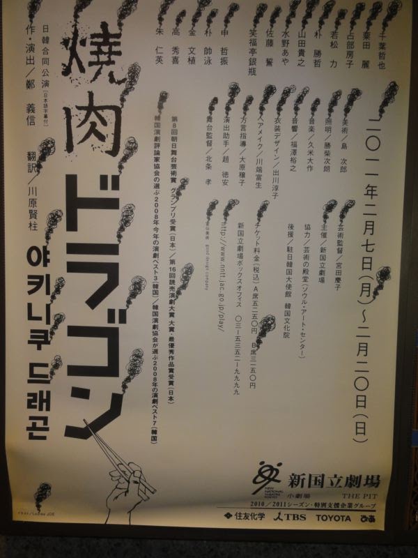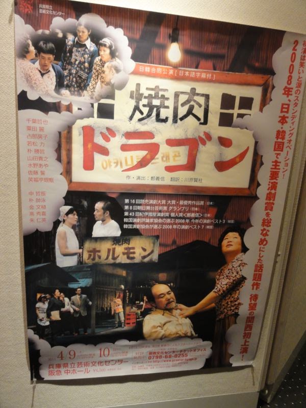 日時:2011年2月20日18:30-21:40(18:10開場時から舞台では演技がなされていました) 劇場:新国立劇場小劇場 料金:S席4250円 座席:D4列4番(1階席後方左側) 脚本・演出:鄭義信 翻訳:川原賢柱 美術:島次郎 照明:勝柴次朗 音楽:久米大作 音響:福澤裕之 衣裳デザイン:出川淳子 ヘアメイク:川端富生 方言指導:大原穰子 擬闘:栗原直樹 振付:吉野記代子 演出助手:趙徳安 舞台監督:北条孝 出演: 金龍吉・「焼肉ドラゴン」店主: 申哲振 高英順・竜吉の妻: 高秀喜 金静花・長女: 栗田麗 金梨花・次女: 占部房子 金美花・三女: 朱仁英 金時生・長男: 若松力 千葉哲也 / 笑福亭銀瓶 / 水野あや / 佐藤誓 / 朴勝哲 / 山田貴之 / 朴帥泳 / 金文植 ストーリー: 焼肉店「焼肉ドラゴン」は、空港そばの下水すらない朝鮮人集落にある。 1969年・春。「焼肉ドラゴン」では、次女・梨花と哲男の結婚パーティーの準備が 行われている。そこに二人が言い争いながら帰ってくる。哲男が市役所の職員と喧 嘩し、婚姻届が出せなかったことを梨花はなじる。そのかたわらで、歌手志望の三 女・美花とクラブ支配人の長谷川とはわけありの雰囲気だ。屋根に登った長男・時 生と店主の父・龍吉(片腕である)は散る桜を眺め、それなりに未来は明るく見え た。 同年夏。母・英順は機嫌が悪い。店の立ち退き話や、有名私立に入れた時生がイジ メにあい不登校になっているのだ。一方、結婚はしたものの哲男はなにやかやと理 由をつけて働かず、焼肉屋で親と同居しながら梨花が働いて家計を支えている。仕 事から帰ってきた梨花は哲男と激しく揉め、まだ長女・静花のことが好きなのね、 と責める。哲男と静花はかつてわけありだったが、静香は妹の気持ちを察し、店に やってきた韓国人の大樹とともに出かける。追いかける哲男。泣き崩れる梨花は、 ふらっとやってきた常連の日白と関係してしまう。 同年秋、夜。時生へのイジメは加熱し、とうとうしゃべれなくなる。そこへ長谷川 の妻・美根子が現れ、美花との浮気をなじり、慌てる長谷川に絶対に離婚しないと 言い捨てて去る。日白の自転車で帰ってきた梨花は、哲男を無視して寝てしまう。 自分の結婚は破綻していること、君とやり直したいと静花に話す哲男。そこに大樹 が現れ、恋敵同士はマッコリの呑み合戦を始める。 同年、冬。静花と大樹の婚約パーティーでにぎやかな一同。招かれていない哲男が 現れ、「これから北朝鮮に行く、ついてきてほしい」と懇願された静花は彼につい て行くことを決断する。そこへ、学校に呼び出されていた龍吉と時生が戻り、時生 の留年を告げる。それでも学校に行けという龍吉に、時生は屋根の上から飛び降り て自殺する。 1970年、夏。正式に離婚した長谷川は、美花の妊娠を伝えて龍吉に結婚の許可を求 めるためにやってくる。万国博開催に誰もが浮き足立つ中、哲男は、一時停止して いる北への帰国事業の再開を複雑な思いで待っている。立ち退き要請に現れた市役 所の職員に龍吉は、土地を奪うなら戦争でなくした腕を帰せ、息子を帰せと叫び、 嗚咽するのだった。 1971年、春。立ち退きのため瓦礫と化した店の前で、別れを惜しむ人々。静花と哲 男は北朝鮮へ、梨花と日白は韓国へ、美花は長谷川と開業したスナックへ出かけて 行くのだ。バラバラになっても家族はつながっていると英順。屋根の上に時生が現 れ、去っていく家族を懐かしめば、桜が散りはじめ、龍吉は英順を乗せたリヤカー をゆっくりと引いて坂道を上ってゆく。 これは、死者が想起した物語だったのか。 ------------------------------ 開場すると舞台の上ではキャストが焼き肉を食っていました。ああ、私も食べたい。 時代は昭和、ピンキーとキラーズの恋の季節が歌われました。太鼓、鉦、アコーディ オンで合奏、歌って宴会! 舞台の上方には「焼肉ホルモン」の看板、右側は板の間で座卓、真ん中にはテーブル 左側はのれん、その外が道路、それに面してトタン板屋根の家が並んでいます。 開演前のアナウンスは「ご町内の皆さんにお知らせします。開演中の。。。」 私らは町内の衆だったのですね。 ジェット機の轟音とともに物語のはじまり。ここは飛行場のすぐ近く、国有地の上 に何十ん年も住んでいる人達。時生は時々屋根の上に登って観客に 向かって語りかけるのですが、その他はいかにも等身大なリアリティあふれる 雰囲気です。東京オリンピックから大阪万博までの、日本が生き急いでいた時代 にかかわるくすぐりがいくつもはいっており、ぎりぎりその世代に生きていた 私はちょっとノスタルジー。でも物語はかなり重いのです。 娘3人に息子1人、全員が問題を抱え、最後には全員が夫婦の元を去っていきます。 そして必死で働いて保っていた焼肉屋も国の強制執行によって失ってしまいます。 「働いて働いて働いて。働いて働いて働いて。故郷は近い。でも遠い。それが自分 の人生。自分の運命。」おとうちゃんの言葉にほろり。 在日の課題はすごく重いのですが、私