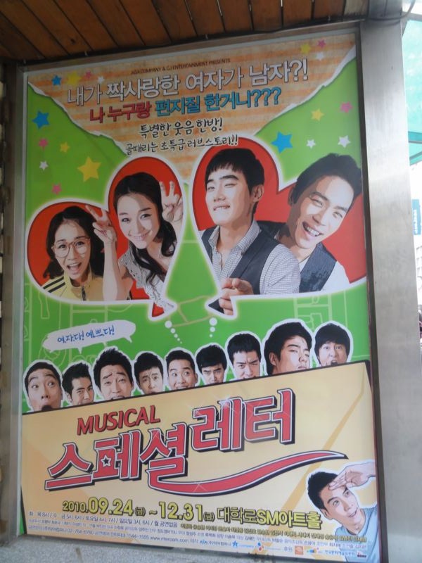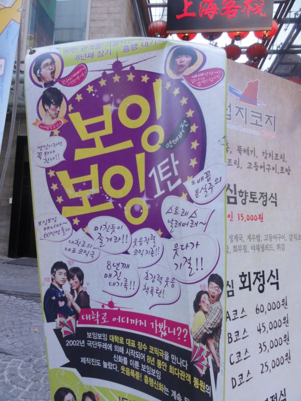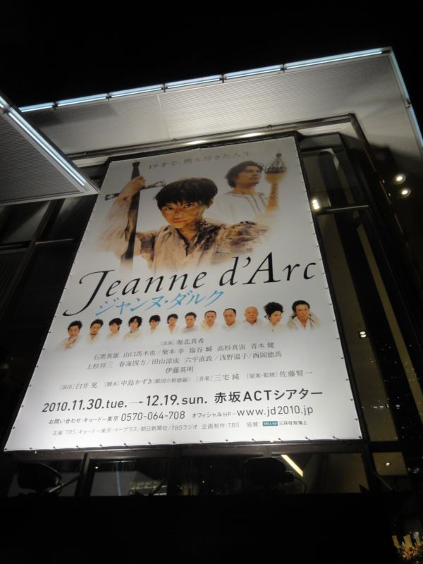 題名:イッセー尾形のこれからの生活2010総決算! 日時:2010年12月6日19:00-21:15 劇場:原宿クエストホール 料金:前売5000円 座席:H19(右側ブロック通路側) 番組:(私が勝手に名付けました) 中学生少女恋愛告白される 似てないビートルズの店 リニューアル三越訪問するおばさん お受験の子供に囲まれてホテルで朝食をとる爺さん コピーライターのおじさん、女の園で苦闘 薪割りの爺さん 天草五郎 ひとみのショー 久々のイッセー尾形です。劇場ロビーで食べ物飲み物の大判ぶるまいは健在。 ワイン、紹興酒、おにぎりなどがあり、座り込んでしまって飲んでいるひとも。。 食い物飲み物あると祝祭的な気分になれて幸せ。 前説なく舞台が暗転し、明るくなると女子中学生の制服の後ろ姿、ふりむいた途端に 客席から笑いが飛び出しました。リボンまで振り回してみせましたよ。 いつも通り舞台の上で生着替え、次はいかにもビートルズっぽいなあと思ったら やはりビートルズの物まねバンドが今後の方針を悩んでいるところでした。 リニューアル三越に来たのは娘に帽子を買ってやろうとするおばさん、人ごみに押さ れてあっち行ったり、こっち行ったり。優雅に朝食を取ろうとする爺さんは行儀悪い 子供に文句を言うくせに、当人が輪をかけて行儀が悪い。。 コピーライターのおじさんは、和菓子のコピーと温泉のコピーを女子社員と一緒に 作ろうとしてますが、センスがちょっと。。。 薪割りの爺さん、よぼよぼな癖に薪を割る時だけシュタッ! 天草五郎は連載ものらしく、始まったとたんに大きな拍手。たくさんの仮面を前に 椅子に座り、次々と仮面をかぶって一人芝居をするという、昔ならば百目といった 芸でしょうか。すげーたわいもない筋書きなのに笑えてしまいます。場面転換が 起きてさてこれからどうなる?と言った時にベルがジリリリリ、おあとは次回だ そうで Orz 最後はドレスに綿入れを着たばあさんが、ウクレレ抱えて北の場末キャバレーで ライブのピンチヒッター。いかにもあるあるといった感じの歌詞ばかりです。 あっという間に終わった2時間でした。長いこと見てなくて久々に同じホール で見ると何やら時の流れを感じてしまいましたよ。 PR 題名:ジャンヌダルク 劇場:赤坂ACTシアター 日時:2010年12月4日18:00-21:15(途中休憩あり) 料金:11500円 座席:1階J6(左より前方) 演出:白井 晃 脚本:中島かずき] 音楽:三宅 純 原案・監修:佐藤賢一 出演: ジャンヌ・ダルク 堀北真希 傭兵ケヴィン 石黒英雄 ベッドフォード公 山口馬木也 マリー・ダンジュー 柴本 幸 アランソン公 塩谷 瞬 幻影の少年 高杉真宙 クルパン 青木 健 タルボット 上杉祥三 ラ・イール 春海四方 傭兵レイモン 田山涼成 コーション司教 六平直政 ヨランド・ダラゴン 浅野温子 ラ・トレムイユ卿 西岡徳馬 シャルル7世 伊藤英明 たぶん満席。通路脇は役者がと通るのでちらしなど置かないよ うに!と前説で力説してます。 前方中央部の客席をつぶして舞台が張り出しています。 前方の客席は前に張り出した舞台を囲むようになっています。 私が座った位置で、舞台最前方から数えて4列目、という感じ。 舞台は一見したところ、木製に見えます。舞台の奥は真っ暗、 分厚い舞台の真ん中に四角い穴がふたつ。 舞台の端は上から何本ものケーブルで支えられています。 ケーブルの上は滑車、これ動くの?と思っていたら本当に動 きました。この舞台の床が垂直に立って城壁になりました。 穴が窓になったり、門になったり。。なんだか能舞台みたい なシンプルさです。 ジャンヌかわいい。しかもしっかりキャラがたっている。 電波な子で神様と会話。ジャンヌが旗を振れば兵が奮い立つ! 大人数の戦闘はさすが。舞台の上の密集隊形や客席ところ狭 しと走り回るシーンは圧巻です。少人数の時は、ピンスポット による会話。脇役は重鎮ばかり、物語に説得力を与えています。 殺陣は様式美とでもいうような雰囲気、英国軍を打ち破るとき にはちょっとカタルシス。戴冠式、神の声が聞こえなくなった ところで1幕終わり。2幕は負け続けで囚われ、今度は宗教裁判 の戦い、検事役の僧侶を論破するところもちょっと爽快。 でも悲劇だからどよどよしちゃうのよねえ。最後は神をまた 見るようになって、自ら火炙りを選びます。ちょっとうるっと きてしまった。 かなりよくできた舞台だと思います。長さをさほど感じさせま せんでしたね。 題名:ボーイングボーイング第一弾 日時:2010年11月22日17:00-19:00 劇場:大学路トゥレホール3館 料金:25000KRW 座席:ガ8番(最前列右端) インターネットで事前購入すると平日17時は1万ウォンという特別料金なのですが、 購入できない私はなくなく正価。 ほかにもディスカウントクーポンがあったようでちょっと悔しいです。 月曜日はTKTSも各種案内所もすべてお休みでした。人影もまばら。 でもこの公園は満員、この中で正価払っているのは私一人かも。。。 パンフレットを3000ウォンのところ2000ウォンで打ってました。 写