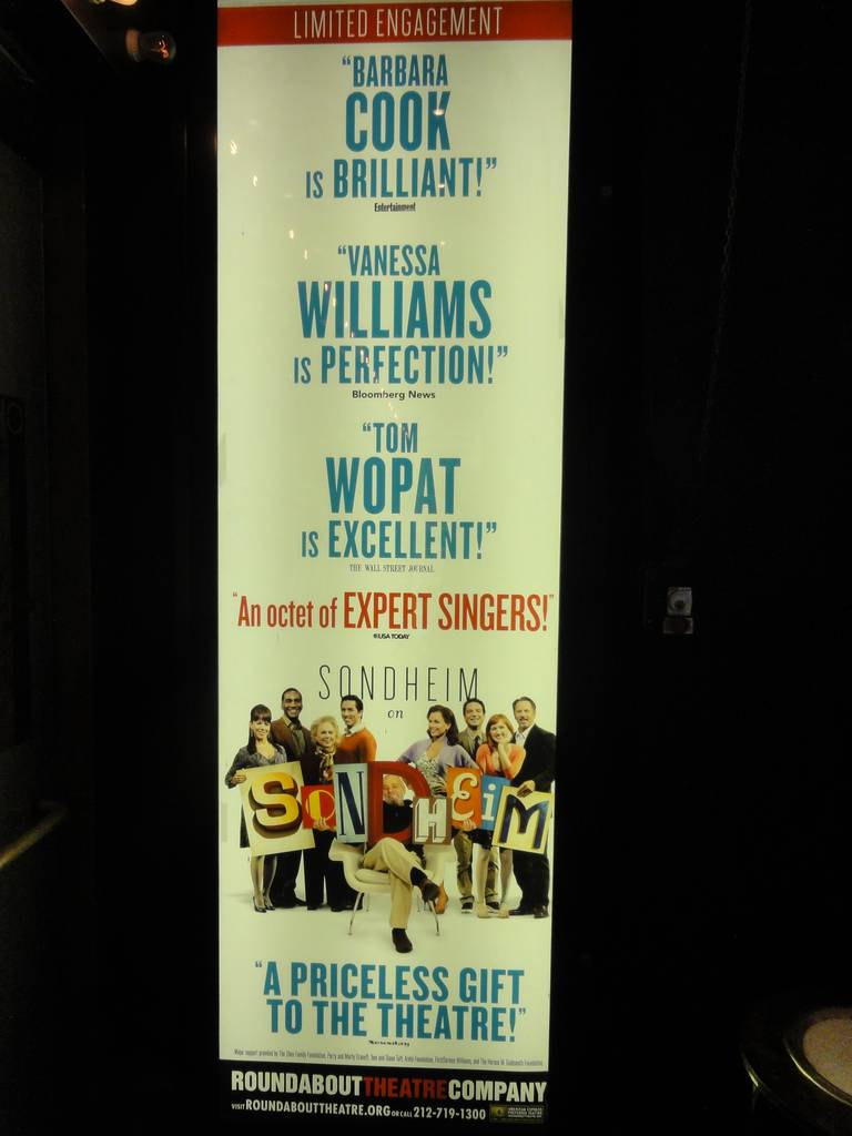 題名:John Tartaglia’s Imaginocean 日時:2010年6月5日11:05-11:51 劇場:New World Stages, Stage5 (NY) 料金:Broadway Box 割引 35USD(定価は40.25) 座席:C-7(3列目左よ) 出演:Dorsel, Tank, Bubbles Performer:Nate Begle,Jonathan Carlucci,Brian Carson,Carole D'Agostino, Ryan Dillon, Lara MacLean, Stacy Weingarten,James W. Wojtal Jr., ストーリー: A one-of-a-kind, interactive show, John Tartaglia’s Imaginocean is a magical, musical undersea adventure for kids of all ages. Tank, Bubbles, and Dorsel are three best friends who just happen to be fish, and they’re about to set out on a remarkable journey of discovery. And it all starts with a treasure map. As they swim off in search of clues, they’ll sing, they’ll dance, and they’ll make new friends?including everyone in the audience. Ultimately, they discover the greatest treasure of all?friendship. Jam-packed with original music ranging from swing to R&B to Big Band, John Tartaglia’s Imaginocean is a blast? from the first big splash to the last wave goodbye. Dorsel is the youngest of our fish friends. He looks up to Bubbles as a big sister and admires Tank for his strength. Dorsel is scared of germs, and worms, and jellyfish, and-well, Dorsel's scared of everything! He likes sanitizer and all things safe and clean! Though all of our friends go off on quite an adventure, it's Dorsel who has the biggest journey of all, and ends up being the bravest in befriending Leonard the octopus. If you're looking for a great and loyal best friend, Dorsel's your fish! Bubbles is a fish with a big heart and huge imagination who dreams of ponies and clouds and magic. When it looks like all hope is lost in retrieving the blue medal on the journey for our treasure, it's Bubbles and her vivid imagination that saves the day. She's Tank's buddy, and a big sister to Dorsel, whose paranoia and worrying Bubbles finds charming. Bubbles is the charm and beauty of our fish trio. What Tank may lack in eloquence, he makes up for in strength and a huge heart. He's the oldest and biggest and the engine of our fish trio. Helping a baby jellyfish? Not a problem for Tank. Riding the biggest and craziest currents in the ocean? Bring it on! No adventure's too big for him. Dorsel and Bubbles let him often take the lead, and they know that though he may be gruff and buff, he's a big softie at heart. New World Stages は何度かきていますが、この劇場にはいるのは初めて。 いまはAvenueQとか39stepsとか上演されているのですね。 チケットは当日に劇場窓口で購入、客席の入りは約6割。さすがにお子さま率とても高し。明らかに 5割超えてます。子供連れでなさそうなのはほんの数組しかいません。 しかもすごく小さなお子さまが多い。みんなかわいい。でもうるさいw 舞台は下と左右に装飾が施してあり、はしっこや最前列からはちょっと見づらくなっています。 でも最前列は別のお楽しみが。。 開演間際になり、スタッフの号令一下、客がはしっこから中央の席へ大移動となりました。 どういう基準でチケット売っていたのでしょうか? 舞台の左右の装飾に魚が一匹ずつ、この2匹が左右でつっこみしあって、前説してました。 お願いは次の三つ。 1.開演中は歩きまわるな。 2.電話はだめ、撮影するな 3.大声で笑え、拍手しろ、大騒ぎしよう! いいですねえ、最後のお願い。 さて幕が開くと劇場全体が真っ暗になりました。そして頭上からたくさん落ちてくるものが、、、 ブラックライトに照らされたシャボン玉がすごくたくさん空中に!海の中にはいった気分。 これから先終演までブラックライトだけを照明として人形劇が演じられるのです。 ちなみにシャボン玉が服にあたってはじけたところは終演までぼんやりひかってました。 暗闇の舞台に浮かび上がるのはお魚たち、メインキャストは3匹。そして舞台から飛び出して きます。客席に語りかけもするので、舞台と客席の敷居がすごく低い感じです。 物語は宝の地図を拾った魚たちが宝物を探しに海を旅するというものです。 まずはくらげをたすけます。クラゲたちのSing Sing Sing ダンスがかわいい。なにせブラック ライトだけなので上下左右前後縦横無尽に動けます。 次は方向を迷わせようとたくさんの矢印がこれまたダンス!イマジネーションをめぐらせる歌で 想像力をみせ、でかいタコとも遭遇し、初めてのお友達になってあげたりもします。 途中でコインを拾ってそれと引き換えの最後のお宝は友情、そしてFriendshi Bracelet,, ああだからブレスレット売ってたのね(^^;) エンディングはまたたくさんのシャボン玉!、物語が簡単で英語がわかりやすく、そして人形が かわいい。短い上に安いので英語の勉強を兼ねて楽しむのにも良いかもしれません。 うきうきして劇場を出ました。 PR 題名:Sondheim on Sondheim 日時:2010年6月4日20:00-22:40(途中休憩あり) 劇場: Studio 54 Theatre (NY) 料金:BroadwayBox 割引96.5USD(定価126.5USD) 座席:Mezz BB 103(2階席センターブロック2列目) 出演:BARBARA COOK,VANESSA WILLIAMS,TOM WOPAT,LESLIE KRITZER NORM LEWIS, EUAN MORTON,ERIN MACKEY ,MATTHEW SCOTT Story: It's a completely different kind of Sondheim evening: an intimate portrait of the famed composer in his own words...and music. An ensemble cast, led by Tony Award winner Barbara Cook, Vanessa Williams and Tom Wopat, will perform brand-new arrangements of over two dozen Sondheim tunes, ranging from the beloved to the obscure. シルクドソレイユが18時半に終わって、バ
