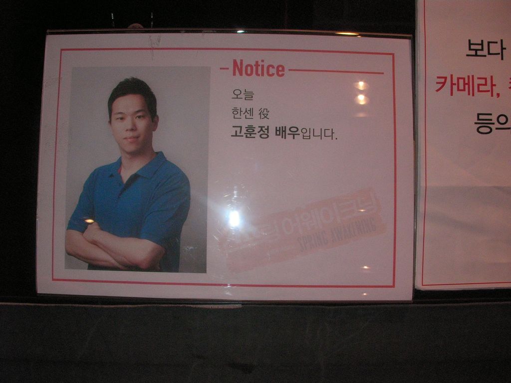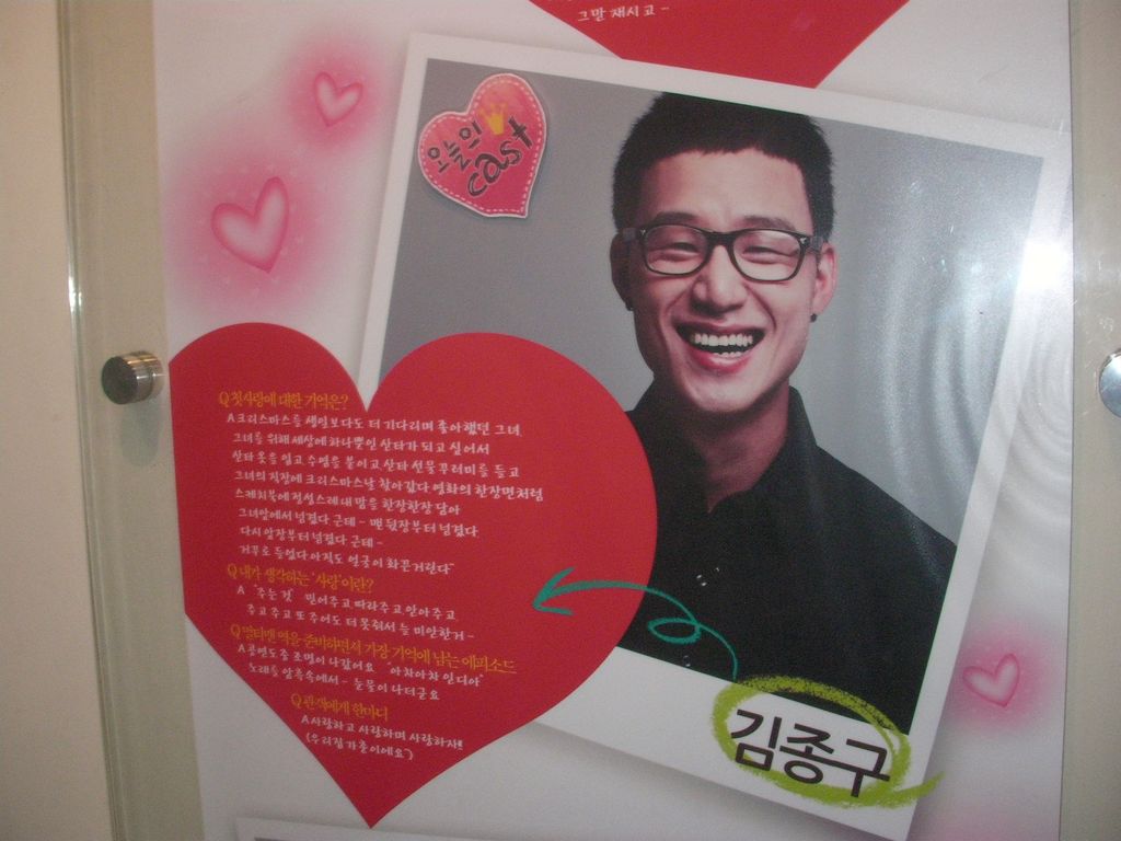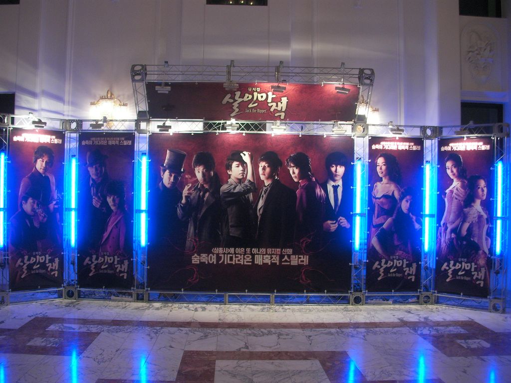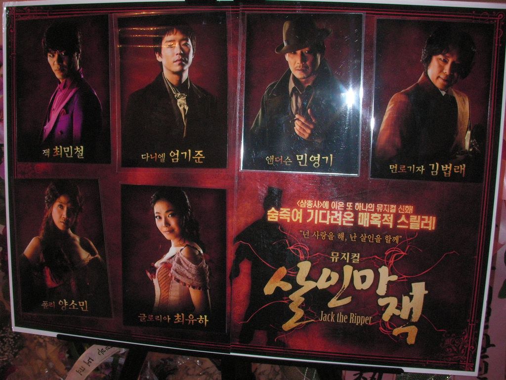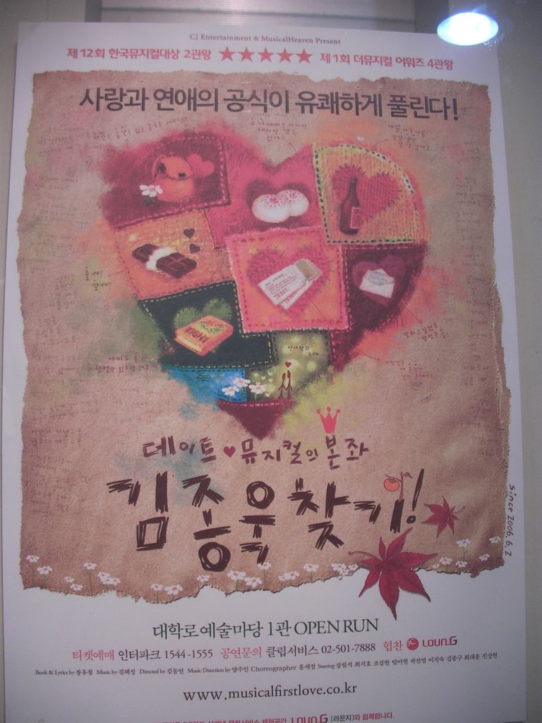 題名:뮤지컬〈살인마 잭〉(Jack the Ripper) 日時:2009年11月22日19:00-21:20(途中休憩あり) 劇場:유니버설아트센터(ユニバーサルアートセンター,ソウル) 料金:R席100000KRW 座席:1階7列7番(7列左端近く) Staff:Ivan Hejna, Vaso Patejdl, Eduard Krecmar, 왕용범, 이성준 出演:안재욱,김무열, 유준상, 민영기, 김원준 .. かなり豪華な劇場です。キャストは日替わりの模様。 これって韓流スター出演なのでしょうか?和服姿の日本人らしきおばさまの 集団がいらっしゃいました。その他日本人のおねえさまたちも多数。 ロビーには花とかもあり。 生オケで、ほとんど全てが朗々と歌いあげる楽曲。1幕はかなりおもしろい。 キャスト全員がしっかり歌えます。売春婦とその客、コカイン中毒の警察官と それを種にゆする新聞記者というどろどろした世界で、売春婦連続殺人事 件が起きます。刑事と新聞記者が見事にどろどろした雰囲気を醸し出して くれています。売春婦もみんないい女。当然ながら舞台はずっと暗いのです。 回り舞台をフルに活用、ジキルとハイドに近い演出を感じました。 売春婦と駆け落ち?した医者のダニエルが死んだはずのジャックと出会って なにやら契約、ジャックが売春婦を殺してダニエルが腑分け、いったいどん な契約なのか言葉がわからないのがつらい。。 ダニエルを囮にジャックを誘い出すべく作戦をたてるのですが、売春婦は殺 されてしまいます。ダニエルが自分の研究室に戻るとジャックが待っておりました。 そこではダニエルとジャックの心がいれかわるような歌、まるで二人で演じる ジキルとハイドです。そこに警部が捕まえにきます。その後ろから、ジャックを 新聞だねにしつづけようと、新聞記者が警官を殺しておいかけてきます。 新聞記者はダニエルに警官殺しのナイフを持たせて特ダネ写真、でもダニエル に殺されてしまうのでした。そこででてくるのがヒロイン、ダニエルが連続殺人 魔であることに気がついて、ダニエルを殺そうとするが果たせず自殺します。 嘆くダニエル、その後ろから警官が撃って、研究室を爆発させるようにしてえんど。 群舞をみているのは楽しい、だけれどどこかでみたことがあるような振り付け。 かたまって動いたり、、机を動かしてタップを踏んだり、ゾンビダンスだったり、、 楽曲はいいし、歌って踊れる人をアンサンブルまできっちりそろえてます。 途中までノリで書いてきて、最後になって無理矢理落ちを付けたという雰囲気 の舞台でしたよ。なんだか残念。 PR 題名:뮤지컬 김종욱찾기(キムジョンウク探し) 日時:2009年11月22日15:00-16:55 劇場:대학로 예술마당 1관 (大学路の南,ソウル) 料金:45000KRW 座席:I-12(客席後方ほぼ中央) Staff:강국현, 이시내, 장유정, 김혜성, 김동연 出演: 김종욱:최지호 여자:임미현 멀티맨:김종구 これはお勧め!ハングルわからなくてもかなり楽しめました。 話題になってロングランしているということで見にきました。 恵化駅から歩いて10分弱、シアターコンプレックスのB1にこの劇場はありました。 大通りに面していないので、地図を持っていかないとたどり着けない可能性があり ます。客席はかなり急、前後は狭い。 客席はほとんどカップル、すごい風景だなあ。私の前のカップルはずっと抱き 合ってみてましたよ。人気のデートスポットなの? 開演前には他の舞台のプロモーションビデオ上映。Assassins, Spring Awakening, Wedding Singer..全部みたいぞw 最初に黒いスーツでおにいさんが前説、ここで受けてます。客席のもりあがりや よし。そしてこのお兄さんがその後千変万化、次の場面ではかつらで登場(^^;;) 登場人物は3人だけ、主役二人はほぼそのまま(主演男優は二役)、残りひとりが 22役をこなすとうたわれていました。記憶の限りで書くと、、タクシーの運転手、占 い師、コギャル、フライトアテンダント、予約係、おばさん、ヒロインのお父さん、バ レエダンサー、車掌、ヒロイン上司、車内販売係、ターバンまいたインド人、バー テンダー、半身ずつおにいさんとおばさん、えーと後なんだっけ(^^;) もっともっと いました。 冒頭でふたりはタクシーで乗りあわせます。 会社を首になった彼女はお父さんに結婚をするように命じられ、初恋の人をさが しに初恋の人相談所を訪ねます。そこでふたりは再会、彼女の初恋の人探しに 彼は奔走することになります。インド行きの飛行機内で初恋の人と出会った彼女 はネパールで再会し、運命の人だと思います。でも帰国時に空港で再会するは ずが帰国が遅れてそれっきり。。。 二人は初恋の人を探し回りますが、みつかりません。さがしているうちにふたりは どんどんいい感じになってしまい、とうとうヒロインからキス。それからますますぎご ちなくなり、、デッドラインが迫った日、実は彼女は初恋の人のIDを持っているこ とが判明します。IDがありさえすればすぐに探せるのに?なにやら色々思うこと があったようで。初恋の人に再会した彼女はさっぱりした顔で彼の前に現れます。 こ