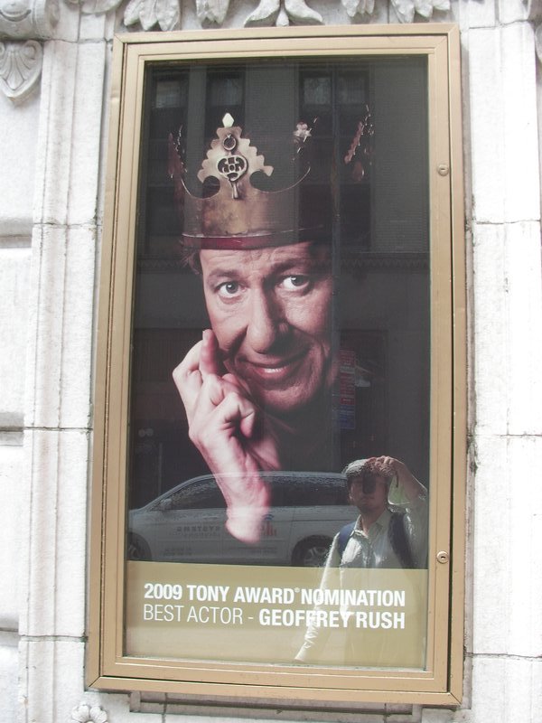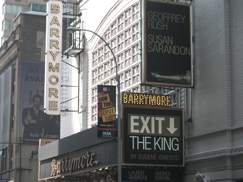 日時:2009年5月29日23:30-24:30 劇場:Nirvana(インドレストラン&バー)(NY) 料金:ミュージックチャージ 10USD + 飲み物(ビール7USD) このお店はレキシントン通りの西側、39-st 40-st の間にあります。 入り口近くがバーで奥がラウンジというよくある形態、バンドは一番奥 で演奏をしていました。ここにきたのはめぐり合わせとでもいいましょうか。 昼間に知人に会いにマンハッタンにある私たちの会社のオフィスを訪問しました。 そこで名刺交換した方が、「これからドラムをたたきにいきます!」 それなら聞きに行かねば!ということでブロードウェイの芝居が終わったのちに 駆けつけたのでした。 ベース、キーボード、ドラムのトリオのバンドで、いくつかの曲に歌手がつきま した。けっこういい感じの雰囲気で、NY到着初日の疲れを癒してくれました。 ドラムっていったいどこで練習するの?というのが聞いている最中に浮かんだ 最大の疑問だったのですが聞きそびれました。(^^;) 題名:Exit the King 日時:2009年5月29日20:00-22:20(途中休憩あり) 劇場:Ethel Barrymore Theatre(NY) 料金:TKTS 半額 60USD 座席:ORCH F14(7列目右端近く) 脚本:Eugene Ionesco 装置・衣装:Dale Ferguson 照明:Damien Cooper 音響:Russell Goldsmith 音楽:John Rodgers 出演: GEOFFREY RUSH (King Berenger and Co-Translator) トニー賞プレイ主演男優賞受賞 SUSAN SARANDON (Queen Marguerite) LAUREN AMBROSE (Queen Marie) ANDREA MARTIN (Juliette) WILLIAM SADLER (The Doctor) BRIAN HUTCHISON (Guard) ストーリー:(playbill) Berenger I is sovereign to a decaying realm. His vast armies are dispersed, the walls are tumbling and even the palace washing machine has been pawned. His partner wife advises him that he has only the length of the play to live, while his trophy wife attempts to distract his attention from this distasteful reality. (Comedy) 新しくなったTKTSで購入。Play専用行列というのがあるんですね、ミュージカルより遥かに 短いものでした。クレジットカードがTKTSで使えるようになっていたのはびっくり。 最初に出てくるのが甲冑姿の男(Guard)、次に出てくるのが「電話はやめてね」のプラカード を持った小間使い(Juliette)、裏を返すと「メールも禁止」w 登場人物は6人だけ、王(死にます)、marguerite王妃(たぶん第一夫人、貫禄)、 Marie王妃(たぶん第二夫人、若くてきれい)、小間使い(ひょうきん)、医者(あやしい)、 衛兵(抜けてます)で織り成す悲喜劇です。 大道具はソファにパイプ椅子の王座、チープな書割程度のシンプルなもの。 もうキャスト全員がキャラ立ちまくり、とくに王様の演技が圧巻、怪演といっても良い でしょう。死ぬことへのあがき、残してしまう思い、愛情や権力やそのたもろもろの 人生のいろんなことが一気に噴出している感じです。非常に濃密な空間を醸し出していました。 物語はいたってシンプルで、芝居の最後に王が死ぬ、というだけです。後1時間半で 王は死にます、と宣言する医者と王妃Marguerite、その後も冷徹に後何分とカウントダウン していきます。王妃Maireは嘆き悲しむばかり、王様はもちろん最初は信じません。 俺死ぬの?ほんとに?最後のお言葉をといわれてもねー。死ぬと納得するとこんどは 色々な思いが、そして体が壊れていくのに抵抗し、最後はMarguerite王妃に導かれて 静かに王座に座って。。。 で、これが「喜劇」なんですよ。人間のサガを笑い飛ばしているとでもいいましょうか。 全編笑い飛ばせるはずなのでしょうが、言語理解の関係で笑いにおいてけぼりを食らう ところがいくつも(涙)段々死にかけて、現実との接点も減り、体も壊れ、、最後には 平穏にたどり着く?という道筋は、私の母親の惚けた過程とかなりだぶってしまい 見ていていろいろ痛いものもありました。あの時もこんなふうに人間てなんだろう? と考えたものです。 カーテンコールでは王様にたいして総立ちになっていました。良く出来た舞台です。 |