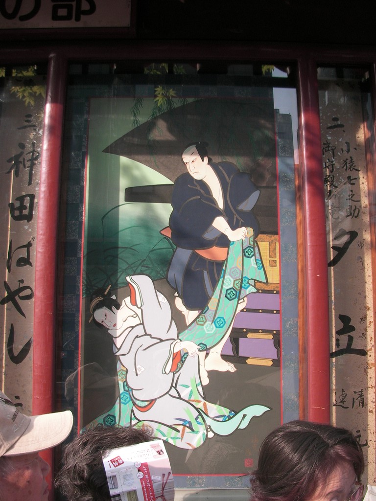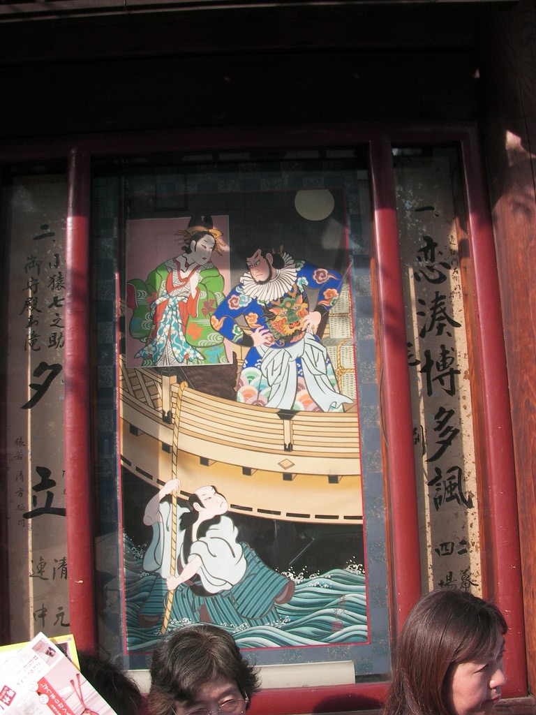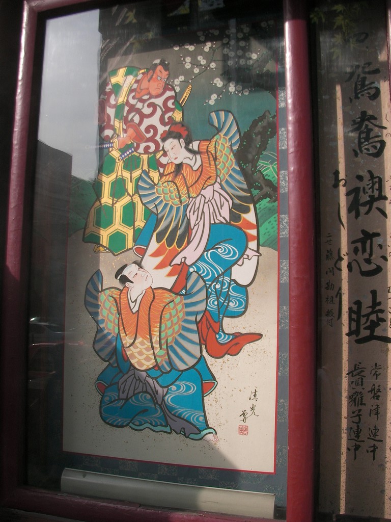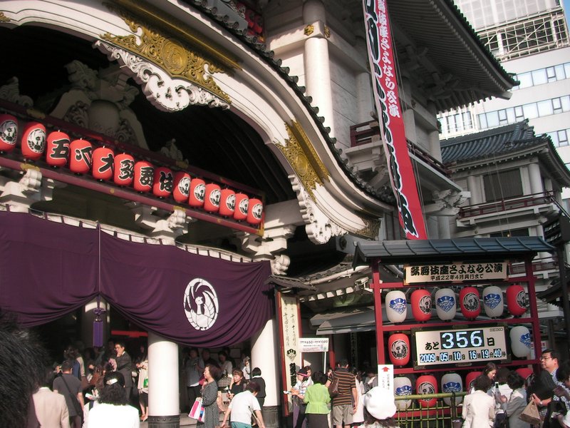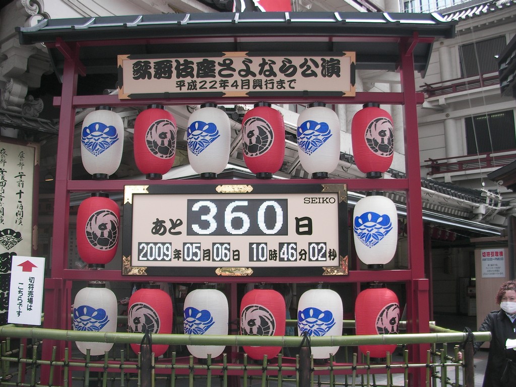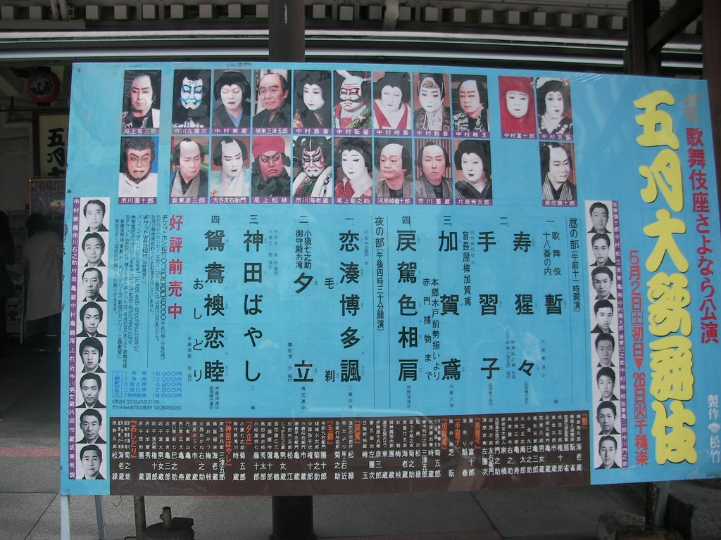 題名:歌舞伎座さよなら公演五月大歌舞伎夜の部 日時:2009年5月10日16:30-21:16(途中休憩2回あり) 劇場:歌舞伎座 料金:1等席16000円 座席:1階1列6番(最前列左より) 番組・出演: 一、恋湊博多諷(こいみなとはかたのひとふし) 毛剃 毛剃九右衛門 團十郎 傾城小女郎 菊之助 中国弥平次 権十郎 小倉伝右衛門 市 蔵 徳島平左衛門 亀 蔵 加田市五郎 松 江 じゃがたら三蔵 男女蔵 浪花屋仁三 亀 鶴 座頭盛市 彌十郎 奥田屋お松 秀太郎 小松屋宗七 藤十郎 二、小猿七之助 御守殿お滝 夕立(ゆうだち) 小猿七之助 菊五郎 御守殿滝川 時 蔵 三、神田ばやし(かんだばやし) 家主彦兵衛 三津五郎 桶屋留吉 海老蔵 娘おみつ 梅 枝 女房おかね 右之助 隠居おらく 市 蔵 行者陽山 亀 蔵 若い者正太 亀 寿 若い者新七 巳之助 店子重吉 亀三郎 店子源太 男女蔵 店子清兵衛 権十郎 店子加蔵 秀 調 店子惣助 團 蔵 四、鴛鴦襖恋睦(おしのふすまこいのむつごと) おしどり 遊女喜瀬川/雌鴛鴦の精 菊之助 河津三郎/雄鴛鴦の精 海老蔵 股野五郎 松 緑 一、恋湊博多諷(こいみなとはかたのひとふし) 毛剃 毛剃九右衛門(團十郎)が持ち主である元船に、小松屋宗七(藤十郎)が乗り合わせます。やがて 宗七は毛剃の手下(権十郎・市蔵・亀蔵・松江・男女蔵・亀鶴)の様子から、この船が密貿易をして いることを知りますが、毛剃は秘密を知った宗七を海へと投げ込ませます。 ところは変わって博多の廓。ひときわ賑やかな奥田屋では、女将のお松(秀太郎)が傾城と言い争 う座頭の盛市(彌十郎)をなだめています。ここへ九死に一生を得た宗七が現れて、恋仲の傾城小女 郎(菊之助)と再会します。宗七と何としても添い遂げたい小女郎は、自分の馴染みの客に金策を頼 もうと言い、宗七とその馴染みの客を引き合わせますが、その客こそ...。 異国情緒溢れる作品を華やかな顔ぶれで上演する注目の舞台です。 二、小猿七之助 御守殿お滝 夕立(ゆうだち) 小猿七之助(菊五郎)は、かねて見初めた御守殿の滝川(時蔵)が、落雷によって気を失ったのを幸 いに我が物にしてしまいます。そして七之助の男ぶりに惚れた滝川は、その身を七之助に任せ、夕立 の降る中、手に手を取って立ち去っていくのでした。退廃的な気分が濃厚な清元の舞踊をご覧下さい。 三、神田ばやし(かんだばやし) 神田にある長屋の家主彦兵衛(三津五郎)の家に、念仏講の講中が集っています。その面々は彦兵 衛の女房おかね(右之助)や、隠居のおらく(市蔵)、行者の陽山(亀蔵)とその娘のおみつ(梅枝)。そ して惣助(團蔵)、加蔵(秀調)を始めとする店子(権十郎・男女蔵・亀三郎)の人々と、町内の若い者 (亀寿・巳之助)たち。ここへ桶屋の留吉(海老蔵)が遅れてやって来ます。そして講中の掛け金が無 くなるので騒ぎとなるところ、留吉がそそくさと立ち去って行くので、彦兵衛は留吉が掛け金を盗んだと 思い...。 宇野信夫の佳品を清新な顔ぶれでお楽しみ頂きます。 四、鴛鴦襖恋睦(おしのふすまこいのむつごと) おしどり 遊女の喜瀬川(菊之助)が行司となって、河津三郎(海老蔵)と股野五郎(松緑)が相撲を始め、この 勝負に負けた股野は、河津に喜瀬川を譲った上、源氏に味方することを約束します。とはいえこれを快 く思わない股野は、河津を陥れるために、雄の鴛鴦の生血を河津に飲ませ、その心を乱そうとします。 やがて雄を股野に殺された雌の鴛鴦の精(菊之助)が現れると、河津の姿で雄の鴛鴦の精(海老蔵)も 出現し、恨み重なる股野を悩ませていきます。 上の相撲は長唄、下の鴛鴦は常磐津という華麗な舞踊劇を上演します。 ----- 今回の番組はすべて初見です。 一階の最前列、花道の右から2番目という席です。花道のすっぽんが目の前に見えます。 多くの役者さんがほんとに目の前で見得を切ってくれましたよ。 端っこなので前が花道の下を通る階段、そして柵、足下の細い隙間を通ろうとする客たち、かなり無理の ある構造ですがな。ひょっとして昔は花道下通路なかった? 最初は抜け荷の船に同乗して海に落とされた男が、実は抜け荷の親分と恋敵だったという話。抜け荷 の親分の太っ腹で、手下になるのと引き替えに、命を助けるばかりか恋しい花魁の身請けをしてもらうと いうハッピーエンド、ほんとにハッピーエンド? もともとが浄瑠璃で上中下とあるところの上しか歌舞伎では演じられないとのこと。後はどろどろした話 になっていくんでしょうね。 船の大仕掛け(回り舞台を使わず船が回る!)、船の舳先での見得、茶屋での交渉などが見物。しかし 海の中では黒衣も青いのですね。新しい発見でした。 次は短い作品。 ストーカーで強姦魔に女が惚れてしまうというはなし。二人の踊りがきれい。どこかから教育上よくないと いうつっこみがあってもおかしくないような筋書きです。ところで夕立で供の者全員逃げ出すってなによ。 神田ばやしは昭和に作られた作品。主役の海老蔵の目がずっと泳いでいます。なにをやってもタイミン グがずれて、妙な間ばかり。そこで笑いがたくさんはいる。