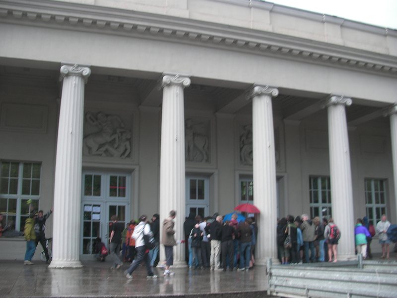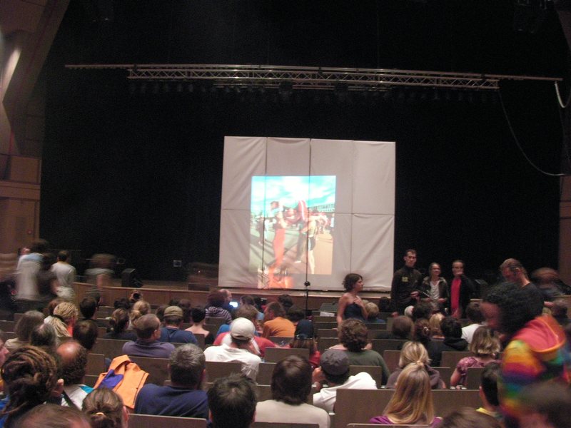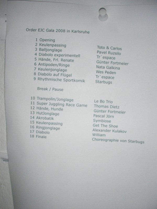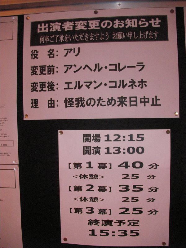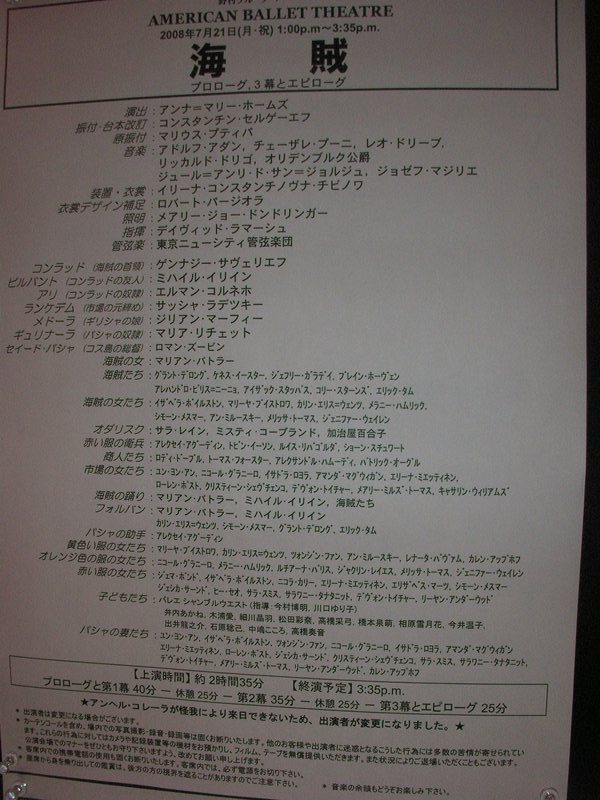 題名:PARADIS LATIN Cabaret 日時:2008年8月10日21:30-23:00 劇場:PARADIS LATIN Cabaret(パリ) 料金:82EUR(1EUR=170JPY)(シャンパンハーフボトル付) 座席:最後列センターテーブル パリに到着当日夜なので近場のショーを探して見にきました。 地球の歩き方に載っているキャバレーです。 ホテルから歩いていけるところだったので、開演2時間前に一応現地で 予約をいれました。そしたら最後列のはしっこ、トイレの前(涙) でも最後列センターにいたカップルがちょうど端の方ですが前方に 動いていったため、私も比較的見やすいこの席を確保。 場内はほとんどたいらで、最後列と右端、左端の席だけが一段高くなって います。いずれのテーブルも舞台に横向きで、座ると舞台は横を見る形と なります。右端と左端の席だけが舞台に対して向いて座れてますね。 客席は8割がた埋まっています。天井は意外と高くて、どうやらコの字形に 2階席もあるみたい。客席内に2階を支える柱がいくつかあり、さすがに その後ろは見にくそう。ディナーをとることもでき、その場合は117EURから、、 その場合は20時からディナーを食べることになります。有名どころのキャバ レーより安価なディナーですが、それでも5000JPYだと思うとひとりで食べる 気にならず、飲み物だけということで。 客の服装はくだけたものが多く、少しおめかししたという人がちらほら いる程度です。お子様連れもかなりあり。料金に含まれているシャンパン はCanard Duchene(最初のeに山形記号)。 オープニングは練習風景のビデオ映像からはじまりました。コーラスライン でも始まるような雰囲気、それから楽屋の映像になり、楽屋で準備していた ひとたちが舞台にでてショーの開始!オープニングはダンス、やっぱり こういうシーンではダンスチームとおっぱいチームがわかれているんですね。 天井からブランコに載ってMCと歌姫がおりてきました。そしてどうやらショー 一番のダンサーが最後に登場。もう明らかに他より足が長い! それから男性歌手と一緒に給仕たちが舞台にあがって合唱。 次は映像で1920,1945,1970,2000年を表示して、その年のダンスを踊るというもの。 映像を出している最中に場面転換するのですね。チャールストン、ジャズ、 ゴーゴー?、2000年は??。2000年ではブラックライトを使っての骨人形ダン スもあり。また天井からブランコがおりてきて、今度は下から筋骨たくましいお 兄さんが綱を伝わってあがっていきます。まずはブランコの上でのバランス芸、 綱を絡めたり、背中でブランコにバランスして乗り、足の甲だけでブランコにぶら 下がったり、ブランコの回りを一回転したり。一応命綱らしきものはつけていると いうものの、真下は観客の海、通常の曲芸とは違った難しさがあると思われます。 そこから紐で引っ張る助手の力を借りてブランコをこぎ始めました。手前にこぐ と2階席の天井で見えない!まさか私の座っている席で見切れが起きようとはね。 ちょっと前の方まで出て通路にしゃがみこんで上を眺めていましたよ。 やっていることは比較的シンプルで、揺れているブランコに足の甲だけでぶら 下がっている状態で大拍手。最後には後ろにあるブランコに飛び移るという大技、 えーとここで失敗すると落ちるの?前のブランコをこいで、後ろのブランコに移って、 それを飛び越し、というかブランコを踏み超えて、手首に繋がったゴムでびよよーんと ぶら下がりました。後ろのブランコはニセモノというか、飛び移る目標に過ぎない のですね。踏み越えた段階で梯子が壊れてました。手首のゴムは飛び移る前から つけられているので、客の上に落ちる心配はありません。よくできたものです。 それからどうやらサロメらしいヌードダンス。他のキャストももちろんシースルー。 今度は舞台上に車がでてきました。そして映像上で道路を暴走。映像はスリル満点。 ダンスにかわり、雨に歌えばの一シーンのような、足の先に帽子をひっかけて踊る ところあり。それから天井から宇宙船、宇宙人が降りてきて地球人を侵略、女性を全て 宇宙人化してしまうというダンスネタ。他に歌とダンスがいくつかあって、最後には カンカンで締め。やっぱりカンカンはチラリズムの極致いってますねえ。 フィナーレは大階段が出てきてそこでカーテンコール。 かなり興味深くみることができましたが、現在の為替レートでは日本人には高すぎる ないようですね。せめて1EUR 100円になってくれればなあ。 ところでお子さん多数いるのにおっぱいいいんですか? PR 題名:EJC2008 Galashow 日時:2008年8月9日20:30-23:30(途中休憩あり) 劇場:the Brahmssaal in the Karlsruher Stadthalle(カールスルーエ、ドイツ) 料金:EJC2008通し料金120EURの中に含まれる 座席:劇場中央(たぶん12列目) 私のガラショーのチケットは8時半からのものです。 7時にはシャトルバスに乗ってガラショーの会場に到着! 会場は市の中央にある多目的ホールで、会場名は the Brahmssaal in the Karlsruher Stadthalle 収容人数1700名という大き