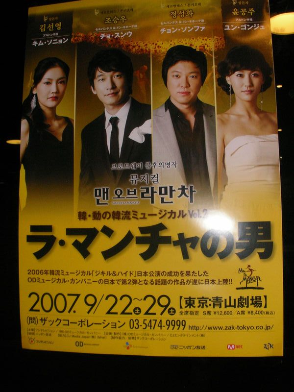 題名:中西和久のエノケン 日時:2007年10月6日19:00-20:45 劇場:紀伊国屋ホール 料金:前売り4500円(招待券) 座席:P列15番(後方通路側) 作・演出:ジェームス三木 舞台美術:妹尾河童 出演:中西和久、隈本吉成 、黄英子 、渋沢やこ 長戸綾子、小河原真稲 、井上思麻 、海浩気 まんたのりお 、ズッカーマン明子 、ヤビマーヤ 音楽劇と書いてありました。 舞台の左にはベースとピアノ、右にはバイオリンにトロンボーンなど。 ピアノとベースから始まって、キャスト全員による合奏で幕が開きます。 しかし、、、へたくそ、リズムも音もずれまくり。 まあ役者が下手なのは愛嬌にしても、楽しそうじゃない。 いっぱいいっぱいでやっていてどうにもはいりこめない。 オープニングくらいはしっかりれんしゅうしといてくれよー。 物語はエノケン役の中西氏の一人語りで進みます。 そこにダンスやちょっとした役者の絡みがあるという感じ。 「おーい中西でてこい!」で本物のエノケンが文句つけてる という設定から始まるんですが、なんちゅうかあまりにくさすぎ。 エノケンの半生がほとんど語りのみで描かれるわけです。 非常によく知った曲がたくさんでるので、脚本としては悪くない 出来だと思う。でもこの劇場の中で座長が一番楽しんでいて それが客を巻き込んでいない、拍手をしようにもためらわれるような 場面が多くなんといいますかという雰囲気。これがもっと小さい 劇場でファンばかりであればまた違ったことでしょう。 あとでふと気がついたのですが、この作品は形を変えた大衆演劇 なのではないかと。座長に惚れている人が見ればよい作品 でしょう。そうでないとなんちゅー独りよがりなという見方しか できないような気がします。 大道具は書割をぱたぱた置き換えて場面を変えるものでした。 それにしても公演期間が3日間というのは興行として儲けることを 考えていないように思えます。 PR 題名:ラマンチャの男 日時:2007年9月27日18:30-21:10(途中休憩あり) 劇場:青山劇場 価格:S席12600円(+eplus手数料) 座席:1階XE列25番(4列目センター) 出演: ドンキホーテ:チョスンウ ラマンチャの男は東京、BW,ソウルで見ています。 http://homepage3.nifty.com/k/99review.html#32 http://homepage3.nifty.com/k/03reviewBW.html#09 http://stage.blog.shinobi.jp/Entry/112/ この中でソウルが一番感動した(たぶん生涯観劇 ミュージカル作品の中で5本の指にはいる)ので それを期待して見にいきました。 劇場内は女性ばっかり。私が座った前方センターブロックは 10列目くらいまで男性は私を含めて3人だけ。。 しかし満席というわけではなく左右の端、2階席などは けっこう空きがみえていました。 当然のことながらハングルによる演技。全員が韓国人 キャスト、左右に字幕。前説も日本語とハングルでした。 チョスンウはさすがに演技がうまい。セルバンテス、 ドンキホーテ、アロンソを一瞬にして移り変わります。 特にセルバンテスから病床のアロンソに変身したのが 一番すごかった。 本当にセンターに座っていたのでドンキホーテが私に 向かって語りかけてくるような気がしましたよ。 サンチョパンサもなかなかかっぷくよし。 コーラスとして好きだったのは懺悔のシーン、神父さん の声がよく通っていました。 大道具は奇をてらったものではなく、きわめてオーソドックスなもの。 舞台の後ろに生オケがいるという配置でアンサンブルもまずまずの水準。 ただ、、この前ソウルで見たときの感動がないのよね。 ステージとしての出来は並みの日本版ミュージカルより 上だと思うのだけれど、ソウルで見たときの号泣はおきません。 もっとも病床のアロンソがドンキホーテと変身するときに 私の隣で号泣しているおねえさんがいましたけど。 なんちゅうか微妙にアンサンブルのレベルが。。。なのかなあ。 舞台を見ていてどうも不完全燃焼の気分。。 題名:憑神 日時:2007年9月16日12:00-15:00(途中休憩あり) 劇場:新橋演舞場 料金:1等12600円 座席:1階2列24番(2列目センターブロック) 原作:浅田次郎(新潮社刊) 脚本・演出:G2 美術:金井勇一郎 照明:高見和義 音楽:佐藤史朗 音響:井上正弘 衣裳:前田文子 殺陣:諸鍛冶裕太 所作指導:中村光江 演出助手:山田美紀 舞台監督:青木義博 制作事務:前本のりこ 出演: 中村橋之助、鈴木杏、升毅、デビット伊東、葛山信吾、 藤谷美紀、秋本奈緒美、野川由美子、螢雪次朗、 笠原浩夫、初嶺麿代、福田転球、大月秀幸、及川直紀、 小松利昌、中村橋弥、関秀人、園岡新太郎、陰山泰、 コング桑田 1階はほぼ満員、2回はサイドがあいているかんじかな。 映画がおもしろかったので見にいったのですが、うーん。 非常に濃い人たちを配役した割には使い方がもったいない。 死神役の鈴木杏は単にでてるだけ。説得力のないシナリオ。 オープニングで派手な立ち回り、途中で軍艦による海戦の解説 など映画に比べて追加されてますが、なんかとってつけたみたい。 そのくせ、つじつまあわせをしゃべりで解説してしまうところが何箇所も。 疫