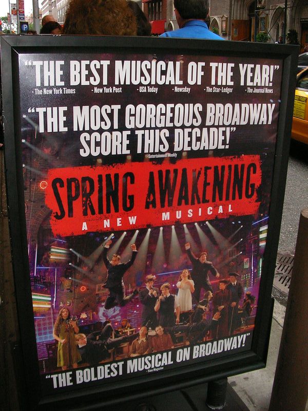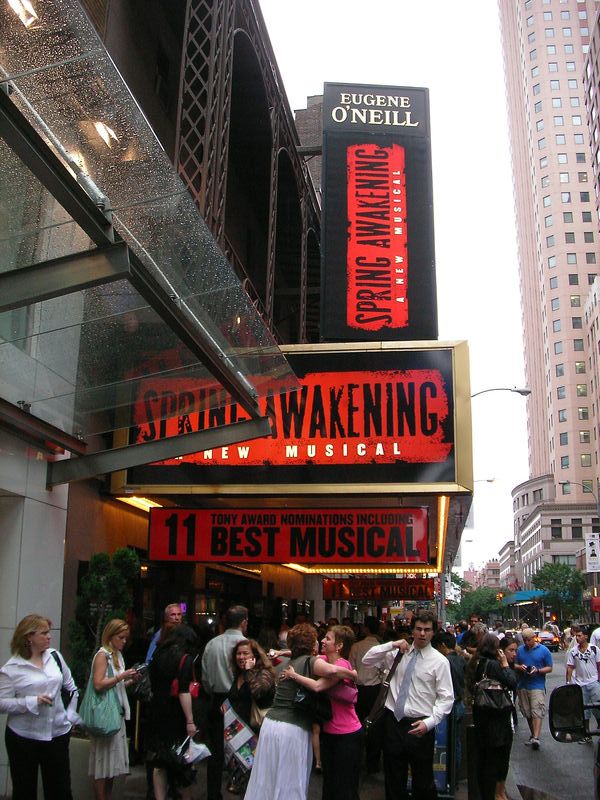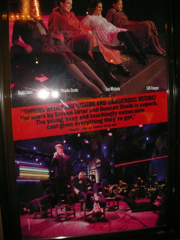 題名:Sleeping Beauty 日時:2007年6月4日20:00-23:00(途中休憩あり) 劇場:Metropolitan Opera Theatre 料金:ORCH Prime 91USD 座席:ORCH C105 指揮:Ormsby Wilkins 原振付:Marius Petipa 追加振付&場面:Kevin McKenzie, Gelsey Kirkland, Michael Chernov 出演: Princess Aurora: VERONIKA PART Prince Desire: MARCELO GOMES The Liac Fairy: Stella Abrera(代役) The Fairy Carabasse: Gelsey Kirkland King Florestan: Victor Barbee His Queen: Susan Jaffe Catalabutte, the King's Chief Minister: Wes Chapman The Fairy of Sincerity: Maria Riccetto The Fairy of Fervor: Kristi Boone The Fairy of Charity: Melissa Thomas The Fairy of Joy: Sarah Lane The Fairy of Valor: Adrienne Schulte(代役) The Fairy Knights: Alexandre Hammoudi, Jared Matthews, Carlos Lopez, Sascha Radetsky, Craig Salstein, Gennadi Saveliev The Russian Prince: Vitali Krauchenka The Spanish Prince: Alexandre Hammoudi The Indian Prince: Jared Matthews(代役) The Celtic Prince: Cory Stearns The Counterss: Maris Bystrova Gallison, the Prince's Aide: Vitali Krauchenka Puss-in-Boots and the Cat: Hee Seo and Alejandro Piris-Nino Red Riding Hood and the Wolf: Caity Seither and Luis Ribagorda Cinderella and Prince Charming: Maria Bystrova and Vitali Krauchenka The Bluebird and Princess Florine: Xiomara Reyes and Herman Cornejo World Premier のこの作品、オープニングが3日前でした。 でもSleeping Beauty 見るのが初めてなので 初演でも何が違っているのかわからない私(^^;) オープニングはもちろんオーロラ姫のお誕生祝い、皆さんきらびやか に踊ります。その中で魔女さん登場。この人だけストレートプレイ の舞台で演技をしているかのように見えます。ものすごい存在感で、 かっこいい。使い魔としてバッタ?を付き従えています。バッタは かぶりもので、こんなもの着てよく踊れるなーと感心しちゃいましたよ。 呪いをかけられた王様は、城中の糸つむぎ車を捨てさせます。 もちろん、魔女が糸つむぎ車をもってきて城の民にもたせちゃいます。 そんなもの見たことないオーロラ姫はのーてんきに触ってしまって 呪い発動!! ばったり寝てしまったところ、良い魔女がきて、王女 と一緒に他の者も眠らせてしまいます。王様と御后様は目覚めたまま 別の場所へと、、えっとこんな話でしたっけ(^^;) こいつほんとに 良い魔女なのかーと突っ込みいれてしまいましたよ。 オーロラ姫のVeronika Part はめっちゃくちゃ美人、本当に光り輝く ような姿、これで踊られたらたまりません。スタイルもアンサンブル より一段と良く、決めのポーズはほれぼれしてしまいます。アラベスク の姿勢をずっととりながら、誕生祝にきた王子たちに次々に手をとる シーンなどすごく美しい。ただ、動いているときはいまひとつぴんと こなかったのですね。背中の筋肉のつき方もいまひとつ。 Marcelo Gomes はたくましさと回転が魅力でしょうか。とにかく良く 回る、でもジャンプがあまり高くない。 4幕目の結婚式には参加者として、赤頭巾、青い鳥、シンデレラ、 長靴を履いた猫が揃い踏み。前の幕に出ているならともかく、ここで だけ出るのは演出としてなんだかはずしているような。猫は被り物で CATSでも始まるのかと(汗)、青い鳥の男性ダンサーがすごい! 本当に空を飛んでます。滞空時間の長いジャンプ、重力を無視して ふわっと浮き上がってどこまでも飛んで行きそう。これだけ見ていたい かも(^^;)ここで拍手でショーストップ。 皆さん気持ちは同じようです。 さて全体を通じてまずまず楽しいできです。こういうの見てるとディズニー がバレエに進出しないのが不思議に思えてきます。 ところで、王様はいったいどこに行った? PR 題名:Spring Awakening 日時:2007年6月3日19:00-21:20(途中休憩あり) 劇場:Eugene O'Neill Theatre 料金:手数料込み120.5USD 座席:Center Orchestra Row A, Seat 108(最前列ど真ん中) 演出:Michael Mayer(TONY賞演出賞受賞) 脚本:Stephen Sater(TONY賞脚本賞受賞) 振付:Bill T. Jones (TONY賞振付賞受賞) 作詞: Stephen Sater(TONY賞Score賞受賞) 作曲: Duncan Sheik(TONY賞Score賞受賞) 照明:Kevin Adams(TONY賞照明賞受賞) 装置:Christine Jones 衣装:Susan Hilferty 音響:Brian Ronan 出演: Ilse:Phoebe Strole Anna:Krysta Rodriguez Wendla:Lea Michele Martha:Lilli Cooper Thea:Remy Zaken The Adult Women: Christine Estabrook The Adult Men: Stephen Spinella Otto:Brian Charles Johnson Hanschen:Jonathan B. Wright Ernst: Gideon Glick Georg: Skylar Astin Moritz:John Gallagher Jr.(TONY賞助演男優賞受賞) Melehior: Jonathan Groff TONY賞ミュージカル作品賞受賞。 私が見たのは最前列のほんとにど真ん中。舞台の前が階段になっていて キャストが降りて目前に座り込んで歌うシーンもありました。 舞台上の左右にも観客席、後ろにバンド、黒板に曲名が書いてある オープニングは椅子の上に立って歌う、のっけからハイテンション。 思春期のもやもやこそばゆい感満載、Boy Meets Girls もので 1幕の最後は床を吊り上げた舞台中央のベッドで文字通りベッドイン。 そこまで一気呵成にいっちゃいます。皆元気だ、皆かわいい! 皆すごいエネルギッシュ!見ていてうきうきしてしまいます。 私はすごい近距離で見ているので色々見えるわけですわ。2幕冒頭は ベッドインしたかっこうで舞台前の階段に座り込んでの歌。ヒロイン の胸の谷間がとても眩しい。足