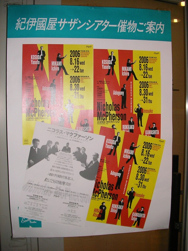 日時:2006年8月22日19:00-20:30 劇場:紀伊国屋サザンシアター 料金:5500円? 座席:15列目通路補助席 作:後藤ひろひと(Piper) 演出:竹下宏太郎(Piper) 出演:小須田康人 みのすけ(ナイロン100℃)三上市朗(劇団M.O.P) 六角慎司 平田敦子 アドゴニー / 川下大洋(Piper) なまちゃんの日記にそそられて千秋楽を見に行きました。 実はあなどっていて開演5分前に行ったら当日券はキャンセル待ち。 それでも補助席に座れてせーふ。15列目の見やすい席でした。 私は初演を見てたのねー。記憶からふっとんでいたのが情けない。 http://homepage3.nifty.com/k/99review.html#43 舞台をみるにつけ、ああそうそうと思い出していきました。 読んでないと思って読み始めたミステリーのネタを実は知っていたという気分です。 今回は小須田さんが凄く良かった。かっこいいです。 違う場所での会話が同じセットの上で交互に行われて いるのに、見事にかみ合うように見える脚本は見事。 1時間半という短い上演時間で濃密な空間を描いてくれて 見ごたえがあるのに疲れない。お勧めの作品です。 もっとも本日は東京千秋楽ということもあり、カーテンコールで全員紹介をやって ちょびっとのびました。 999年に上演されましたPiper第2回公演作品『ニコラス・マクファーソン』の再演が決定! 後藤ひろひと大王による書き換えに加え、今回演出を担当するのは米米CLUBの復活 でも話題を呼んでいる竹下宏太郎!さらに出演者陣には小須田康人、みのすけ、三上市朗、 六角慎司、平田敦子、アドゴニー、川下大洋と実力派勢揃い! 〔あらすじ〕 白翠館、葵の間。日本との国交成立の調印式出席のため来日したとある国賓ニコラス・マ クファーソン。しかし、国交成立に反対する組織により、調印式の場にて彼を暗殺するとの 情報が!ニコラス・マクファーソンを暗殺の危機から守るべく迎賓館で夜通しボディガード のリハーサルを行う二人の刑事。一方迎賓館近くの倉庫に迎賓館内部とまったく同じセット を作りニコラス・マクファーソン暗殺の予行演習を行う殺し屋二人。果たしてどちらの作戦 が勝つのか?