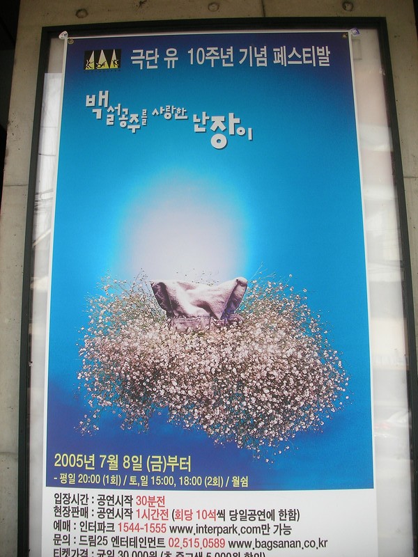 題名:谷山浩子・猫森集会2005 Dパターン 日時:2005年9月25日17:30-19:45 場所:全労災ホール スペース・ゼロ 料金:前売6500円 座席:11列17番(正面座席後方から3列目) 出演:谷山浩子、石井AQ、山口とも(パーカッション) 曲目: ♪まっくら森の歌 ♪森へおいで ♪洗濯かご ♪elfin ♪王国 <山口ともさん登場> ♪わたしはとっても寝起きが悪い ♪公爵夫人の子守唄 ♪ハートのジャックが有罪であるところの証拠の歌 ♪ウミガメスープ ♪パラソル天動説 ♪トライアングル ♪白鯨のテーマ ♪意味なしアリス ♪ボクハ・キミガ・スキ ♪SORAMIMI ♪カントリーガール ◎僕は帰るきっと帰る <浩子さんのみ再登場> ◎ここにいるよ 中央に舞台がある客席構造でした。満員。私は通常の正面の後方席。 最初から4曲マイナー続き、なんでも好きなのでマイナーばっかりになるそうな。 私も谷山さんのマイナー好きですよ(^^)/ まっくら森の歌で小さな子が泣く という感想があったとか。 山口ともさんいいですねえ。あれなら小学校や幼稚園で 大人気であることは 想像に難くありません。 「僕は帰るきっと帰る」のパーカッションが圧巻。 焼肉網にスプーンやフォークをぶらさげた楽器が思いのほか美しい音色を出す のでびっくり。 そいえば、ともさん登場時の音楽がなんだかちんどんやのリズムに聞こえた。 公爵夫人の子守唄も励まし系だったのか(笑) パラソル天動説でいろんなものを回すとおもしろいかも。 最初はがんがん回して おいて天動説になったとたん、傘を回転させるのをやめて乱回しに移行かな。 ![]() PR ![]() 題名:喬之進・ストレート 二人会まっすぐ進めエピソード1 〜ファンと見なす〜 夜の部日時:2005年9月19日16:30-18:25(途中休憩あり) 場所:巣鴨ギャラリー染井吉野 料金:1500円 座席:左壁際前方 番組: ストレート松浦 真田小僧(途中まで) 柳家喬之進 おしの釣り ストレート松浦 大道芸世界一周旅行ハイパー 柳家喬之進 ちりとてちん ギャラリー染井吉野は巣鴨駅前の大通りから西側に道を1本はいったところにあります。 40人も入れば満員の会場、30人程度のいりでしょうか。昼の部のお客さんがケーキを 一杯差し入れてくれたとかで、夜の部の客には一人一個当てのケーキ配布がありました。 ありがとう>差し入れのお客様。私はチョコレート味のシュークリームをいただきました。 オープニングはストレートさんが白いマント、喬之進さんがダースベイダーのマスクを つけて登場。出囃子?はもちろんスターウォーズ。「エピソード1ファンと見なす」って 「エピソード1ファントムメナス」のもじりだったのね。全然気がつきませんでした。 開口一番は真田小僧、大人を手玉に取るこしゃまっくれたきんぼうがかわいい。 おしの釣りは初めて聞きました。与太郎+仕草噺だったのね。七兵衛が仕草で言い訳を しているところは場内爆笑。蒟蒻問答を彷彿とさせます。 世界一周は国ごとにアイテムをかえて衣装を変えてという趣向。国(中国コマ、皿回し)、 宇宙(バルーン)、ニュージーランド(ポイ)、スウェーデン(ユーロピアンクラブ)、 フランス(フットバッグ)、米国(グローボール)。衣装を全て着込んでおいて次々 脱ぎ捨てて変身というのがすごいです。天井が低い場所なのに中国コマを投げ上げて きれいにピルエットしてたのはさすが。でも狭いせいでポイはちょっと怖い(^^;) 皿回しの時は観客参加。まずは練習、、ってそれが皿回しにどう関係あるんかい? と突っ込みをいれたくなったパターンが次の米国で殺陣となったのはなかなか面白い 趣向でした。赤と青の長い風船でスターウォーズやってました>宇宙。 最後はフロア全体を暗くしてグローボール、いやー間近で見るときれいですねえ。 私も欲しくなりました。 トリはちりとてちん、ちりとてちんをいかにも苦しそうに食べてる竹やんの表情がいいです。 喬之進さんを今回はじめてみたのですが、仕草や表情にめりはりがあって良いですね。 また聞いてみてもいいかも。 題名:白雪姫を愛した小人2005 (A Dwarf who loved Snow White) 日時:2005年9月18日15:00-16:30 場所:ユシオト(ソウル) 料金:30000ウォン 座席:1階C-1(3列目左端) ユシオトでYouth Theater だったのね。 河南区庁の4番出口を出て交差点へ戻り右へ曲がり坂を下り、学校を過ぎて 大通りとの交差点との手前の道を大きな焼肉店を過ぎて少し行くと ちょっと道を左へ曲がったところにあります。駐車場の片隅にBOXOFFICE、 劇場は地下でした。TicketParkの掲示板ではチケット求むがかかれてましたが、 当日券は多少でていました。パンフ2000、CD5000、絵葉書とのセット1万、 パンフとCDを買ってみました。パンフレットには英語なし。せめて宝塚の ようにシノプシスだけでも英語にできないかなあ。 タイトルから予想したほど子供連れは多くありません。1割程度でした。 A,B席は椅子が低く、C列から階段状になっていました。1階はK列まで、 2階はもう少し小さそう。1列16人、前後は10列、2階もあるので、 劇場のキャパは300人程度かな? 舞台は唐草もよ