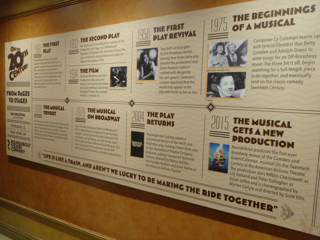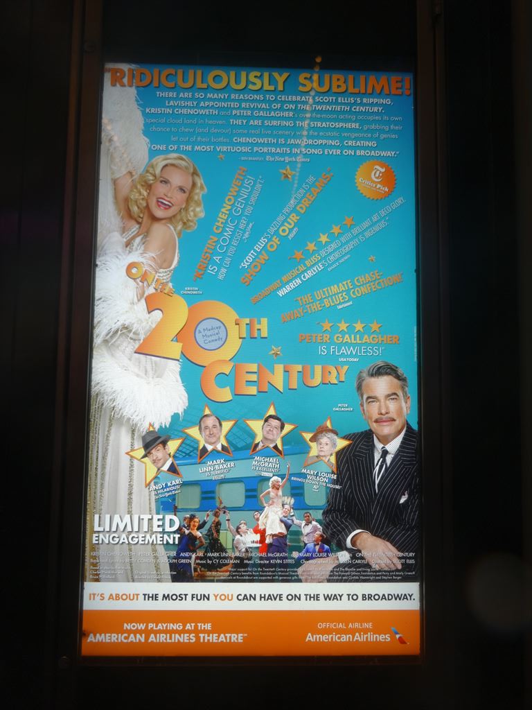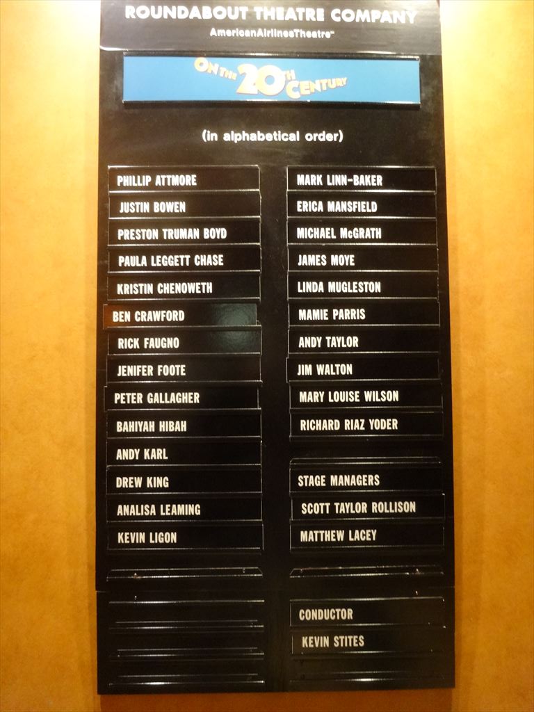 題名:Curious Incident of the Dog in the Night-Time, The 劇場:Ethel Barrymore Theatre 日時:2015年6月3日14:05-16:40(途中休憩あり) 料金:Broadway Box割引 99USD 座席:ORCH BB107(最前列センター) Cast Lists: Alex Sharp(Christopher) TONY Awards(Best Performance by an Actor in a Leading Role in a Play) Taylor Trensch(Christopher [at certain performances]) Francesca Faridany(Siobhan) Ian Barford(Ed) Enid Graham(Judy) Helen Carey(Mrs. Alexander/Posh Woman/Voice Six) Mercedes Herrero(Mrs. Shears/Mrs. Gascoyne/Woman on Train/Shopkeeper/Voice One) Richard Hollis(Roger Shears/Duty Sergeant/Mr. Wise/Man behind Counter/Drunk One/Voice Two) Ben Horner(Mr. Thompson/Policeman 1/Drunk Two/Man with Socks/London Policeman/Voice Three) Jocelyn Bioh(No. 37/Lady in Street/Information/Punk Girl/Voice Five) David Manis(Reverend Peters/Uncle Terry/Station Policeman/Station Guard/Voice Four) Keren Dukes(Ensemble) Stephanie Roth Haberle(Ensemble) Tom Patrick Stephens(Ensemble) Tim Wright(Ensemble) Production Credits: Marianne Elliott (Direction) TONY Awards(Best Direction of a Play) Bunny Christie (Scenic and Costume Design) TONY Awards(Best Scenic Design of a Play) Paule Constable (Lighting Design) TONY Awards(Best Lighting Design of a Play) Ian Dickinson for Autograph (Sound Design) Finn Ross (Video Design) TONY Awards(Best Scenic Design of a Play) Scott Graham and Steven Hoggett (Choreography) Adrian Sutton (Music) Other Credits: Written by: Adapted by Simon Stephens from the novel by Mark Haddon Synopsis: The play tells the story of Christopher, who becomes a suspect when a neighbor's dog is speared with a garden fork. He embarks on a mission to discover the truth about the dog’s untimely death, recording everything in a notebook — even though his father has forbidden it. Drama Desk Awards 各賞受賞 Outstanding Play,Outstanding Actor in a Play(Alex Sharp), Outstanding Director of a Play(Marianne Elliott), Outstanding Lighting Design(Paule Constable),Outstanding Projection Design(Finn Ross), Outstanding Sound Design in a Play(an Dickinson (for Autograph)) TONY賞プレイ作品賞受賞。 舞台はさほど高くないので、最前列でも見切れありません。 四角形で罫線がはいっている舞台。キャストはその片隅にすわり、必要な時に立ち 上がって演技をし、そして時としてマイム等で舞台装置となるのです。そのためか、 ひさかたぶりにプレイから振付賞のノミネートとなりました。ある意味ミニマムな舞台。 壁の罫線がいくつか扉となっており、小道具の鉄道模型の部品がでてきました。 プロジェクションの使い方もシンプルで印象的。 犬の死体があるところから舞台開始、そこから主人公が探偵となります。 主人公が厳密に物事を語るところでもう泣けてきました。 実は私も主人公と多少なりともあいつうじるところがあり、、主人公が世の中の矛盾?に ぶつかるたびに主人公と同じにもどかしくつらくなってしまいます。お父さんは不器用だ けどいいやつでこれまた感情移入してしまいました。みんないい人だけどそれだけでは この複雑な世の中をわたれないんですね。 鉄道線路と駅舎、人のミニチュアがおかれて、勝手に電車が動き始めて一幕終了。 1幕見終わった段階で主演男優賞を確信しましたよ。それくらいにはまり役でした。 探偵物語の1幕と違って2幕はロンドンの母までの冒険譚。 気が付くと後ろの壁に取っ手ができていて、それをよじ登ったかと思うと、今度は階段が できていてそれを歩いて降りてくる。そしてそれはエスカレータに見立てられています。 いろんなギミックがあるなあと感心してたら、後ろの壁全体が前へ迫ってくる! そして前方に溝が開いて地下鉄のホームに!人が多くて怖くてしかたない主人公の気持ち が伝わってきましたよ。 そしてネズミが逃げてホームから線路に飛び込む!文字通り目の前で右往左往するひとたち。 ひかれるかと思ってドキドキした。 ロンドンにきた父ちゃんの台詞に泣かされました。 さすがにこれでいったん戻って数学の試験を受けたいと言うのはわがままだw 俺様規則があるんでしょうね。 最初からぴりぴりしたテンションのまま最後まで突っ走った舞台でしたよ。 カーテンコールになると、主人公の表情ががらりと変わって、普通の明るい笑顔になる のが印象的でしたよ。もうここでTONY作品賞も確信しました。 プロジェクションや人を土台に使った壁歩きなどの振付もありなかなかうまくまとまった 舞台だと思いましたよ。 カーテンコールが終わってみなが帰りかけた、、ところで主人公登場。 そして持ち時間4分で試験に出ていた数学の問題の証明をしてくれました。 実際にかかったのは2分でした。三辺の長さが、 n^2-1, n^2+1, 2n の三角形は直角三角形 になることの証明です。そして最後は天井から紙ふぶき! 素数の席には特別なシートカバーあり。しかし、私の席107も素数のはずだと、真剣に 割り算してしまいました。。 PR 名:On the Twentieth Century 劇場:American Airlines Theatre 日時:2015年6月2日20:00- 2時間半 料金:147USD+Web手数料6USD 座席:Orchestra A 2(最前列右側ブロック通路側) Synopsis: Hijinks aboard a luxury train trip from Chicago to New York! A financially strapped producer must convince a movie star (his former lover and leading lady) to sign on for a play ? that doesn't yet exist ? before they arrive. Based on the comedy by Ben Hecht and C