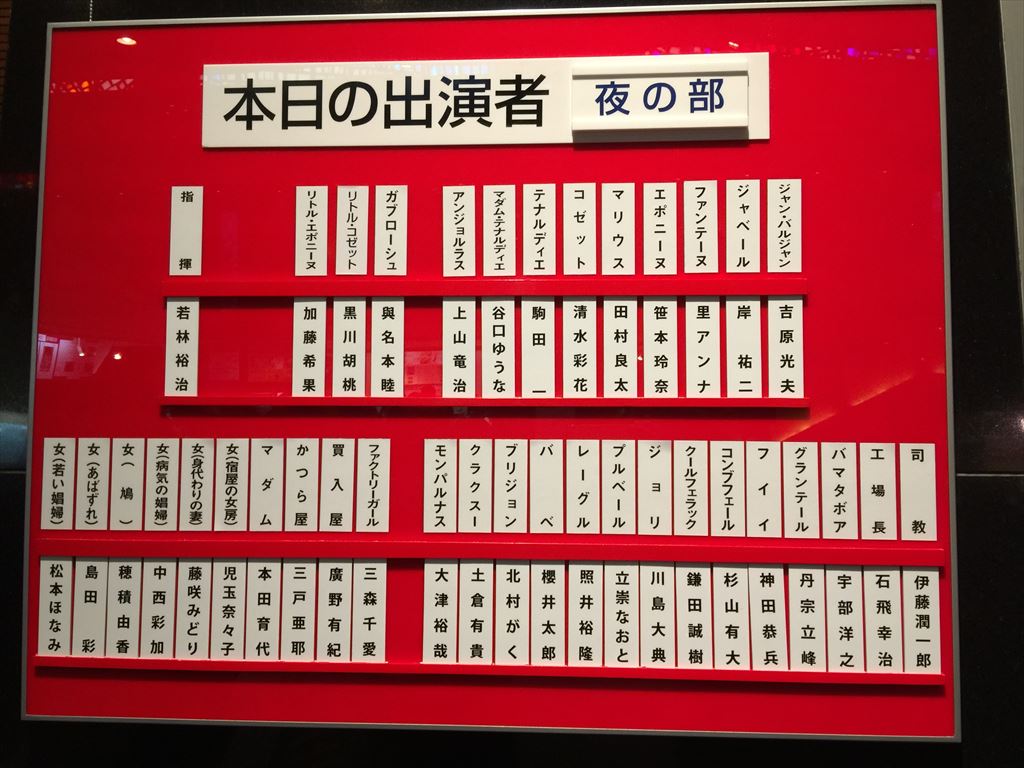 題名:Smile of Angkor 劇場:Smile of Angkor Grand Theatre(シェムリアップの街中から車で15分程度) 日時:2015年5月4日19:30-20:45 料金:Web直接予約割引25USD(定価40USD, 旅行代理店を通せばディスカウントあり) 座席:10列19番(客席中央付近) URL:http://www.smileofangkor.info/ Smile of Angkor tells the story of the Khmer empire and its wonder Angkor Vat. Travel through time and see Cambodia as it was a thousand years ago, from its legendary origins to the building of the temple of Angkor Vat. Smile of Angkor is an evocation of life in the majestic city of Angkor at the time of Suryavarman II. The show is 70 minutes long and is divided into six chapters: “Dialogue with God”, “Glorious Kingdom”, “Resurrection of the Gods”, “Churning the Sea of Milk”, “Prayer for Life and “Smile of Angkor”. Dialogue with God A child full of questions comes to Angkor and talks with God. The child travels through time, leading us on a journey to seek the mysterious Angkor Civilization. smile-of-angkor-26 jayavarman-7Glorious Kingdom Over one thousand years ago, a great Kingdom established its capital in the forest, creating a heavenly life for both men and gods. GO UP Churning the Sea of Milk This dance describes the legend of a war between the gods (devas) and the demons (asuras) fighting for Amrita, the Elixir of Life. smile-of-angkor-07smile-of-angkor-28Resurrection of God This is one of the most beautiful and mysterious relief sculptures and statues of Angkor Vat. Stories depicted in the embossments are revived and extended through the Shiva Dance and the Apsara Dance. GO UP Prayer of Life In this beautiful world, the forest looks like heaven and the peacocks dance gracefully. Lotus is blossoming? holy praying of peace echoes in the world… smile-of-angkor-10smile-of-angkor-27Smile of Angkor By smiling, people bring happiness to each other and become closer to the Gods. This is the message of the eternal “smile” of Angkor. シェムリアップのちょっと郊外にある劇場です。 なにもないところに忽然とあらわれる光り輝く建物! もうまぶしい!大型バスががんがんのりつけてました。 ロビーでは記念撮影用スポットが!一緒に撮影するのは有料です。 スタッフもアンコールワット風。 ブッフェもあるのですが私は使いませんでした。たぶん中国風。 キャストの大部分が中国人らしい 横長の舞台もまぶしい。最初はがらがらだったのですが開演前にはほぼ満席に! 客のほとんどが中国人団体観光客らしかったです。 中身はアンコールワットの歴史をレーザー光線と中国雑技、それにアプスラダンス で魅せる、といった感じでしょうか。 とにかくひかりものがまぶしい。 坊さんの大人数での詠唱、石像のかぶりものがシーン的に面白かった。 本水もつかってます。最後には水スクリーンに映像描写も。 まあシェムリアップにいてすることがなくて困ったら見に行ってもいいかもしれません。 PR 敷地内にはこんなふうにパネルでいくつもの写真が掲げられている。 社会貢献をめざしていることもパネルに記述されていた。 この属性をもっとばーんとセールスに打ち出して良いと思うんだけれど、 ターゲットとする客層の問題なのでしょうか。 これが Phare が行われるテント。 さてここからショーだ! 題名:Phare Sokha 劇場:Phare常設劇場 日時:2015年5月3日 20:00- 料金:自由席18USD 座席:客席左側最上部 URL:http://www.pharecambodiancircus.org/circus/our-shows/sokha/ 開演前の劇場の中。 左側が舞台奥、ちょうど舞台を左から見てる感じの場所に座りました 音楽は生演奏、生演奏いいなあ。 オープニングはおばあさんがまんなかにぽつり、ここから時間を遡っていくのです。 学生たちが周りをかこみ、おばあさんを少女に変身させてしまいます。 縄跳びの曲芸。 脇ではなにやらドローイング。 後ろの段ポールを使って授業開始! ダンボールを片付けつつ組体操。 人も上に積みあがって、ダンボールの積み上げ。。 うわーっと放り投げちゃう。 今度はローラーバランス。 ハンドバランス、頭に仮面をつけているので正面から見れば不思議な雰囲気のはず。 ふたりで軟体+組体操。 足で弓を引いて、矢を撃つ! このパターンの芸は久々に見ました。 でかい組体操、一番下がローラー。。 そして淡々とドローイングしてるんです。途中で逆さ絵の芸がありました。 時間が進み、代替わりして自分が教師となって生徒にジャグリングを教えるの図。 ボールを順に増やしていきました。 最後は組み体操で頭の上! なかなか興味深いステージでした。 別の番組も見てみたかったのだが、残念なことに私が帰国する当日に番組が切り替わる、、、 チャンスがあれば他のも見てみたい。 今回の Sokhaストーリーはここ! 題名:レ・ミゼラブル 劇場:帝国劇場 日時:2015年4月21日18:15-21:25(途中休憩あり) 料金:プレビューS席11000円 座席:1階M列41番 キャストみんな若いねえ、と思うのは自分がじいさんになってしまった せいか。。駒田さん以外皆若く感じます。 ファンティーヌ強い!コゼットよりエポニーヌがかわいいように感じ ちゃいました。マリウスはもちろん甘い顔と甘い声、もちろんバカ息子。 なんだかさくさくと話が進んで余韻がないかんじ。 初めてみるひとは筋書きわかるのか?とくに一気に年が飛ぶところ。。 