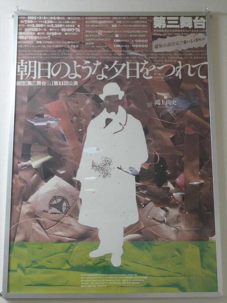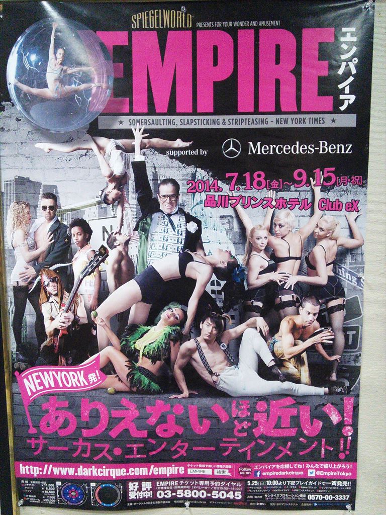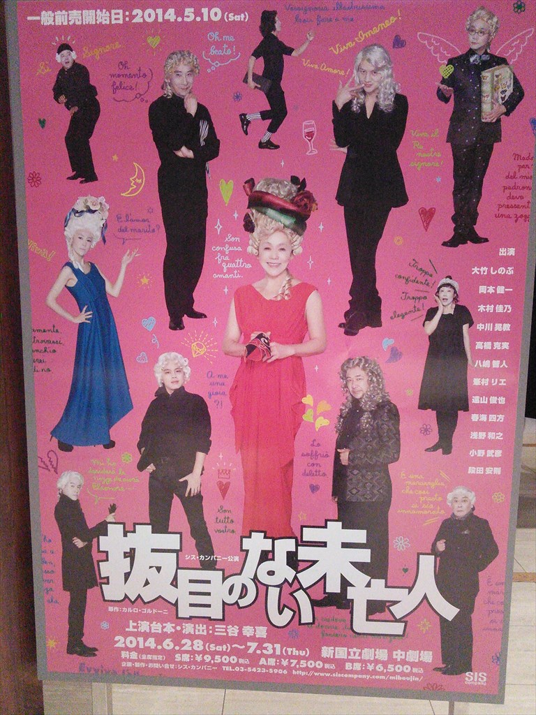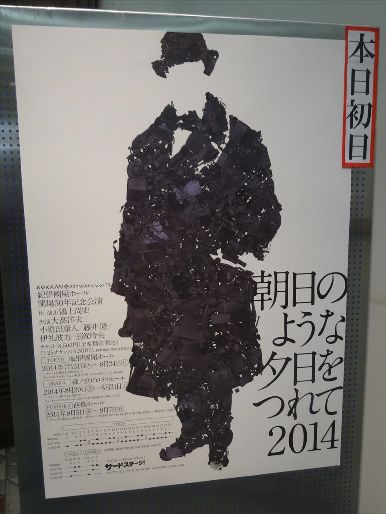 題名:スラバのスノーショー 劇場:シアター1010 日時:2014年8月6日18:30- 料金:S席8000円 座席:まんなかふきん後ろの方 URL:https://www.youtube.com/watch?v=Xlv2LutlTMU スラバのスノーショーとは: ロシア出身のピエロ=道化師であるスラバ・ポルニンが創作・演出するパントマイムショー。 初演は1993年。以降、毎年のように構成や演出が練り上げられ、20年間で世界7カ国15以上の国際演劇賞を総なめに。 「スラバのスノーショー」イメージ2 世界30カ国以上の120を超える都市で、500万人を動員している。 この作品に出演するのはピエロのみで、セリフは一切ない。 冒頭、深刻な表情で首にロープを巻きつけたピエロが、ほかのピエロたちとコミカルな芸を積み重ね、動きと表情だけで人間の喜怒哀楽を表現していく。 「スラバのスノーショー」イメージ3観客を巻き込んだ演出も特徴的。 ピエロたちの観客を巻き込んだ掛け合いや、蜘蛛の巣に見立てた糸や雪に見立てた紙吹雪が客席を覆い尽くしたりといった演出は、見る者を圧倒する。 スラバとは: 1950年にロシアのノヴォシリという地方の小さな町で生まれたスラバ・ポルニンは、チャップリンやキートンといったコメディアンに憧れて育つ。 17歳のときにサンクトペテルブルクに移ってパントマイムの修行を積み、80年代にはストリートを舞台にさまざまな芸術活動を企画・制作した。 その後、自らの劇団を結成し、1993年に「スラバのスノーショー」を企画する。 94 ~ 96年には、「シルク・ドゥ・ソレイユ」に参加。「アレグリア」の一場面を演出し、世界的な名声を得る。 一方、「アカデミー・オブ・フールズ」という芸術活動を主宰し、その拠点としてパリの郊外に「ムーラン・ジョーン」という施設を運営し、毎年芸術フェスティバルを開催している。 出演:Artem Zhimo, Robert Saralp, Georgly Deliyev, Vanya Polunin, Elena Ushakova, Alexadre Frish, Nikolai Terentiev, Tatiana Karamysheva Creator, Artistic Director:Slava Polunin Technical Director: Dmitry Ushakov Stage Technician: Dmitry Syrovatskiy Lightning Designer: Natalia Tabachnikova Sound Designer: Rastiam Dubinnikov Company Interpreter: 加瀬由希子 Comnany Manager: Anna Hannikainen Global Management and Booking: Gwenael Allan Japanese Tour Representative: Ron Nguvu 満席です。オフブロードウェイで見逃していました、今回が初見。 入場時客席にはすでに紙吹雪がまかれていました。雪の見立てなんでしょうね。 10分近くおして開演、客席は子供や外人が多い感じ。 だぶだぶな黄色のオーバーオールきたクラウンがロープをもって登場。 ぶかっとした衣装でちょっと動くと身長が自由自在! 他に横長の鍔の帽子にだぶだぶの緑のコートそれにフィンみたいな靴 をはいた者たち。シャボン玉が舞台上に出るとそのなかでボール遊び、 巨大ボール遊び、そして中に人。。 箒とベッドとカーテンで船をつくり、サメもでるのです。 矢にやられてのたうちまわったかとおもうと客席通路を疾走! 客の荷物をあちこちにもってっちゃう。 ぐずぐずやっていると幕についた埃にからめとられ、どうやら蜘蛛の巣に はまったようで。。 雪と蜘蛛の不思議な世界がずっと広がっていたのでした。 これは子供たちにうけますねえ。ロングラン公演していたのがわかります。 カーテンコールは撮影可! 大きなボールが客席上をぼーんぼん!! みんなで押し合いっこ、不思議な光景です。 キャストの方とも記念撮影。 この方が一番えらいひと? カーテンコール後にも演奏がありました。 もう終わってるんですが、みんな名残惜しそう。。 PR 題名:Theatre de Yuhi Vol.1「La Vie - 彼女が描く、絵の世界」 劇場:天王洲劇場 日時:2014年8月2日16:00-18:00(休憩あり) 料金:9800円 座席:1階H 列5番 出演:大空祐飛 《パントマイム》 いいむろなおき 《ダンサー》 珠洲春希、月央和沙、那須幸蔵、岡崎大樹、 《コーラス》 池谷京子、真瀬はるか、新良エツ子 《バンド》 白井アキト(ピアノ)、岩永真奈(ベース)、坂本暁良(ドラム)、 伊藤友馬(バイオリン)、江畑コーヘー(ギター)、菅家隆介(トランペット) <スタッフ> 企画プロデュース:大空祐飛 脚本・演出:児玉明子 解説: 1920~30年代。二つの大きな大戦の狭間、芸術の華開くパリとアメリカを中心に、 彗星の如く現れた伝説の美人画家、タマラ・ド・レンピッカ。 その人生を基に、彼女が描く絵の世界を、音楽を中心に綴る、Liveパフォーマンス。 歌、芝居、ダンス、パントマイム・・・。 大空祐飛が舞台で表現することに飽くなき探求を続ける、 Theatre de Yuhi(テアトル・ド・祐飛)の第1弾。 最初に車イスの女性が登場。 主人公が自分の一生を懐古してインタビューに答えるという形式。 台詞があるのはヒロインだけ。残りはダンサーとマイマー。 マイマーがはいると雰囲気がかわりますね。 舞台の後ろにバンド、その画家の絵が背景となります 美貌で押し出しがよく美声で動きも美しい。、 さすが宝塚の元トップです。 スタイリッシュな演出、主人公によくあってます。 題名:紀伊國屋ホール開場50周年記念公演「朝日のような夕日をつれて2014」 