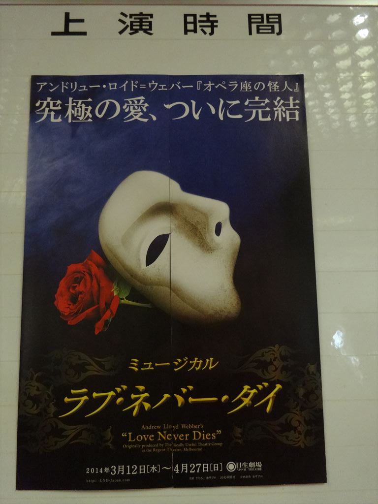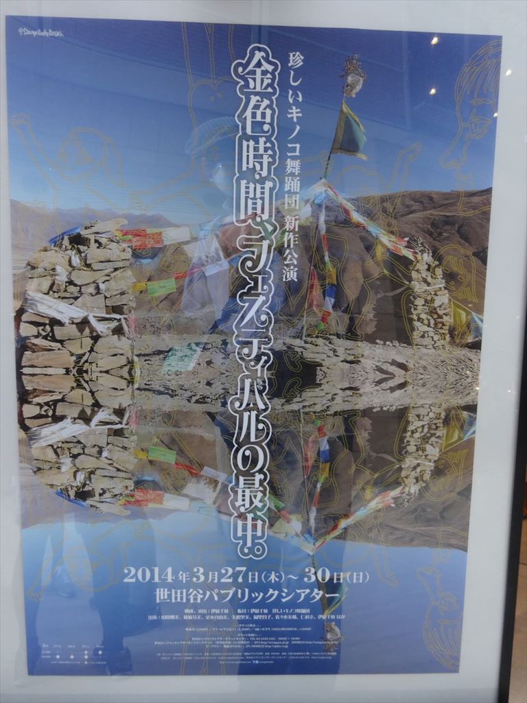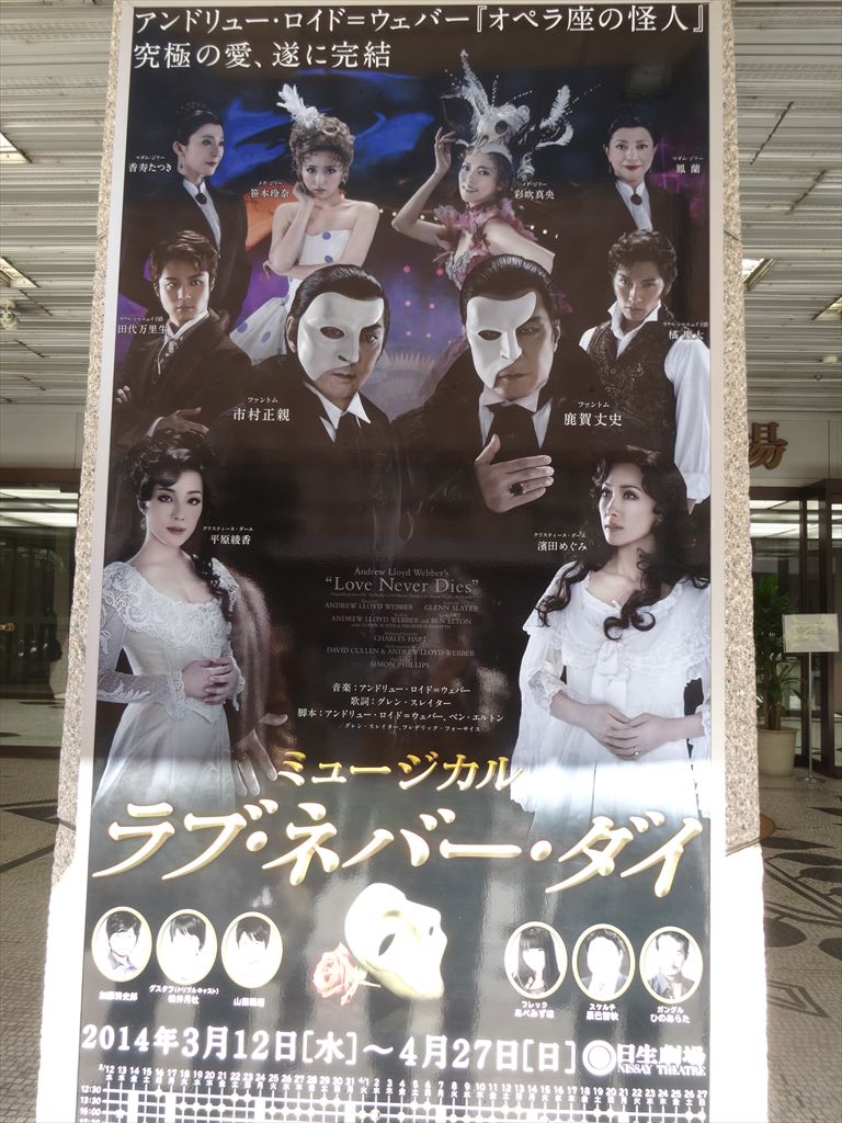 題名:エジンバラフリンジ凱旋公演「カンパニーマン」 劇場:アサヒアートスクエア 日時:2014年4月4日20:00- 料金:前売3500円 座席:いたるところ、移動して見ます 劇団:チィキィ*パークゥ 構成・振り付け・演出:智春 出演:ミス・サリバン、CHEEKY!! (Witty Look)、DAIKI(Witty Look)、SEOPPI、堀口和也 URL:https://www.youtube.com/watch?v=Pb-dwS_kV_Q どこでも座ってかまわないというアナウンスがあり、道具の上に適当に座りました。 皆スーツ姿で何か企業説明会のような雰囲気。名刺も渡してました。 危ないと思ったらすぐよけてください! 始まったと思ったとたんに座席と舞台が入れ替わりw いままで座っていた場所はなんだったの? それからは舞台が会場内を転々としてそのたびに座る位置を変える必要があるのでした。 つまり最初の位置は何の役にもたっていません。 サラリーマンの通勤風景らしきものをつり革でやったり、コーヒーカップからスタッキング。 ハンドトゥーハンド、椅子を使った軟体、とサラリーマン体操を曲芸でやったらこんな風に なるだろうという雰囲気。綱渡りもありました。ボールジャグリングとテイクアウトも。 そして最後は電話機のコードで蜘蛛の巣。それをぶちぶち切って紙を撒き散らしておしまい。 舞台移動の仕掛けといい、なんとなくサラリーマンというテーマで統一感があることといい、 たしかに通常のボードビルとは違った面白さがありました。これはうけますね。 PR 題名:金色時間、フェスティバルの最中。 劇場:世田谷パブリックシアター 日時:2014年3月29日15:00-16:20 料金:早割一般 3,000円 座席:1階 F列 15番 劇団: 珍しいキノコ舞踊団 構成・演出:伊藤千枝 振付:伊藤千枝・珍しいキノコ舞踊団 出演:篠崎芽美/茶木真由美/矢嶋里美/岡里蓉子/佐々木美和/仁科幸/伊藤千枝/ 演出補:小山洋子 テクニカルディレクター:黒田隆行 舞台監督:加計涼子 舞台監督補:弘中勲・井上和彦 照明:関口裕二(balance,inc.DESIGN) 照明操作:菅橋友紀 美術:珍しいキノコ舞踊団・関口裕二(balance,inc.DESIGN) 音響:牛川紀政 スタイリスト:早川すみれ ヘアメイク指導:伊藤礼子(SHISEIDO) 小道具制作:滝本美生子・伊佐次栄里 スタイリストアシスタント:芝田奈津美 美術協力:ステージファクトリー 傘制作:Coci la elle 衣裳協力:シカゴ 宣伝美術:珍しいキノコ舞踊団・小山睦浩(mograph) 制作:大桶真・八田朋子 解説: 珍 し い キ ノ コ 舞 踊 団 コ ン テ ン ポ ラ リ ー ダ ン ス 卒 業 宣 言 ! ! 私たち、コンテンポラリーダンスを卒業します! ただ普通にダンスをやりたいだけなんです! だって私たちにとってダンスは日常なんですもの !! ( 珍しいキノコ舞踊団一同 ) 劇場では2年ぶりとなる珍しいキノコ舞踊団の最新作! さまざまなキャラのニューフェイスも加入して、キノコの新たな金色期が開幕! ただただダンスを踊りましょう! あなた自身のカラダで体感してください !! ----- コンテンポラリーダンス卒業ということでわくわくしていきました。 客席の一部をつぶして舞台を広くしてあります。舞台は床と同じ高さ。 つまり最前列の私の目前でダンスが繰り広げられるのです 頭上には三角旗、奥にはテントとハンモック、テーブルといす、 そして脚立に丸いビニールプール、後ろには棕櫚みたいな木。もう 気分はピクニックかフェスティバル。子供OKの回なので小さな子供 大勢が客席にいます。伊藤さんが2階の上からハンドスピーカーで前説。 そして「卒業」を歌いました。その後扉からちら見せしながら客席外側 の通路を歌いながら練り歩き! テーマソングを歌い踊りしながら舞台にあがっていきました。 一番楽しかったのはスターウォーズのテーマがかかったシーン。 無常力状態で物を食べるというのをコミカルに描いていました。 いやースターウォーズかかっただけで血わき肉躍りましたよ。 ほんとに浮いているように見える! 1曲だけ撮影可になりまして、かかった曲がタブー、ちょっとだけよ! ということで見得を切って撮影ポーズ!これってなかなかよい販促 ですよね。タイムラインにもたくさん写真が。。 ジェンカ! カーテンコールは客も一緒に踊る! 選曲がまさに私たちの世代(ちょっと後かな?)なのでとても懐かしく 楽しく、そしてダンスも楽しく見終わった後幸せになりました。 またみたいと思ったのですが、残念なことに暇がなくて。。再演希望。 題名:ラブ・ネバー・ダイ 劇場:日生劇場 日時:2014年3月23日12:30-15:00(途中休憩あり) 料金:S席13000円 座席:1階N列21番(1階後方センター) 出演: ファントム:市村正親 クリスティーヌ・ダーエ:濱田めぐみ ラウル・シャニュイ子爵:田代万里生 メグ・ジリー:彩吹真央 マダム・ジリー:鳳 蘭 グスタフ:山田瑛瑠 その他:上野聖太、さけもとあきら、染谷洸太、田村雄一、丹宗立峰、 遠山裕介、港 幸樹、安福 毅、秋園美緒、秋山エリサ、彩橋みゆ、 飯野めぐみ、家塚敦子、池田知穗、池谷祐子、佐々木由布、吉田萌美 (50音順) 音楽:アンドリュー・ロイド=ウェバー 歌詞:グレン・スレイター 脚本:アンドリュー・ロ