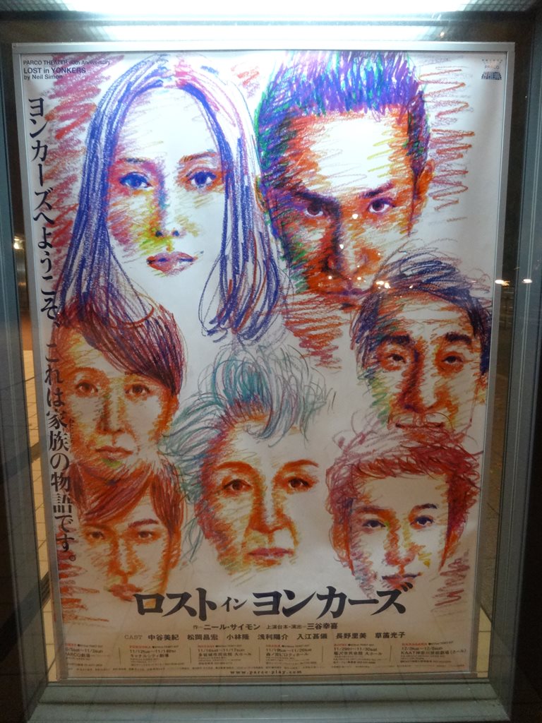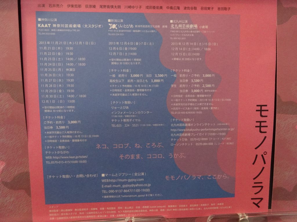 題名:ロスト・イン・ヨンカーズ 劇場:神奈川芸術劇場ホール 日時:2013年12月7日19:00-22:15(途中休憩あり) 料金:S席8000円 座席:3列21番(1階最前列センターブロックちょっとだけ右より) 作:ニール・サイモン 上演台本・演出:三谷幸喜 出演: 中谷美紀(ベラ) 松岡昌宏(ルイ) 小林隆(エディ) 浅利陽介(ジェイ) 入江甚儀(アーティ) 長野里美(ガート) 草笛光子(ミセス・カーニッツ) ヨンカーズのおばあちゃん(ミセスカーニッツ)の家で物語が 始まります。情けないお父さんはお母さんの看病のため高利貸 しまで金を借りる。子供たちをおばあちゃんちにおいて屑鉄 商売で南部を転々。 おばあちゃんはおばさんとふたりぐらし。おばさんはすぐに 物事を忘れてしまう、施設にはいる?ひと。 おばさんは人と一緒にいると興奮、やたらはいテンション。 おばあちゃんをやたら怖がるお父さん。 おばあちゃんが出たとたんに場の空気が一変、凄い場の支配力。 残念なおばさんをなんとかやりすごし、兄弟はここですめる ことになり、そして息苦しい生活を続けます。 旅に出ているお父さんもどこかへん。 ギャングの手下になっているおじさんがきて、どうもへん。 一難去ってまた一難(でも地味)な子供たち。 めっちゃくちゃキャラがたっていてうまいキャストばかり。 大笑いはしないのですが、くすくすとさせる場面の連続。 おばさんが出てくといってこどもたちの同居を主張した ときはほろり。 後半である台詞から主役がいれかわる。場を支配する者が かわるというか重厚な二人芝居になってしまう。とにかく 泣ける。中谷美紀怪演! コメディではなくいきざまがほとばしるというか。。 クライマックスの客席はすすり泣きばかり。 3時間15分が長く感じられない。良い物を見た。 PR 題名:恐竜戦隊キョウリュウジャーショーシリーズ第4弾「メッチャ進化!Gロッソdeカーニバル!!」<11月~1月 特別公演> 劇場:シアターGロッソ 日時:2013年12月7日10:50-11:30 料金:2300円 座席:E列26番 出演: 【特別公演(素顔の戦士)出演俳優 】 キョウリュウレッド / 桐生ダイゴ 役 竜星 涼 キョウリュウブラック/ イアン・ヨークランド 役 斉藤 秀翼 キョウリュウブルー / 有働 ノブハル 役 金城 大和 キョウリュウグリーン / 立風館ソウジ 役 塩野 瑛久 キョウリュウピンク /アミィ結月 役 今野 鮎莉 キョウリュウゴールド /空蝉丸 役 丸山 敦史 子供たちが客席に多く、家族連れがほとんど、その分 大きなお友達が少ないようです。 フライング少な目、なんかちょっとがんばりましょう。 素顔戦士の出番多し、客席後ろにまでたくさん行って くれてます。目の前をキャストが駆け抜けてました。 元々ダンスが主体のシリーズなので出番増やせるのかも。 ブレイブなダンスだからノリノリなシーンばかり。 白幕を手前につかっての変身がきれい。 ブレイブを集めるのも頑張れーが巨大文字となって現れる 素顔戦士を満喫できる演出でした。 題名:モモノパノラマ 劇場:KAAT神奈川芸術劇場大スタジオ 日時:2013年11月30日14:00-15:45 料金:前売3000円 座席:正面中央 劇団:マームとジプシー 作・演出: 藤田貴大 出演:石井亮介,伊東茄那、荻原綾、尾野島慎太朗、川崎ゆり子、成田亜佑美 中島広隆、波佐谷聡、召田実子、吉田聡子 舞台監督:森山香緒梨 音響:角田里枝 照明:富山貴之 衣装:高橋愛(suzuki takayuki) 宣伝美術:本橋若子 制作:林香菜 舞台は部屋の中央、四方を囲む客席。角材によるいくつかのフレームを マジックテープで縛って箱や壁に場面転換。フレームの中で物語は進みます。 生まれるたびに川に流している友達の家から貰ってきた猫。姉妹は些細なことで いつも取っ組み合い。家で出せるお菓子がイケてないので悩む子。小さな 子供の世界で悩み事は色々。遊びだったり、恋心だったり、、子供ってめんど くさい。だがそこで既視感が、、大人になって忘れている原風景がそこにあるのかも。 題名:歌舞伎座新開場柿葺落吉例顔見世大歌舞伎仮名手本忠臣蔵 劇場:歌舞伎座 日時:2013年11月18日16:30-20:50(途中休憩2回あり〉 料金:3階A席 6,000円 座席: 通し狂言 仮名手本忠臣蔵(かなでほんちゅうしんぐら) 五段目 山崎街道鉄砲渡しの場 同 二つ玉の場 六段目 与市兵衛内勘平腹切の場 早野勘平 菊五郎 女房おかる 時 蔵 母おかや 東 蔵 斧定九郎 松 緑 判人源六 團 蔵 千崎弥五郎 又五郎 一文字屋お才 魁 春 不破数右衛門 左團次 七段目 祇園一力茶屋の場 大星由良之助 吉右衛門 遊女おかる 福 助 富森助右衛門 松 江 大星力弥 鷹之資 鷺坂伴内 松之助 斧九太夫 橘三郎 竹森喜多八 歌 昇 赤垣源蔵 権十郎 寺岡平右衛門 梅 玉 ※ 十一段目 高家表門討入りの場 同 奥庭泉水の場 同 炭部屋本懐の場 大星由良之助 吉右衛門 小林平八郎 錦之助 竹森喜多八 歌 昇 小汐田又之丞 種之助 大鷲文吾 米 吉 倉橋伝助 廣 松 磯貝十郎左衛門 隼 人 大星力弥 鷹之資 勝田新左衛門 桂 三 村松三太夫 由次郎 原郷右衛門 歌 六 ※片岡仁左衛門休演につき、配役を変更しております みどころ 五段目 ◇歌舞伎ならではの様式