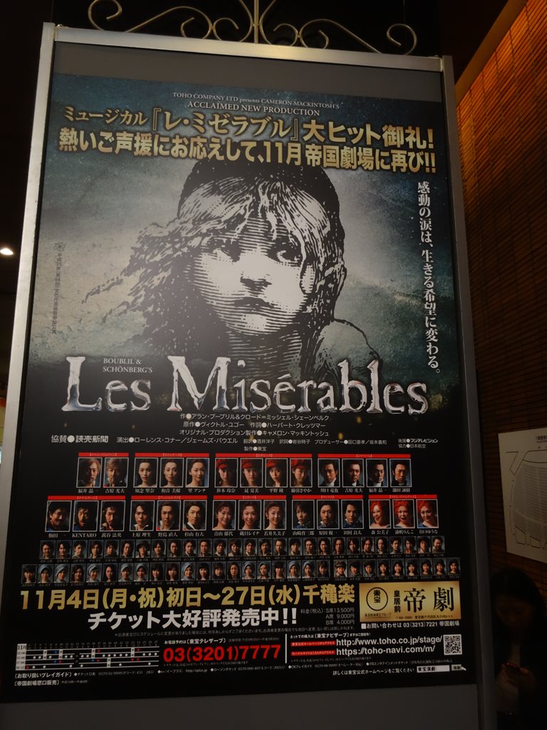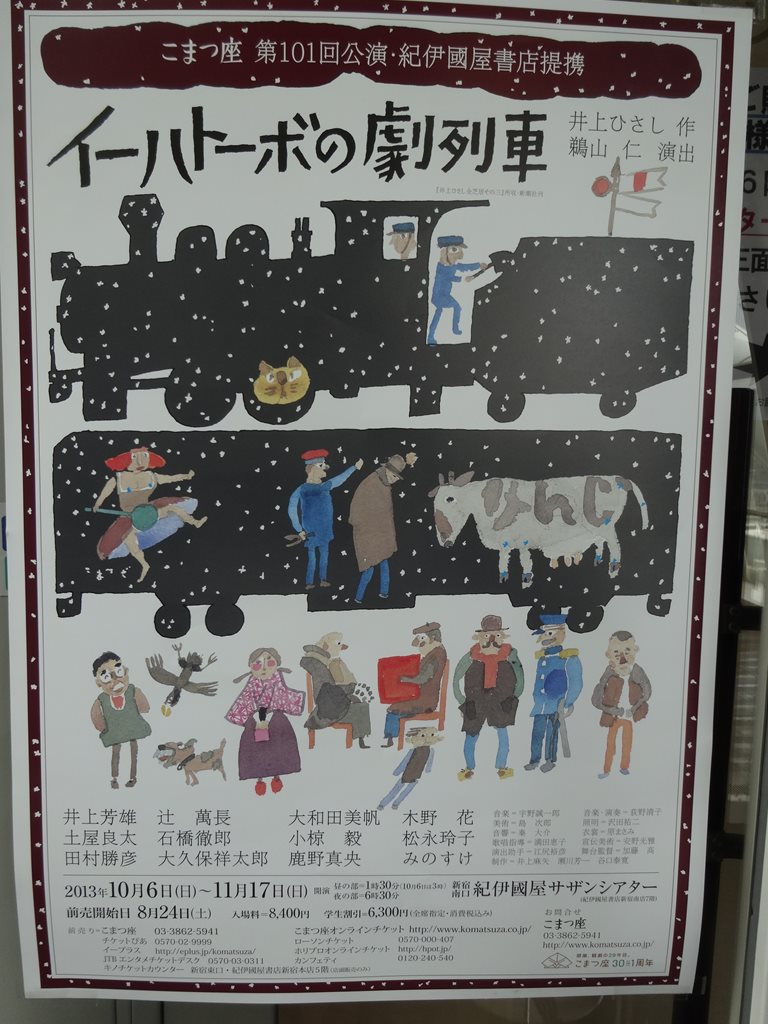 題名:レ・ミゼラブル 劇場:帝国劇場 日時:2013年11月5日18:15-21:20(途中休憩あり) 料金:S席13500円 座席:1階B列45番(2列目右端) URL:http://www.tohostage.com/lesmiserables/index.html http://www.youtube.com/watch?v=6aJ52iojgzY 出演: ジャン・バルジャン 福井晶一 ジャベール 川口竜也 エポニーヌ 綿引さやか ファンテーヌ 知念里奈 コゼット 青山郁代 マリウス 原田優一 テナルディエ 萬谷法英 マダム・テナルディエ 谷口ゆうな アンジョルラス 上原理生 司教 北川辰彦 工場長 石飛幸治 バマタボア 宇部洋之 グランテール 菊地まさはる フイイ 神田恭兵 コンブフェール 原慎一郎 クールフェラック 高舛裕一 ジョリ 川島大典 プルベール 杉野俊太郎 レーグル 持木悠 バベ 櫻井太郎 ブリジョン 森山大輔 クラクスー 土倉有貴 モンパルナス 西川大貴 ファクトリーガール 三森千愛 買入屋 般若愛実 かつら屋 三戸亜耶 マダム 吉川恭子 ガブローシュ 松井月杜 リトル・コゼット 近貞月乃 リトル・エポニーヌ 北川真衣 新演出の観劇2回目、2列目で見てるとオケの音が からだの芯に響きます。特に打楽器がじーんときます。 いかにも生演奏聞いていますといった風情(スピーカー再生 でも同じようになるんでしょうけどね) ほんとに皆初々しいねえ。 若者が元気で、若者の群像劇といった感。 テナルディエ夫妻まで若造にみえましたよw People's Song や One Day More は迫力満点。 アンジョルラスは声が通って若さゆえのアジテータ という雰囲気が良く出てます。マリウスはとことん 優男、コゼットはかわいい、エポニーヌはけなげ。 無謀でダメなバリケードもかなり真剣に悲惨に見えます。 女性アンサンブルが頑張っていてはじけてる。 前で見ているおかげで、そこらじゅうで小芝居をしていて マイクで拾われない声をだしているのがわかります。 みんな一生懸命だ。 バルジャンは朗々と歌い上げて、とんとんとんと テンポよく行く感じ。Bring Him Home とフィナーレ でぼろぼろ泣けました。バルジャンて幸せな最後だったの だなあと。新演出はツアーに出やすいように組み替えたの でしょうが、これはこれでありかなと思います。 ただあまりにアップテンポに進むのがちょっと気に なりました。予定より10分程度早く終了してましたよ。 残念だったのがジャベール、かなりガラガラ声で痛々しく 見えました。風邪でも引いたのでしょうか。早くよくなる ことをお祈りしておきます。 PR 題名:イーハトーボの劇列車 劇場:紀伊國屋サザンシアター 日時:2013年11月4日13:30-16:30(途中休憩あり) 料金:8400円 座席:2列11番(2列目中央) 作:井上ひさし 演出:鵜山仁 音楽:宇野誠一郎 音楽・演奏:荻野清子 出演: 宮沢賢治:井上芳雄 宮沢政次郎・伊藤儀一郎:辻萬長 宮沢イチ・未亡人:木野花 宮沢とし子・女車掌ネリ:大和田美帆 福地第一郎:石橋徹郎 福地ケイ子:松永玲子 山男:小椋毅 淵沢三十郎:土屋良太 神野仁吉:田村勝彦 売られた娘:鹿野真央 少年:大久保祥太郎 車掌:みのすけ ストーリー: 大正七(一九一八)年十二月二十六日、宮沢賢治は、故郷花巻から 東京に入院している妹・とし子の見舞いを目的に上野行きの夜行列 車に乗り込んだ。その手には大きな革のトランクが握りしめられ、 たくさんの願いが詰め込まれていた。 「大好きな音楽を聞き、エスペラント語の勉強をする。そのために は家の重圧から逃れ、父の庇護の下を離れなければならない。 そして何よりも真の生き方を探すことである」 賢治は、東京に理想郷を求めては挫折を繰り返し、九度の上京の中 でいつしか花巻に理想郷を見いだす。東京での出来事と上京する列 車の中で賢治の童話から抜け出たような人物たちと織りなす夢のよ うな時間が交差する。そして挫折の度に突然現れる背の高い、赤い 帽子の車掌から手渡される「思い残し切符」とは......。 井上ひさしが愛してやまない日本語に、不思議でかわいらしい、そ して輝くような魅力を付け加えてくれた、岩手花巻人である宮沢賢 治の評伝劇。文学、音楽、化学、農業、宗教、芸能など多岐にわた る才能を、虚弱ゆえ叶えることが出来なかった賢治。 この数々の大切なものを、鵜山仁の新演出で現代に問いかけます。 ミュージカルだけでなくストレートプレイでも高い評価を得ている 井上芳雄をはじめとする実力派の新キャスト陣を迎えて、十四年ぶ りに再演いたします。 -------- 舞台の真中に盆が鎮座していました。そして後方にはピアノ。 ピアノの伴奏がしばしばはいりました。盆が微妙に傾いてます。 最初は全員で語り。ああそういう芝居を見ているのだなーと。 場面は岩手花巻から上野行き列車。学生服で妹を見舞いに行く 賢治。ロードムービーかと思ったら、何度も東京と往復するの です。山男、マタギ、口入屋、、、出会いと再会。 家出した賢治を追いかけてきた父親と宗論で見事に負けて しまいます。浄土真宗vs法華宗なんですね。小気味よい言葉の 応酬に感心。 ユートピアを作ろうとするが、失敗。農民となると言っている が結局親のすね