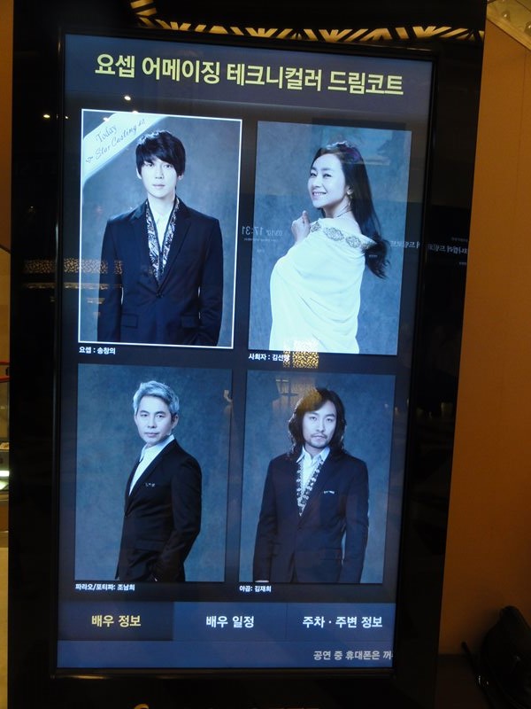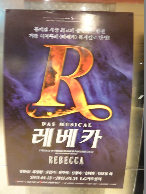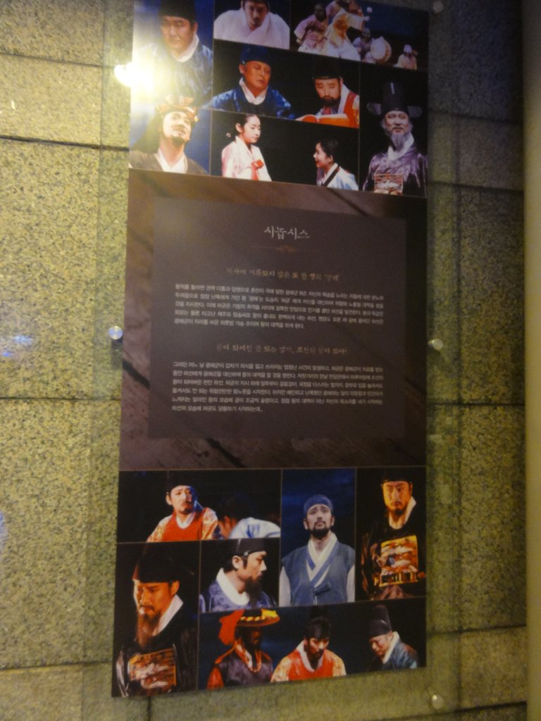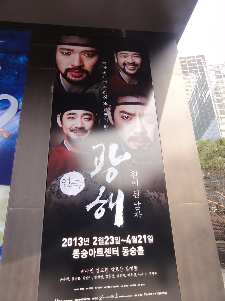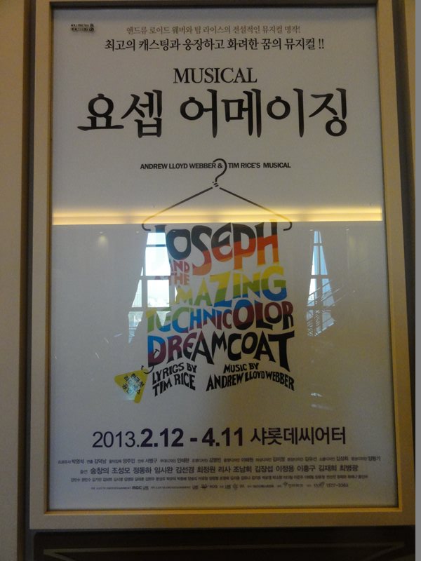 題名:ミュージカル「ヨセフ・アメージング・テクニカラー・ドリームコート」 (뮤지컬〈요셉 어메이징〉) 日時:2013年3月10日18:00-20:10(途中休憩あり) 劇場:シャルロッテシアター 料金:VIP 130000KRW 座席:1階Bエリア10列30番(センターブロック右端) ウェストエンドで見て以来、20年ぶりくらいのヨゼフです。記憶が、、 幕が三角形にあいて、椅子の上に赤と緑と黄金のコスチュームが かけられています。台形の背景で、その上にオーケストラ、 左右は階段、両側にヤシの木。 開幕時に小学生らしき子供たちが後ろから登場、先生についてヨセフ の物語を教わるのね。その先生がナレーター、このナレーターの おねえさんが随所で狂言回しとして登場、力強い歌です。 ヨセフはさわやかなイケメン、 ドリームコートを貰うくらいの父からの偏愛に、兄さんたちが嫉妬 して嫉妬して井戸に突き落とし!そして隊商に売り渡してしまいます。 ヨセフいなくなって万歳のダンスがはじけていていい。 とにかく元気なキャスト揃い。 ヨセフは富豪の奴隷として才覚をだしますが、今度は夫人のお誘いを 断って逆恨みされ不義密通の疑いで牢屋に。 ここでは夢見をといて、人気者! 1幕エンディングはサイケデリックな70年代ファッションのハイ テンション群舞で会場ももりあがり! テンポがよいジェットコースターストーリーで歌のみで物語が紡が れていきます 2幕は幕が開くとキンキラで巨大なファラオの仮面!両側に巨大な壁画。 オープニングはアンサンブルが鹿の?被り物!もうはではで。 そして出てくるファラオがとてもはじけていて楽しい。ヘロデ王の前身 かと思われ。。客への煽りもあってここだけのりが違うw 王さまに認められたヨセフもキンキラキンに! 飢饉の際にに兄弟たちは、ヨセフと知らずに食料を乞いにきます。 ヨセフは食料を渡す中に密かに黄金の杯をまぜておいて、兄弟を 泥棒の罪でとらえちゃいます。 最後は父親と再開して大団円。カーテンコールはまた激しいダンス。 ファラオがでてきた段階で客席は総立ち、ほんとに楽しいひと時でした。 題名:뮤지컬 레베카(REBECCA) 日時:2013年3月10日14:00-17:00(途中休憩あり) 劇場:LG아트센터(LGアートセンター) 料金:R席110000KRW 座席:1階8列27番(右側ブロックなかほど) 유준상 류정한 오만석 신영숙 옥주현 김보경 임혜영 최민철 에녹 이경미 최나래 이정화 박완 강민욱 선우재덕 정의갑 豪華なセットで重厚な舞台。ダンバース夫人は切り裂くような迫力、 でもレベッカの元女主人も圧巻、仮装舞踏会での独壇場はなかなかのもの。 映像を交えて場面転換を自在にみせていました。 中年層のキャストが強い。生オケもいいですねえ。 いずれも朗々と歌い上げるシーンばかり。そして私が弱くない。 ダンバース夫人に匹敵するパワーwマキシムもかっこいい。屋敷管理人もいいひと。 バカの兄ちゃんは切ない。窓のまわりはまるでメリー・ポピンズ。本物の水で雨、 本物の炎、それに前幕に映像、そして煙。 現在ソウルでかかっているミュージカルの中では群をぬいているのかも。 バランスが良い舞台だと思いましたよ。 ただレベッカ夫人のドレスがかわいくていまひとつ、もっと成熟した魅力 だとぴったりだと、。。 題名:(연극 광해, 왕이 된 남자)光海、王になった男 日時:2013年3月9日15:00-17:00 劇場:東崇アートセンター・東崇ホール 座席: 1階(B2) ナエリア2列 4(2列目センターブロック少し右寄り) 料金:R席50000KRW ドンスンアートセンターのボックスオフィスがビルの中に移転してい てちょっと戸惑いました。チケット購入控えをみせて無事チケットをゲット。 手数料安くてありがたい。 後方には空席がありました。とはいえ当日券にもそれなりの行列。 客層はちょっと若め。20−30代といったところ? 寺党による仮面劇が多数。寺党が最初に倒れてしまって完全に入れ替わり。。 奴婢がかわいい。皇后は美しい。最初と最後だけ本物国王役ですごくワイルド。 思いを吐き出すシーンあり、奴婢は毒殺されるかわりに国王かどわかしに 同席してやられてしまう。 戻ってきた国王が医者、宦官、大臣を皆殺しにしてしまう。。。 そして3年後、偽物は寺党でだるまさんが転んでいるしているところで殺される、、 結局首謀者は皆ころされてしまう、いかにもそうだろうという結末なんだけれど、 最後に偽国王が語るシーンがわからない。 最後は涙ながらに語っておりました。 題名: 特命戦隊ゴーバスターズショー第5弾 <2/16~3/10特別公演> 劇場:シアターGロッソ 日時:2013年3月3日10:50-11:30 料金:2300円 座席:C25番(3列目センターブロック) 素顔の戦士たちのショー、それなのに当日券ありという看板。 ゴーバスターズおもしろかったのになあ。最終的な入りでも後方はあいていた ようでした。でも大きなお友だちもちゃんと多数きていましたね。 さて開演前にひさびさに前説のおねえさん。 このおねえさん、スカイシアターの時にはいつも前説をしていたのですが、 Gロッソにうつってからは終演時
