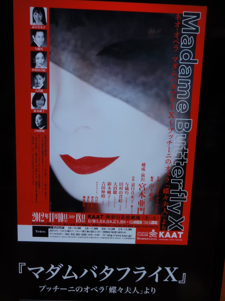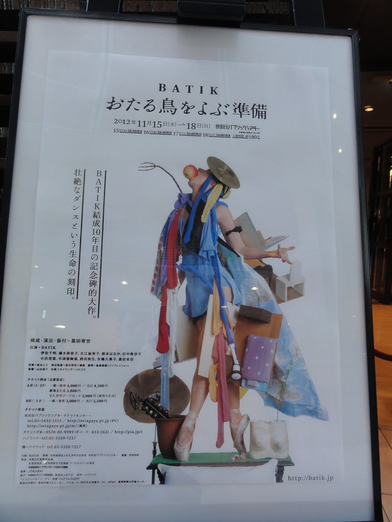 題名:おたる鳥をよぶ準備 日時:2012年11月18日14:00-17:00(途中休憩あり) 劇場:世田谷パブリックシアター 料金:A席4000円 座席:1階席G-014(センターブロック最前列) 劇団:BATIK 構成・演出・振付:黒田育世 音楽:松本じろ 出演:BATIK(伊佐千明/植木美奈子/大江麻美子/梶本はるか/田中美沙子/寺西理恵/中津留絢香/西田弥生/矢嶋久美子/黒田育世) 解説: 敷き縮めた原っぱで世界に返事をする 持ち寄った間取りに失った家族を抱き戻し放さない そのまま帰って人に返事をする たまらない空洞にできうる限りの花と天地と使命を活ける これまでの跡地に仲間を迎えてその跡地にこれからを飾る もう一度旅にでてまた出会う おたる鳥がついばむ死体の正面になる 揃った。 姿が消えても一番近くで寝起きするずっと踊りはびこる死んでも止めない 黒田育世 結成10周年を迎えるBATIK。 ダンスに全身全霊を捧げ続けてきた黒田育世が、自ら「死ぬ準備」だと語る 記念碑的大作を携え、愛知に初登場です!! 「おたる鳥」は、黒田による造語です。「満ち足りて体が自然に動き出すこと」 を「おたる」と言い、「おどる」の語源になったという説があります。世界で起き ている様々な出来事、その中で死んでいく人々、それらを見聞きしながらも 生きて踊る自分、そして私が死んだときにどこかでまた誰かが踊っているで あろうこと。原初的な生命の循環に思いを馳せ、踊り続ける10名の女性ダン サーたち。壮絶なダンスという生命の刻印をどうぞご覧ください。 ----------------------- 実はSPAC野外劇場で見る予定でした。ですが、当日は激しい雨で挫折 Orz 今度こそしっかりみるぞ!私が座ったのはG列、客席としては2列目なのですが F列はキャストが時々座って演技、というわけで実質1列目。 緑色の深い舞台、最前列の前まで緑です。 「私ダンサーになるの」と叫び続けるダンサーが開演前に舞台上に出現。 「あなたの願いをかなえてあげましょう」とくるくる。そしてその繰り返し。 舞台前方にはちっちゃなライトがずっとちかちか。。。四方に照明 快適なイスではあるものの、 やはり野外でみたかったなあと。。。 最前列なので、目の前の席で座って演技されることも、目の前で抱き合う! 舞台の上ではいろんなことがあったのでキーワードだけ。。 変な顔、人の叫び、ドラムカンからにょろっと、リンゴの木、 後ろの櫓でさけび、紙吹雪、ストッキングをつなげる、 ミラーボールでぐるぐる、コスチュームの満艦飾 公演後半は客を舞台の上に上がらせました。そして 今度はダンサーが演じる舞台が客席側につくられました。 いつもとは逆方向で鑑賞しているわけです。 かなりおもしろかったのですが、公演を見たというよりイベントに出会った と言った風情。ああ野外劇場で見たかった。 PR 題名:Woman In Tap presents 『Woman In Music ver3』 劇場:KAAT神奈川芸術劇場大スタジオ 日時:2012年11月17日17:30-19:00 料金:3000円 座席:1階16列左端ブロック通路側 劇団:Woman In Tap 出演: [TAP]谷口翔有子/kuriko/Akkin/菅谷藍子/MaNaMi/utaco/水里/堀田美冴 [Piano]山本光恵 [Percussion]山下由紀子 [Dance]HARMY 音楽制作:山本光恵 Design/Photo/空間演出:MIWAKATOH OP映像:goro ushijima a.k.a GAULOISeS 照明:阿部将之 (LICKT-ER) 音響:水野裕 舞台監督:森脇洋平 制作/PR:上原聴子 総合演出・企画/Artistic Director:谷口翔有子 番組 OP Why M1 Beginning M2 Alone M3 Drops M4 Yamanote M5 Joy M6 Rhythm M7 Air M8 Life M9 Bolero M10 Here M11 祈り たまたま出会ったタップの舞台。マダムバタフライXの隣の スタジオ上演されていました。女性だけのタップ集団で、 華やか。皆楽しそうに演じているのが客席にまで伝わって きました。機会があればまたいつか見たい。 ただ、やはりタップだけで普通の客を飽きさせないように するのはなかなか。。 題名:第19回神奈川国際芸術フェスティバル「マダムバタフライX」プッチーニのオペラ「蝶々夫人」より 劇場:神奈川芸術劇場ホール 日時:2012年11月17日15:00-17:15(途中休憩あり) 料金:S席8500円(招待券) 座席:2階席A2-16番(2列目センターブロック) 出演: ▼歌手キャスト 蝶々夫人:嘉目真木子(ソプラノ) ピンカートン:与儀巧(テノール) スズキ:田村由貴絵(メゾソプラノ) シャープレス:大沼徹(バリトン) ケイト:鈴木純子(ソプラノ) ゴロー:吉田伸昭 (テノール) ▼アクターキャスト 内田淳子 神農直隆 兼松若人 柳橋朋典 池袋遥輝(子役) ▼演奏キャスト ピアノ/小林隆一、八木淳太 ヴァイオリン/吉田翔平 トロンボーン/山城純子 パーカッション/藤井珠緒 作曲/ジャコモ・プッチーニ 編曲/山下康介 構成・演出/宮本亜門 美術/伊藤雅子 照明/橋野明智 映像/栗山聡之 映像制作/泰永優子 衣裳/山下和美 ヘアメイク/川端富生 稽古ピアノ/瀧田亮子、古瀬安子、高木由雅、田島葉子 副指揮/小崎雅弘 演出助手/澤田康子、安尾絵美 舞台監督/安田武司(KAAT) 緑色の舞台、上方には大きなスクリーン、舞台の左にはオケ、右側には スタッフ控え室のようなもの。劇中劇としてオペラが演じられるのでした。 エンジェルに対してプレゼンをするため
