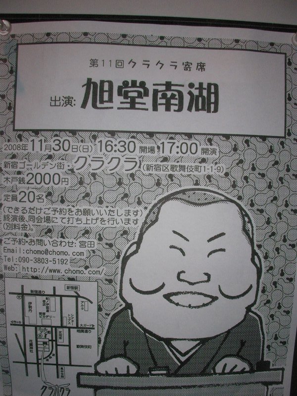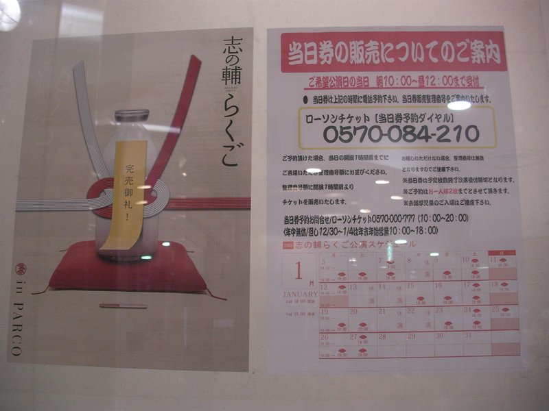 × [PR]上記の広告は3ヶ月以上新規記事投稿のないブログに表示されています。新しい記事を書く事で広告が消えます。 題名:志の輔らくご in PARCO 2009 日時:2009年1月10日19:00-21:45(途中休憩あり) 劇場:PARCO 劇場 座席:E列中央 番組: ハナコ 狂言長屋 柳田格之進 久々の志の輔師匠の高座です。パルコで聞くのも初めて。 しかもすべて聞いたことのない噺ばかり。写真はロビーに掲げられていたのれん。 柳田格之進は聞いていてもよさそうなものなのですが、どういうわけか今まで出会いがありません でした。 ひとつめは「ハナコ」。すべてのことをオープンに、情報公開に関する昨今の風潮に斜め横から挑戦。 黒毛和牛の焼き肉食べ放題がウリの旅館では、従業員が「あらかじめ」と言って、何から何まで説明 してくれる。そのおかげで内風呂で一風呂浴びるのも源泉まで連れて行かれる始末。情報公開に関す る手間を考えないとどんな頭痛い状況が発生するのか、を見せつけてくれます。ところで食肉用の牛 が生きている状態で見せられたら食べられなくなるものなのでしょうか?生け簀の魚も同じだと思う のだけどなあ。 2席目は、PARCO公演では恒例らしい「狂言長屋」。噺の途中で狂言の舞台が出てきて、噺中能 が展開されます。御前狂言のネタが浮かばず自殺しようとする狂言師に、長屋の住人たちが、「無情」 (を感じて死のうとする武士の話)のおもしろい話を作らせるため、「死にてぃよう」と思った時の 話をかわるがわる聞かせます。この話がまずおもしろい。彼らの馬鹿話からヒントを得た狂言師が作っ た物語が劇中能として演じられるのです。ここで能舞台が出てきて、本職の狂言師と志の輔師匠との 競演となります。演じきった後はするすると座布団が出てきて再度噺へ、後日談へとつながります。 最後は柳田格之進。キャラがとてもたっていて、まるで一人芝居をみているかのよう。 格之進がめちゃくちゃかっこいい。また娘が気丈でちょっと恐ろしささえ感じます。 番頭と格之進の再会シーンなど緻密で素晴らしい描写で目の前に光景が浮かびましたよ。 最後、格之進の娘の言葉に皆が救われるとい後味のよい終わり方。このまま歌舞伎になりますね。 ひとりで前座からトリまで、いやあお疲れさまでした。 PR 題名:第11回『クラクラ寄席』 旭堂南湖 日時:2008年11月30日17:00-18:30 劇場:新宿ゴールデン街クラクラ 料金:2000円 座席:最前列右端(ちなみに最後列は4列) 番組: 旭堂南湖 浪花侠客伝 木津勘助 赤穂刃傷~矢頭右衛門七 観客は20名弱、まあまあの入りでした。南湖産を聞くのは初めて。 最初は良い人木津勘助が世の中のためになることをしていくという物語。 とんとん拍子で話が進んでいくのは小気味良い。 矢頭右衛門七って知りませんでした。赤穂浪士の中で2番目に若い奴なんですね。 枕で平成中村座忠臣蔵の感想をふって殿中から討ち入りまで。1時間にわたる長講 でしたが、だれ場もなく聞けました。これでも多少はしょったそうですから、 フルバージョンだとどれだけの長さなんでしょう? 私も平成中村座忠臣蔵Aパターン見てたので、松の廊下が目に浮かびました。 ところで、浅野内匠頭の家来が吉良へ渡すはずの賄賂を横取りしたという顛末は 初めて聞いたのですが、こういう説あるんですか?まあ講釈なんで突っ込むのも 野暮というものなのですが、気になって。。 それと賄賂を贈るときの定番の砂糖漬けの名前が思い出せなくて夜も眠れません。 だれかへるぷみー。 かなーりたっぷり講釈を聞いた気分になれるお得な会でした。 会のあとはそのままクラクラで打ち上げ。 題名:ナゲツナゲ ~太神楽若手の会~ 日時:2008年10月16日19:00-20:50(中入りあり) 劇場:なかの芸能小劇場 料金:前売り1800円 座席:劇場中央 番組:(記憶で書いているので順番はあやふやです) 獅子舞 仙志郎 太神楽解説 小花 五階茶碗 仙花 松田聖子 正二郎 祇園鞠、曲独楽 王楽 落語「読書の時間」 和助、仙志郎 茶番「曽我兄弟より大磯郭通い」 和助 咥え撥土瓶の曲 勝丸 花籠鞠 仙志郎、小花 ジャグリング 小花 皿回し 全員 傘回し 6割程度の入り、広報をもっとすれば客はいると思うんですけどねえ。 おめでたい獅子舞はたっぷり13分、こういうバージョン見るの初めてです。 五階茶碗は非常にテンポよくすすみました。 そのあとはびっくり!きらきら水色ドレスを着た仙花さんが、青い珊瑚礁! を歌うかと思いきや、PAでイントロだけがくりかえされて歌いだせません。 ギャグやらなくてもその衣装だけでインパクトありすぎw 正二郎さんの祇園鞠を見るのはたしか二度目、続飯付けが止まって見えて きれいです。扇を指先で持って、掌、手の甲、扇を少し開いてその中、 扇を全部開いて何箇所か、とまるで吸い付いて離れません。扇を閉じて 1up2up(日本語でなんていうだっけ?)、あい払い(ウィーブ)、 操りの鞠(コラムの上で扇を振る)といきました。 「読書の時間」ははじめて聞いた新作です。桂三枝師匠作なのですね。 おとう