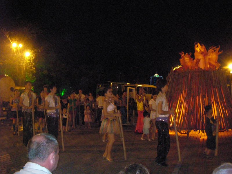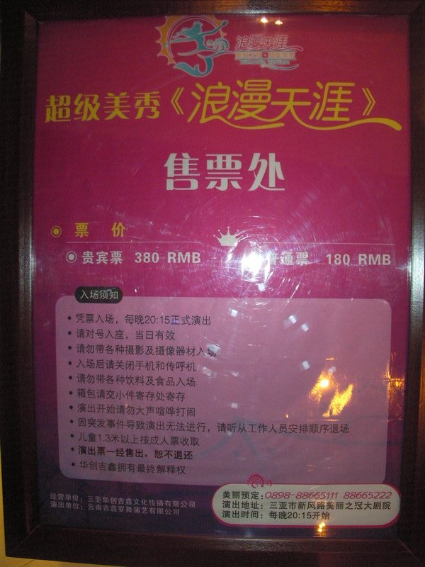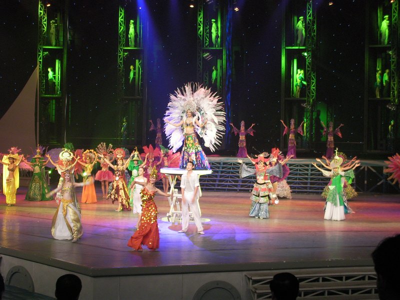 × [PR]上記の広告は3ヶ月以上新規記事投稿のないブログに表示されています。新しい記事を書く事で広告が消えます。 題名:浪漫天涯 日時:2009年5月3日20:30-21:45 劇場:美麗之冠(三亜、海南島) 料金:ホテルからの往復込みツアー4000JPY(たぶん180元の席) 座席:7列8番(客席まんなか付近) 20時頃には劇場前広場で少数民族のショーがなされていました。このショーも定期的(毎日?) に演じられているもののようです。焚き火を模した照明の周りで盆踊り?竹を持ってたたき ながら回ります。それからバンブーダンス、いろんなリズムがあるものです。客の飛び入りも あり、私もうずうずだったのですがどうすればいいかわからないとなかなか出れませんねえ。 さて劇場の中にはいりました。うーんなんだか不思議な劇場。元々ミスユニバースコンテスト 会場としてできた建物なのですが、扇形の客席にかなり広い舞台、舞台の前面は微妙にカーブ。 バックスクリーンと左右に映像。場面が変わるたびにその場面タイトルがでていました。 タイトルは4ヶ国語で出ます。中国語、英語、ロシア語、にあとなんだろう? 客席は約3割程度の入り、前方中央にVIP席。アイスなどの売店はあるのですが、このショーの プログラムやDVDなどの土産物を売っているお店がありません。商業の国中国としてはちょっと ありえない感じです。 オープニングは、海底の踊り。魚や海草やヒトデがでてきます。そのシチュエーションのまま、 海の中での軟体、それからティッシュー、と続きます。舞台にはとにかくたくさん人が登場 してきます。ダンスとファッションショーのあいだに雑技が少し出てきました。 椅子の積み上げ芸はピンの芸人さんがきれいにまとめてみせてくれました。 それからBig Fly Wheel(他のところではWheel of Death という名前で演じられているもの) は見事でした。回転する支柱が三又になっておりその先に人が入れる筒がついています。 天井ぎりぎりまであるその大道具がぐるぐる回っている最中に筒の内と外で演技をするのです。 ぐるぐる回っている筒の外を走り、そしてジャンプ!バチのジャグリング、そして縄跳び! 最近この出し物に良くであっている気がします。迫力満点なところが受けるのでしょう。 繰り返されるファッションショー、少数民族舞踊もいくつか、バレエと民族舞踊がまざった ようなものもありました。外で演じていたバンブーダンスも少しだけ。 うーん、リトルマーメイドとライオンキングを足してアイーダをフレーバーに、シルクド ソレイユからインスパイアされた演出を組み合わせて10で割ったような雰囲気でしたよ。 たしかに美女たちがすごく大人数がでてきますし、ダンスがたしかにできる者もいるのです が、舞台の端の方ではやるきなしの雰囲気が漂っています。振付ががんばりましょうなの? 海南島にきて他にすることがなければ見に行ってもいいと思います。 PR 題名:侍戦隊シンケンジャー シリーズ第1弾「侍戦隊シンケンジャー!シアターGロッソに見参!!」 日時:2009年4月25日10:30-11:05 劇場:シアターGロッソ(東京ドームシティ アトラクションズ内ジオポリス) 料金:1500円 座席:B列8番(2列目左ブロック通路際) 今日からジオポリスオープンです。初日とあって関係者の名札を下げてスーツ姿のおじさん が随所に見られました。10時開場、10時半開演。今回から座席指定なので早く来る必要は ないのですが、それでも開場前に40-50人は並んでいたでしょうか。あいにくの雨にも かかわらず皆さん元気です。劇場隣にはシンケンジャーなりきりフォトスタジオや プリクラなどがオープンしていました。 10時になって開場すると歓声が、お約束のシンケンレッドと握手!の隣に黒子が控えている! いい感じですねえ。レッドと握手して記念撮影をする人が多く、入場の行列はなかなか すすみません。一時は建物の外に出て、それからまだまだ続く長蛇の列になってました。 それでも開演時間前に客いれちゃんと終わるから、優秀ですよね、スタッフさん。 劇場内は非常に急な客席になっており、どこに座ってもそれなりにちゃんと見れそうです。 最前列が地下一階、最後列が地上階に対応しておりました。地下一階といってもかなーり 深いのです。私が座ったのは2列目で、舞台まであとちょっと。通常の劇場より遥かに高い 幕が目の前にありました。 写真は客席後方から見下ろす形で撮ったものですが、角度がまるで 感じられない写り方になってますね。 開演になるとまず館内放送で、携帯や撮影禁止などのアナウンスがありました。今までは ナレーターが舞台にあがっていっていたところです。それに撮影禁止?スカイシアターでは 素顔の戦士がでなければ撮影可だったのに。。まあ通常の劇場なのでストロボたかれたら 困るというのはわかります。なんかちょっと違和感がでたところで幕が開きました。 すると上方にスクリーンが出てきて、素顔の戦士たちによるお祝いのメッセージ。 オープンの味わいですよ